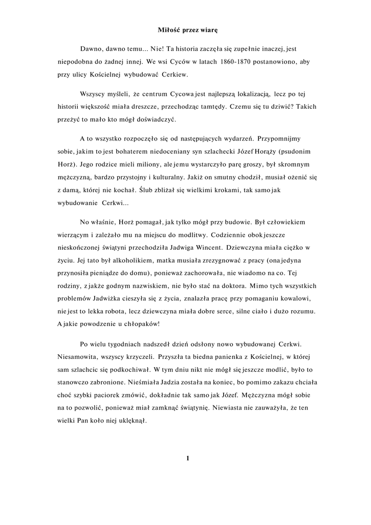 Miłość przez wiarę Dawno, dawno temu... Nie! Ta historia zaczęła się zupełnie inaczej, jest niepodobna do żadnej innej. We wsi Cyców w latach 1860-1870 postanowiono, aby przy ulicy Kościelnej wybudować Cerkiew. Wszyscy myśleli, że centrum Cycowa jest najlepszą lokalizacją, lecz po tej historii większość miała dreszcze, przechodząc tamtędy. Czemu się tu dziwić? Takich przeżyć to mało kto mógł doświadczyć. A to wszystko rozpoczęło się od następujących wydarzeń. Przypomnijmy sobie, jakim to jest bohaterem niedoceniany syn szlachecki Józef Horąży (psudonim Horż). Jego rodzice mieli miliony, ale jemu wystarczyło parę groszy, był skromnym mężczyzną, bardzo przystojny i kulturalny. Jakiż on smutny chodził, musiał ożenić się z damą, której nie kochał. Ślub zbliżał się wielkimi krokami, tak samo jak wybudowanie Cerkwi... No właśnie, Horż pomagał, jak tylko mógł przy budowie. Był człowiekiem wierzącym i zależało mu na miejscu do modlitwy. Codziennie obok jeszcze nieskończonej świątyni przechodziła Jadwiga Wincent. Dziewczyna miała ciężko w życiu. Jej tato był alkoholikiem, matka musiała zrezygnować z pracy (ona jedyna przynosiła pieniądze do domu), ponieważ zachorowała, nie wiadomo na co. Tej rodziny, z jakże godnym nazwiskiem, nie było stać na doktora. Mimo tych wszystkich problemów Jadwiżka cieszyła się z życia, znalazła pracę przy pomaganiu kowalowi, nie jest to lekka robota, lecz dziewczyna miała dobre serce, silne ciało i dużo rozumu. A jakie powodzenie u chłopaków! Po wielu tygodniach nadszedł dzień odsłony nowo wybudowanej Cerkwi. Niesamowita, wszyscy krzyczeli. Przyszła ta biedna panienka z Kościelnej, w której sam szlachcic się podkochiwał. W tym dniu nikt nie mógł się jeszcze modlić, było to stanowczo zabronione. Nieśmiała Jadzia została na koniec, bo pomimo zakazu chciała choć szybki paciorek zmówić, dokładnie tak samo jak Józef. Mężczyzna mógł sobie na to pozwolić, ponieważ miał zamknąć świątynię. Niewiasta nie zauważyła, że ten wielki Pan koło niej uklęknął. 1 -Panno Wincent, czemu Pani się modli wbrew zasadom?-zapytał z odwagą Józef. -Przepraszam, proszę o dyskrecję. Mam pewne problemy i myślałam, że przyjście do świętego budynku mi pomoże-odpowiedziała Jadzia. -No dobrze, lecz będę musiał Panienkę odprowadzić, gdyż w nocy jest niebezpiecznie. -W centrum Cycowa jest bezpiecznie, poradzę sobie, poza tym, pan ma chyba narzeczoną. -Spacer jeszcze nikomu nie zaszko... -Józef nie skończył swojej wypowiedzi, ponieważ jakiś dziwny odgłos mu to przerwał. Jadwiga była prerażona i chciała uciec, ale okazało się, że drzwi były zamknięte. Józio stał nieruchomy. -No co tak stoisz? Może byś mi pomógł!-wykrzyknęła dziewczyna. -Aa... Tak, gdzieś tu był klucz-odpowiedział zakłopotany chłopak. -Horży uważaj, za tobą!-zmartwiona Jadwiżka powtarzała te słowa kilka razy. Za Józefem... stał, a raczej fruwał jakiś duch. Ani jedno, ani drugie nie mogło zrozumieć języka tej istoty, więc ten zostawił napis na ścianie OPUŚĆCIE TO MIEJSCE LUB CAŁY CYCÓW BĘDZIE ZNISZCZONY. Tej dwójce udało się • w końcu otworzyć drzwi i uciec. Następnego dnia wszyscy się o tym dowiedzieli i nikt nie zbliżał się do cerkwi. Zaś Jadźce i Józkowi zależało na wyjaśnieniu tej sprawy. Po paru dniach zrozumieli, że bardzo się lubią. W zachrystii znaleźli Pismo Święte, którego wcześniej tam nie było. Przejrzeli całą księgę i natknęli się na obraz św. Michała Archanioła, byli bardzo zdziwieni. Pewnego wieczoru szukali różnych dokumentów w cerkwi i po raz kolejny zjawił się duch. Był bardzo zły i swą mocą podniósł Jadwigę w górę. Zakłopotany Józef wziął szklankę z wodą i wylał na tę zjawę, myślał, że to pomoże, lecz takie zachowanie rozwścieczyło tylko stwora. Zaczął rzucać przedmiotami w chłopaka, rozbijać wszystko, aż w końcu znikł na 5, góra 10 minut. Wrócił spokojny. Nagle Józef wylądował na suficie i spadł, rozbił głowę, ale się nie poddał. Zobaczył jakiś złoty kamyczek, wydawało mu się, że to pierścionek. Podskoczył z krzesła złapał 2 » m złoto. A wtedy, nie uwierzycie, duch znikł. Jadzia powróciła na ziemię i podziękowała Józkowi. -Och, dziękuję Ci, Panie! -Nie ma za co księżniczko-powiedział księżniczko, bo ona mu bardziej pasowała na następczynię tronu, niż jego narzeczona Teresa. -Józefie, ja jestem zwykłą biedaczką.-wyszeptała Jadzia. -Nieprawda. Ty jesteś moją przyszłą żoną. Jadwigo, czy wyjdziesz za mnie?-zapytał się uśmiechnięty Józef. -Nie mogę.-odpowiedziała zakłopotana Jadwiga.-Ty bierzesz jutro ślub. -No właśnie biorę, z tobą. Dwa dni temu zerwałem zaręczyny z Teresą. -Ale czemu? -Bo ciebie kocham, to ty mi dałaś szczęście, w końcu się uśmiecham. Zaskoczona Jadwiga rzuciła się na szyję Józefowi i wyszeptała, że też go kocha i pragnie, aby zostać jego żoną. Po ślubie tej jakże wspaniałej dwójki oddnowiono trochę cerkiew, a jakieś 50 lat później to miejsce stało się kościołem rzymskokatolickim p.w. Opieki św. Józefa w Cycowie. Świątynia nie była duża, miała niskie okna, ale była murowana. Kiedyś bardzo piękne miejsce. Naprzeciwko niego jest usytuowana kaplica NMP z 1862 r. To cudowna okolica. 3