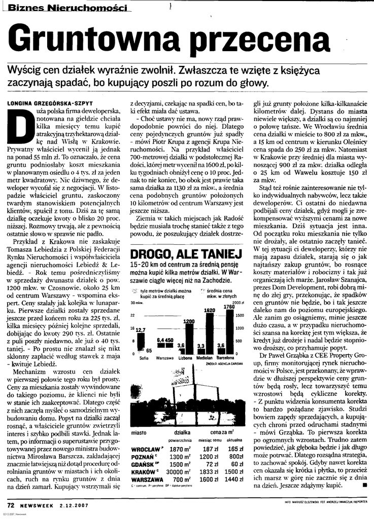 Biznes Nieruchomości Gruntowna przecena Wyścig cen działek wyraźnie zwolnił. Zwłaszcza te wzięte wzięte z księżyca zaczynają spadać, bo kupujący poszli po rozum do głowy. LONGINA GRZEGÓRSKA-SZPYT uża polska firma deweloperska, notowana na giełdzie chciała kilka miesięcy temu kupić atrakcyjną trzyhektarową działkę nad Wisłą w Krakowie. Prywatny właściciel wycenił ją jednak na ponad 55 min zł. To oznaczało, że cena gruntu podniosłaby koszt mieszkania w planowanym osiedlu o 4 tyś. zł za jeden metr kwadratowy. Nic dziwnego, że deweloper wycofał się z negocjacji. W listopadzie właściciel gruntu, zaskoczony twardym stanowiskiem potencjalnych klientów, spuścił z tonu. Dziś za tę samą działkę oczekuje kwoty o blisko 20 proc. niższej. Rozmowy trwają, ale z pewnością ostatnie słowo w sprawie nie padło. Przykład z Krakowa nie zaskakuje Tomasza Lebiedzia z Polskiej Federacji Rynku Nieruchomości i współwłaściciela agencji nieruchomości Lebiedź & Lebiedź. - Rok temu pośredniczyliśmy w sprzedaży dwunastu działek o pow. 1200 mkw. w Czosnowie, około 25 km od centrum Warszawy - wspomina ekspert. Ceny szalały jak kolejka w lunaparku. Pierwsze działki zostały sprzedane jeszcze przed końcem roku za 225 tyś. zł, kilka miesięcy później kolejne sprzedali, dobijając do kwoty 290 tyś. zł. Ostatnie z puli poszły niedawno, ale już o 40 tyś. taniej. - Po prostu nie znalazł się nikt skłonny zapłacić według stawek z maja - kwituje Lebiedź. Mechanizm wzrostu cen działek w pierwszej połowie tego roku był prosty. Ceny za mieszkania zostały wywindowane do takiego poziomu, że klienci nie byli w stanie ich zaakceptować. Dlatego część z nich zaczęła myśleć o samodzielnym wybudowaniu domu. Popyt na działki zaczął rosnąć, a właściciele gruntów zwietrzyli interes i szybko podbili stawki. Jednak latem, po informacji o superustawie przygotowywanej przez nowego ministra budownictwa Mirosława Barszcza, zakładającej znacznie łatwiejszą niż dotąd procedurę odrolniania gruntów w miastach i ich okolicach, ruch na rynku gruntów z dnia na dzień zamarł. Kupujący wstrzymali się D 72 NEWSWEEK 2.12.2007 z decyzjami, czekając na spadki cen, bo taki efekt miała dać ustawa. - Choć ustawy nie ma, nowy rząd prawdopodobnie powróci do niej. Dlatego ceny pojedynczych gruntów już spadł}' - mówi Piotr Krupa z agencji Krupa Nieruchomości. Na przykład właściciel 700-metrowej działki w podstołecznej Radości, której metr wycenił na 1600 zł, po kilku tygodniach obniżył cenę o 10 proc. Jednak to nie koniec, bo obok jest prawie taka sama działka za 1130 zł za mkw., a średnia cena podobnych gruntów położonych 10 kilometrów od centrum Warszawyjest jeszcze niższa. Ziemia w takich miejscach jak Radość będzie musiała trochę stanieć także z tego powodu, że poszukujący działek dostrze- DROGO, ALE TANIEJ 15-20 km od centrum za średnią pensję można kupić kilka metrów działki. W Warszawie ciągle więcej niż na Zachodzie. '•y. tyle metrów działki można kupić za średnią płacę średnia cena mkw. w złotych 30 mkw. O Sofia Warszawa * l Lizbona Mediolan Barcelona ŹRÓDŁO: AGENCJA CAHISMA •«*blj miasto działka powierzchnia WROCŁAW" 1870 m' POZNAŃ c 1300 m2 GDAŃSK " 1500 m2 KRAKÓW c 30000 m2 WARSZAWA 700 m2 C - centrum. ?'- peryferie; DP ; daiekie peryferie cenaza m miesiąc temu aktualna 187 zl 165 zl 1200 zł 800zl 72 zl 60 zl 1833 zl 1500 zl 1600 zt 1440 zl gli już grunty położone kilka-kilkanaście kilometrów dalej. Dystans do miasta niewiele większy, a działki są co najmniej o połowę tańsze. We Wrocławiu średnia cena działki w mieście to 800 zł za mkw., a 15 km od centrum w kierunku Oleśnicy cena spada do 250 zł za mkw. Natomiast w Krakowie przy średniej dla miasta wynoszącej 900 zł za mkw. działka odległa o 25 km od Wawelu kosztuje 150 zł za mkw. Stąd też rośnie zainteresowanie nie tylko indywidualnych nabywców, lecz także deweloperów. Ci ostatni do niedawna podbijali ceny działek, gdyż mogli je zrekompensować wyższymi cenami za nowe mieszkania. Dziś sytuacja jest inna. Od początku roku mieszkania nie tylko nie drożały, ale ostatnio zaczęły tanieć. W tej sytuacji ci deweloperzy, którzy nie mają zapasu działek, starają się o jak najtańszy zakup gruntów, bo rosnące koszty materiałów i robocizny i tak już organiczają ich marże. Jarosław Szanajca, prezes Dom Development, robi dobrą minę do złej gry, przekonując, że spadków cen gruntów nie będzie, bo i tak jeszcze daleko nam do poziomu europejskiego. Ale zanim go osiągniemy, minie jeszcze dużo czasu, a w przypadku nieruchomości szansa na korektę jest tym większa, że kredyt już drożeje i nadal będzie stopniowo droższy, co przyhamuje popyt. Dr Paweł Grząbka z CEE Property Group, firmy monitorującej rynek nieruchomości w Polsce, jest przekonany, że wprawdzie w dłuższej perspektywie ceny gruntów będą rosły, lecz towarzyszyć temu wzrostowi będą cykliczne korekty. - Z punktu widzenia konsumenta korekta to bardzo pożądane zjawisko. Studzi bowiem zapędy sprzedających, a kupujących chroni przed odruchami stadnymi - mówi Grząbka. To pierwsza korekta po ogromnych wzrostach. Trudno zatem powiedzieć, jak głęboka będzie i jak długo może potrwać. Dlatego rozsądna strategia, to zachować spokój. Gdyby naw^et korekta cen okazała się krótka i płytka, to przecież ich marsz w górę nie zacznie się z dnia na dzień. Jeszcze zdążymy kupić. • INFO MARIUSZ OLSZEWSKI FOT ANDRZEJ IWANCZUK/REPORTEH