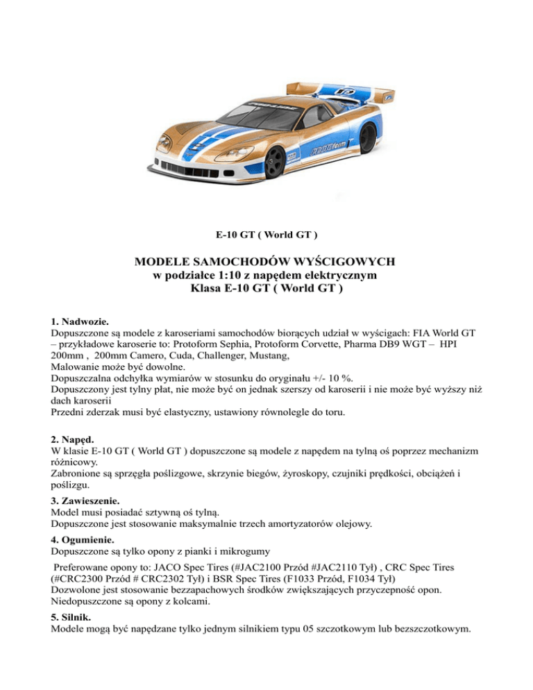 E-10 GT ( World GT ) MODELE SAMOCHODÓW WYŚCIGOWYCH w podziałce 1:10 z napędem elektrycznym Klasa E-10 GT ( World GT ) 1. Nadwozie. Dopuszczone są modele z karoseriami samochodów biorących udział w wyścigach: FIA World GT – przykładowe karoserie to: Protoform Sephia, Protoform Corvette, Pharma DB9 WGT – HPI 200mm , 200mm Camero, Cuda, Challenger, Mustang, Malowanie może być dowolne. Dopuszczalna odchyłka wymiarów w stosunku do oryginału +/- 10 %. Dopuszczony jest tylny płat, nie może być on jednak szerszy od karoserii i nie może być wyższy niż dach karoserii Przedni zderzak musi być elastyczny, ustawiony równolegle do toru. 2. Napęd. W klasie E-10 GT ( World GT ) dopuszczone są modele z napędem na tylną oś poprzez mechanizm różnicowy. Zabronione są sprzęgła poślizgowe, skrzynie biegów, żyroskopy, czujniki prędkości, obciążeń i poślizgu. 3. Zawieszenie. Model musi posiadać sztywną oś tylną. Dopuszczone jest stosowanie maksymalnie trzech amortyzatorów olejowy. 4. Ogumienie. Dopuszczone są tylko opony z pianki i mikrogumy Preferowane opony to: JACO Spec Tires (#JAC2100 Przód #JAC2110 Tył) , CRC Spec Tires (#CRC2300 Przód # CRC2302 Tył) i BSR Spec Tires (F1033 Przód, F1034 Tył) Dozwolone jest stosowanie bezzapachowych środków zwiększających przyczepność opon. Niedopuszczone są opony z kolcami. 5. Silnik. Modele mogą być napędzane tylko jednym silnikiem typu 05 szczotkowym lub bezszczotkowym. Silnik szczotkowy typu 540 - Carson Cup Machine (nr katalogowy CA-906052). Silnik bezszczotkowy (sensorowy lub bezsensorowy) musi posiadać następujące parametry: - średnica silnika maksymalnie 36,02 mm, długość max. 53 mm (z wyłączeniem osi), - uzwojenie typu Y (gwiazda) minimum 17,5 zwojów, - wymiary magnesu wirnika: długość 23,0-27,0 mm, średnica 12,0-15,5 mm, - silnik musi posiadać fabryczne oznakowanie liczby zwojów na obudowie. 6. Akumulatory. Dopuszcza się stosowanie akumulatorów: - LiPo 2S (w twardej obudowie) o maksymalnym napięciu nominalnym 7,4 V - LiFe o maksymalnym napięciu nominalnym 6.6 V - maksymalnie 6 cel NiCd lub NiMH SUB-C ogniw o napięciu nominalnym 7,2 V Niedopuszczalna jest wymiana akumulatorów podczas biegu. Dodatkowe wymagania dotyczące akumulatorów LiPo 2S1P/2S2P: - pakiet zamknięty w sztywnej obudowie z ABS lub podobnego materiału, - oryginalna etykieta z nominalnymi wartościami napięcia i pojemności oraz logo/nazwa producenta, - przewody o przekroju odpowiednim do dopuszczalnego prądu rozładowania lub oryginalne wewnętrzne piny, - maksymalne napięcie ładowania pakietu LiPo 2S1P/2S2P - 8,44 V, - ładowanie pakietu wyłącznie w specjalnej torbie zabezpieczającej, - ładowanie pakietu wyłącznie z urządzeń obsługujących akumulatory litowe w standardzie CC/CV – stały prąd/stałe napięcie, Niedopuszczalna jest wymiana akumulatorów podczas biegu. 7. Wymiary i ciężar modelu. - długość całkowita (z karoserią): - szerokość całkowita (z karoserią): - szerokość podwozia z kołami: - wysokość całkowita : - rozstaw osi: - średnica opony założonej na piastę: - szerokość opony założonej na piastę: - ciężar minimalny bez transpondera: Płat szerokość max 200mm wysokość max 20mm głębokość max 40 mm min 360 mm – max 410 mm max 205 mm max 200 mm max 95 mm min 240 mm - max 260 mm max 45 mm - max 60 mm min 28 mm – max 48 mm 1000g Czas trwania biegu E10- GT ( World GT ) - 5min