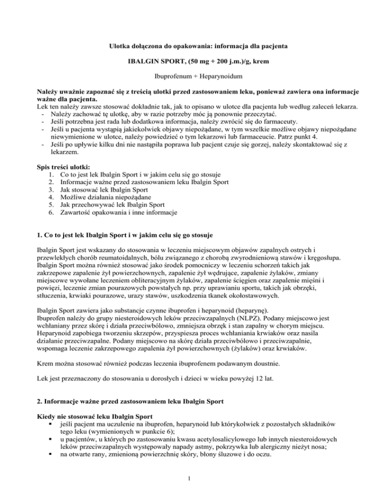 Ulotka dołączona do opakowania: informacja dla pacjenta IBALGIN SPORT, (50 mg + 200 j.m.)/g, krem Ibuprofenum + Heparynoidum Należy uważnie zapoznać się z treścią ulotki przed zastosowaniem leku, ponieważ zawiera ona informacje ważne dla pacjenta. Lek ten należy zawsze stosować dokładnie tak, jak to opisano w ulotce dla pacjenta lub według zaleceń lekarza. - Należy zachować tę ulotkę, aby w razie potrzeby móc ją ponownie przeczytać. - Jeśli potrzebna jest rada lub dodatkowa informacja, należy zwrócić się do farmaceuty. - Jeśli u pacjenta wystąpią jakiekolwiek objawy niepożądane, w tym wszelkie możliwe objawy niepożądane niewymienione w ulotce, należy powiedzieć o tym lekarzowi lub farmaceucie. Patrz punkt 4. - Jeśli po upływie kilku dni nie nastąpiła poprawa lub pacjent czuje się gorzej, należy skontaktować się z lekarzem. Spis treści ulotki: 1. Co to jest lek Ibalgin Sport i w jakim celu się go stosuje 2. Informacje ważne przed zastosowaniem leku Ibalgin Sport 3. Jak stosować lek Ibalgin Sport 4. Możliwe działania niepożądane 5. Jak przechowywać lek Ibalgin Sport 6. Zawartość opakowania i inne informacje 1. Co to jest lek Ibalgin Sport i w jakim celu się go stosuje Ibalgin Sport jest wskazany do stosowania w leczeniu miejscowym objawów zapalnych ostrych i przewlekłych chorób reumatoidalnych, bólu związanego z chorobą zwyrodnieniową stawów i kręgosłupa. Ibalgin Sport można również stosować jako środek pomocniczy w leczeniu schorzeń takich jak zakrzepowe zapalenie żył powierzchownych, zapalenie żył wędrujące, zapalenie żylaków, zmiany miejscowe wywołane leczeniem obliteracyjnym żylaków, zapalenie ścięgien oraz zapalenie mięśni i powięzi, leczenie zmian pourazowych powstałych np. przy uprawianiu sportu, takich jak obrzęki, stłuczenia, krwiaki pourazowe, urazy stawów, uszkodzenia tkanek okołostawowych. Ibalgin Sport zawiera jako substancje czynne ibuprofen i heparynoid (heparynę). Ibuprofen należy do grupy niesteroidowych leków przeciwzapalnych (NLPZ). Podany miejscowo jest wchłaniany przez skórę i działa przeciwbólowo, zmniejsza obrzęk i stan zapalny w chorym miejscu. Heparynoid zapobiega tworzeniu skrzepów, przyspiesza proces wchłaniania krwiaków oraz nasila działanie przeciwzapalne. Podany miejscowo na skórę działa przeciwbólowo i przeciwzapalnie, wspomaga leczenie zakrzepowego zapalenia żył powierzchownych (żylaków) oraz krwiaków. Krem można stosować również podczas leczenia ibuprofenem podawanym doustnie. Lek jest przeznaczony do stosowania u dorosłych i dzieci w wieku powyżej 12 lat. 2. Informacje ważne przed zastosowaniem leku Ibalgin Sport Kiedy nie stosować leku Ibalgin Sport jeśli pacjent ma uczulenie na ibuprofen, heparynoid lub którykolwiek z pozostałych składników tego leku (wymienionych w punkcie 6); u pacjentów, u których po zastosowaniu kwasu acetylosalicylowego lub innych niesteroidowych leków przeciwzapalnych występowały napady astmy, pokrzywka lub alergiczny nieżyt nosa; na otwarte rany, zmienioną powierzchnię skóry, błony śluzowe i do oczu. 1 Ostrzeżenia i środki ostrożności Przed rozpoczęciem stosowania leku Ibalgin Sport należy omówić to z lekarzem lub farmaceutą. Leku nie należy stosować w przypadku skazy krwotocznej, różnych postaci plamicy, małopłytkowości, hemofilii i różnego rodzaju stanów związanych ze skłonnością do krwawień. Nie należy stosować kremu na duże powierzchnie ciała w przypadku zwiększenia wyników OB, gdyż stosowanie leku może maskować istotne zmiany tego wskaźnika. Długotrwałe stosowanie tego leku może wywołać u niektórych pacjentów skórne reakcje nadwrażliwości. Jeśli wystąpią zmiany skórne (zaczerwienienie, wysypka, świąd, pieczenie, rumień) lek należy odstawić. Stężenie ibuprofenu we krwi podczas stosowania miejscowego jest znacznie mniejsze niż po podaniu doustnym, jednak pacjenci z chorobami nerek, zaburzeniami żołądka i jelit powinni poradzić się lekarza przed zastosowaniem leku. Po każdorazowym zastosowaniu leku należy umyć ręce. Dzieci i młodzież Lek jest przeznaczony do stosowania u dorosłych i dzieci w wieku powyżej 12 lat. Lek Ibalgin Sport a inne leki Należy powiedzieć lekarzowi o wszystkich lekach przyjmowanych przez pacjenta obecnie lub ostatnio, również tych, które wydawane są bez recepty, a także o lekach, które pacjent planuje stosować. Kwas acetylosalicylowy podawany ogólnie nasila działanie heparyny. Stosowanie heparyny na duże powierzchnie skóry lub jednoczesne leczenie przeciwzakrzepowe, np. podawanie leków przeciwzakrzepowych lub kwasu acetylosalicylowego, może zwiększyć prawdopodobieństwo wystąpienia krwawienia. Leku nie należy stosować z lekami stosowanymi miejscowo zawierającymi tetracyklinę i hydrokortyzon, ze względu na niezgodność z heparynoidem. Ciąża i karmienie piersią Jeśli pacjentka jest w ciąży lub karmi piersią, przypuszcza że może być w ciąży lub gdy planuje mieć dziecko, powinna poradzić się lekarza lub farmaceuty przed zastosowaniem tego leku. Nie należy stosować leku długotrwale na duże powierzchnie ciała u kobiet w okresie ciąży. W ostatnich trzech miesiącach ciąży nie zaleca się stosowania leku. Kobiety karmiące piersią powinny stosować lek jedynie przez krótki czas i na niewielkiej powierzchni ciała. Prowadzenie pojazdów i obsługiwanie maszyn Nie stwierdzono wpływu leku na zdolność prowadzenia pojazdów i obsługiwania maszyn. Ibalgin Sport zawiera metylu parahydroksybenzoesan i propylu parahydroksybenzoesan, dlatego może powodować reakcje alergiczne (tzw. reakcje typu późnego). Zawiera także glikol propylenowy, dlatego może powodować podrażnienie skóry. 3. Jak stosować lek Ibalgin Sport Dorośli i dzieci w wieku powyżej 12 lat: 2 lub 3 razy na dobę, nie częściej niż co 4 do 5 godzin, rozprowadzić warstwę kremu o grubości 1 