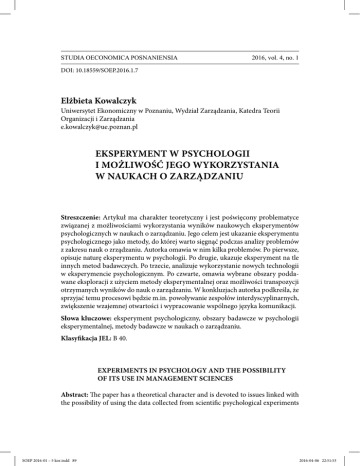 STUDIA OECONOMICA POSNANIENSIA 2016, vol. 4, no. 1 DOI: 10.18559/SOEP.2016.1.7 Elżbieta Kowalczyk Uniwersytet Ekonomiczny w Poznaniu, Wydział Zarządzania, Katedra Teorii Organizacji i Zarządzania [email protected] EKSPERYMENT W PSYCHOLOGII I MOŻLIWOŚĆ JEGO WYKORZYSTANIA W NAUKACH O ZARZĄDZANIU Streszczenie: Artykuł ma charakter teoretyczny i jest poświęcony problematyce związanej z możliwościami wykorzystania wyników naukowych eksperymentów psychologicznych w naukach o zarządzaniu. Jego celem jest ukazanie eksperymentu psychologicznego jako metody, do której warto sięgnąć podczas analizy problemów z zakresu nauk o zrządzaniu. Autorka omawia w nim kilka problemów. Po pierwsze, opisuje naturę eksperymentu w psychologii. Po drugie, ukazuje eksperyment na tle innych metod badawczych. Po trzecie, analizuje wykorzystanie nowych technologii w eksperymencie psychologicznym. Po czwarte, omawia wybrane obszary poddawane eksploracji z użyciem metody eksperymentalnej oraz możliwości transpozycji otrzymanych wyników do nauk o zarządzaniu. W konkluzjach autorka podkreśla, że sprzyjać temu procesowi będzie m.in. powoływanie zespołów interdyscyplinarnych, zwiększenie wzajemnej otwartości i wypracowanie wspólnego języka komunikacji. Słowa kluczowe: eksperyment psychologiczny, obszary badawcze w psychologii eksperymentalnej, metody badawcze w naukach o zarządzaniu. Klasyfikacja JEL: B 40. EXPERIMENTS IN PSYCHOLOGY AND THE POSSIBILITY OF ITS USE IN MANAGEMENT SCIENCES Abstract: The paper has a theoretical character and is devoted to issues linked with the possibility of using the data collected from scientific psychological experiments SOEP 2016-01 – 5 kor.indd 89 2016-04-06 22:51:53 90 Elżbieta Kowalczyk in management sciences. The aim of the paper is to demonstrate how psychological experiments could be used as a valuable method when exploring issues of management sciences. The Author discusses some key problems. Firstly, she describes the essence of the experiment in psychology. Secondly, she shows the experiment in comparison to other psychological methods. Thirdly, she analyses the use of new technology in experimental psychology. Fourthly, she discusses selected psychological research areas using with experimental method and considers the possibilities of the transposition of the findings into management sciences. In conclusion the author emphasizes, that to foster this the creation of interdisciplinary teams is necessary with greater mutual openness and in the development of a common language of communication. Keywords: experiments in psychology, research areas in experimental psychology, research methods in management science. Wstęp Metoda eksperymentalnego dochodzenia do prawdy ma w nauce niewątpliwie ugruntowaną pozycję. Jednakże łączy się w sposób oczywisty z naukami ścisłymi, takimi jak fizyka, chemia czy biologia. Rzadziej z naukami społecznymi, co więcej, związek ten może budzić relatywnie więcej wątpliwości natury etycznej. W historii badań eksperymentalnych z udziałem ludzi mamy bowiem przykłady pokazujące, że badacz chcący dociec, często bez wiedzy badanego, co kieruje postępowaniem ludzi, w jaki sposób podejmowane są decyzje, jakie są ukryte mechanizmy sterujące ich działaniem, odwoływał się nierzadko do zabiegów, które z dzisiejszej perspektywy można uznać za dwuznaczne etycznie (jeżeli nie wręcz nieetyczne). Pomimo to z wyników tych eksperymentów nadal korzystamy i pomagają one nowym pokoleniom naukowców tłumaczyć zjawiska psychologiczne oraz społeczne. Warto podkreślić, że psychologia jest nauką relatywnie młodą, gdyż jej oficjalny początek datuje się na rok 1879, gdy w Lipsku, z inicjatywy i pod kierunkiem Wilhelma Wundta, powstało Laboratorium Psychologiczne, tworząc tym samym samodzielną dziedzinę wiedzy – psychologię eksperymentalną (zwaną też fizjologiczną) [Stachowski 2000, s. 26]. Chociaż eksperyment w psychologii jest obecny od prawie 140 lat jej rozwoju, to stosunek do niego zmienia się wraz z nurtami psychologii, zainteresowaniami badawczymi psychologów, rozwojem techniki. Obszary, które początkowo wskazane były jako te, w których eksperyment nie ma racji bytu, stopniowo otwierają się na ten rodzaj poznania empirycznego. W dzisiejszym świecie nauki i biznesu już mało kto wątpi także w związek psychologii z ekonomią, w tym z naukami o zarządzaniu. Bez psychologii SOEP 2016-01 – 5 kor.indd 90 2016-04-06 22:52:00 Eksperyment w psychologii i możliwość jego wykorzystania w naukach o zarządzaniu 91 trudno jest zrozumieć zasady działania ludzi, ich wzajemnej współpracy, wyborów, jakie czynią, a to, z jednej strony, umożliwia psychologia, z drugiej – interesuje przedstawicieli świata ekonomii oraz nauk o zarządzaniu. Mariaż tych dziedzin docenił też Bank Szwecji, przyznając w roku 2002 Danielowi Kahnemanowi Nagrodę Nobla za wykorzystanie w ekonomii badań psychologicznych. Inny noblista, Herbert Simon, także prowadził badania z zakresu psychologii poznawczej. Obie z nauk uznawane są za empiryczne, ale czy posługują się podobnymi metodami poznania rzeczywistości i czy prawidłowości ustalone w obrębie jednej z nich można wykorzystać do budowania koncepcji, planów badawczych i modeli w obrębie drugiej? Czy ustalenia wynikające z eksperymentów psychologicznych mogą być absorbowane przez nauki o zarządzaniu? Jakie są perspektywy dla tego mariażu? Na tak postawione pytania autorka postara się znaleźć odpowiedź. Podsumowując, celem artykułu jest ukazanie sedna metody eksperymentalnej wykorzystywanej w psychologii oraz wskazanie możliwości wykorzystania ustaleń tychże badań w rozwoju nauk o zarządzaniu. 1. Natura eksperymentu w psychologii Warto zaznaczyć, że według słownika psychologicznego przygotowanego przez Amerykańskie Towarzystwo Psychologiczne metoda eksperymentalna polega na manipulacji i kontro