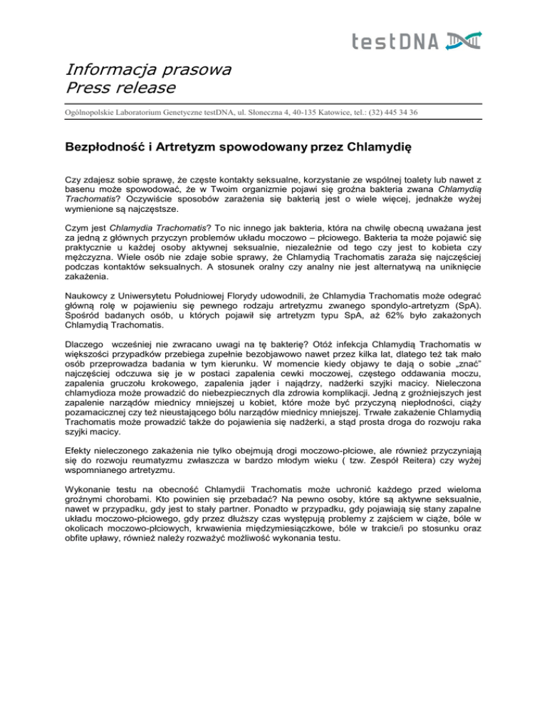 Informacja prasowa Press release Ogólnopolskie Laboratorium Genetyczne testDNA, ul. Słoneczna 4, 40-135 Katowice, tel.: (32) 445 34 36 Bezpłodność i Artretyzm spowodowany przez Chlamydię Czy zdajesz sobie sprawę, że częste kontakty seksualne, korzystanie ze wspólnej toalety lub nawet z basenu może spowodować, że w Twoim organizmie pojawi się groźna bakteria zwana Chlamydią Trachomatis? Oczywiście sposobów zarażenia się bakterią jest o wiele więcej, jednakże wyżej wymienione są najczęstsze. Czym jest Chlamydia Trachomatis? To nic innego jak bakteria, która na chwilę obecną uważana jest za jedną z głównych przyczyn problemów układu moczowo – płciowego. Bakteria ta może pojawić się praktycznie u każdej osoby aktywnej seksualnie, niezależnie od tego czy jest to kobieta czy mężczyzna. Wiele osób nie zdaje sobie sprawy, że Chlamydią Trachomatis zaraża się najczęściej podczas kontaktów seksualnych. A stosunek oralny czy analny nie jest alternatywą na uniknięcie zakażenia. Naukowcy z Uniwersytetu Południowej Florydy udowodnili, że Chlamydia Trachomatis może odegrać główną rolę w pojawieniu się pewnego rodzaju artretyzmu zwanego spondylo-artretyzm (SpA). Spośród badanych osób, u których pojawił się artretyzm typu SpA, aż 62% było zakażonych Chlamydią Trachomatis. Dlaczego wcześniej nie zwracano uwagi na tę bakterię? Otóż infekcja Chlamydią Trachomatis w większości przypadków przebiega zupełnie bezobjawowo nawet przez kilka lat, dlatego też tak mało osób przeprowadza badania w tym kierunku. W momencie kiedy objawy te dają o sobie „znać” najczęściej odczuwa się je w postaci zapalenia cewki moczowej, częstego oddawania moczu, zapalenia gruczołu krokowego, zapalenia jąder i najądrzy, nadżerki szyjki macicy. Nieleczona chlamydioza może prowadzić do niebezpiecznych dla zdrowia komplikacji. Jedną z groźniejszych jest zapalenie narządów miednicy mniejszej u kobiet, które może być przyczyną niepłodności, ciąży pozamacicznej czy też nieustającego bólu narządów miednicy mniejszej. Trwałe zakażenie Chlamydią Trachomatis może prowadzić także do pojawienia się nadżerki, a stąd prosta droga do rozwoju raka szyjki macicy. Efekty nieleczonego zakażenia nie tylko obejmują drogi moczowo-płciowe, ale również przyczyniają się do rozwoju reumatyzmu zwłaszcza w bardzo młodym wieku ( tzw. Zespół Reitera) czy wyżej wspomnianego artretyzmu. Wykonanie testu na obecność Chlamydii Trachomatis może uchronić każdego przed wieloma groźnymi chorobami. Kto powinien się przebadać? Na pewno osoby, które są aktywne seksualnie, nawet w przypadku, gdy jest to stały partner. Ponadto w przypadku, gdy pojawiają się stany zapalne układu moczowo-płciowego, gdy przez dłuższy czas występują problemy z zajściem w ciąże, bóle w okolicach moczowo-płciowych, krwawienia międzymiesiączkowe, bóle w trakcie/i po stosunku oraz obfite upławy, również należy rozważyć możliwość wykonania testu. Epidemiolodzy uważają, że obecnie mamy do czynienia z epidemią Chlamydii Trachomatis, jednakże wiele przypadków zakażeń nie zostaje nadal zdiagnozowanych. Biorąc pod uwagę ryzyko oraz skalę problemu, rozsądną wydaje się decyzja o wykonaniu badania zwłaszcza w przypadku osób aktywnych seksualnie oraz osób, u których pojawiły się problemy. Warto mieć na uwadze to, że wprowadzenie leczenia na wczesnym etapie zakażenia daje znacznie lepsze efekty niż w przypadku stanów zaawansowanych. Notka do redakcji: Firma testDNA istnieje na polskim rynku od 2003 r. specjalizując się w analizach ojcostwa i pokrewieństwa oraz diagnostyce medycznej. Obecnie laboratorium posiada ponad 100 punktów pobrań zlokalizowanych na terenie całego kraju jak i za granicą. Szczegółowe informacje zawarte są na stronie www.testDNA.pl Dodatkowych informacji udziela: Barbara Prokurat Dyrektor Biura Handlowego tel. (32) 445 34 36, [email protected], www.testDNA.pl