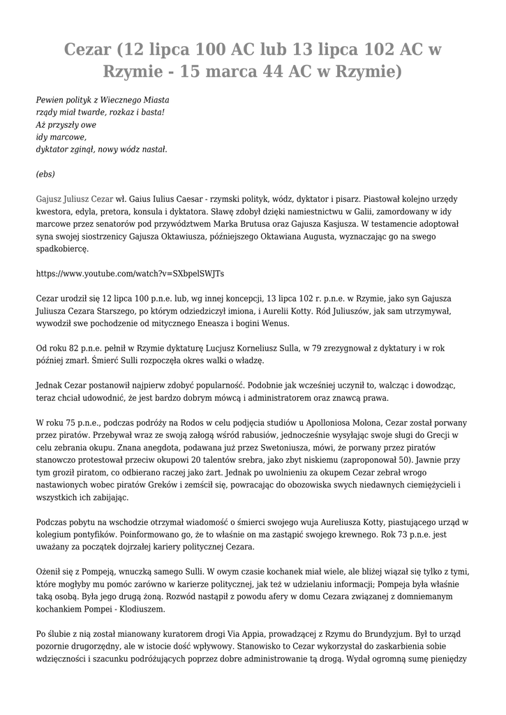 Cezar (12 lipca 100 AC lub 13 lipca 102 AC w Rzymie - 15 marca 44 AC w Rzymie) Pewien polityk z Wiecznego Miasta rządy miał twarde, rozkaz i basta! Aż przyszły owe idy marcowe, dyktator zginął, nowy wódz nastał. (ebs) Gajusz Juliusz Cezar wł. Gaius Iulius Caesar - rzymski polityk, wódz, dyktator i pisarz. Piastował kolejno urzędy kwestora, edyla, pretora, konsula i dyktatora. Sławę zdobył dzięki namiestnictwu w Galii, zamordowany w idy marcowe przez senatorów pod przywództwem Marka Brutusa oraz Gajusza Kasjusza. W testamencie adoptował syna swojej siostrzenicy Gajusza Oktawiusza, późniejszego Oktawiana Augusta, wyznaczając go na swego spadkobiercę. https://www.youtube.com/watch?v=SXbpelSWJTs Cezar urodził się 12 lipca 100 p.n.e. lub, wg innej koncepcji, 13 lipca 102 r. p.n.e. w Rzymie, jako syn Gajusza Juliusza Cezara Starszego, po którym odziedziczył imiona, i Aurelii Kotty. Ród Juliuszów, jak sam utrzymywał, wywodził swe pochodzenie od mitycznego Eneasza i bogini Wenus. Od roku 82 p.n.e. pełnił w Rzymie dyktaturę Lucjusz Korneliusz Sulla, w 79 zrezygnował z dyktatury i w rok później zmarł. Śmierć Sulli rozpoczęła okres walki o władzę. Jednak Cezar postanowił najpierw zdobyć popularność. Podobnie jak wcześniej uczynił to, walcząc i dowodząc, teraz chciał udowodnić, że jest bardzo dobrym mówcą i administratorem oraz znawcą prawa. W roku 75 p.n.e., podczas podróży na Rodos w celu podjęcia studiów u Apolloniosa Molona, Cezar został porwany przez piratów. Przebywał wraz ze swoją załogą wśród rabusiów, jednocześnie wysyłając swoje sługi do Grecji w celu zebrania okupu. Znana anegdota, podawana już przez Swetoniusza, mówi, że porwany przez piratów stanowczo protestował przeciw okupowi 20 talentów srebra, jako zbyt niskiemu (zaproponował 50). Jawnie przy tym groził piratom, co odbierano raczej jako żart. Jednak po uwolnieniu za okupem Cezar zebrał wrogo nastawionych wobec piratów Greków i zemścił się, powracając do obozowiska swych niedawnych ciemiężycieli i wszystkich ich zabijając. Podczas pobytu na wschodzie otrzymał wiadomość o śmierci swojego wuja Aureliusza Kotty, piastującego urząd w kolegium pontyfików. Poinformowano go, że to właśnie on ma zastąpić swojego krewnego. Rok 73 p.n.e. jest uważany za początek dojrzałej kariery politycznej Cezara. Ożenił się z Pompeją, wnuczką samego Sulli. W owym czasie kochanek miał wiele, ale bliżej wiązał się tylko z tymi, które mogłyby mu pomóc zarówno w karierze politycznej, jak też w udzielaniu informacji; Pompeja była właśnie taką osobą. Była jego drugą żoną. Rozwód nastąpił z powodu afery w domu Cezara związanej z domniemanym kochankiem Pompei - Klodiuszem. Po ślubie z nią został mianowany kuratorem drogi Via Appia, prowadzącej z Rzymu do Brundyzjum. Był to urząd pozornie drugorzędny, ale w istocie dość wpływowy. Stanowisko to Cezar wykorzystał do zaskarbienia sobie wdzięczności i szacunku podróżujących poprzez dobre administrowanie tą drogą. Wydał ogromną sumę pieniędzy na dobre sprawowanie powierzonej mu funkcji, czym uzależnił się od Krassusa, od którego często pożyczał duże sumy pieniędzy. W 65 p.n.e. Cezar został edylem kurulnym, wyższym urzędnikiem. Jego głównym zadaniem było od tej pory czuwanie nad porządkiem i budownictwem w Rzymie; przede wszystkim jednak nad organizacją igrzysk. Wykazał się przy tym rozrzutnością, wystawiając dużą liczbę gladiatorów do pokazowych walk. W 63 p.n.e. został wybrany na stanowisko Pontifeksa Maximusa, czyli najwyższego kapłana. Pontifex Maximus sprawował zwierzchnictwo nad całością życia religijnego w Rzymie, ale także - i co bardziej interesowało Cezara miał poważne wpływy polityczne uzyskiwane także przekupstwem. W owym czasie przekupstwa były powszechne. Cezar wydatkował wielką kwotę, aby wkupić się w przychylność ludu i wpływowych osób. Dość ważnym, choć niejednoznacznie odbieranym, wątkiem w jego karierze politycznej był tzw. spisek Katyliny. W 61 p.n.e. Cezar jeszcze raz wyjechał do Hiszpanii Dalszej (Hispania Ulterior). Tam też podjął na własną rękę akcję zbrojną przeciwko dotąd niepodbitym plemionom górskim. Początkowo zajął większość wsi, jednak gdy uciekająca ludność schroniła się na pobliskiej wyspie, podjął niefortunną decyzję. Rozkazał zbudować tratwy, na których żołnierze mieli się przedostać na ową wyspę. Na skutek odpływu, który pochłonął większość oddziału, a także oporu, jaki stawiono reszcie na wyspie, z całej kampanii uratował się tylko jeden żołnierz, który wrócił wpław. Dopiero po tygodniu przybyły z Gades okręty, na których Rzymianie przedostali się na wyspę i wybili wygłodzonych uciekinierów. Następnie Cezar popłynął w kierunku miasta Brigancjum, które poddało się bez walki. Ogólnie kampania hiszpańska została przyjęta pozytywnie, imperium uzyskało dość duże terytoria, a Cezar został uznany za imperatora. Spisał się także jako administrator prowincji - starał się zarówno odprowadzić jak największe dochody z prowincji, ale także zakazał zajmowania przez wierzycieli więcej niż 2/3 majątku dłużnika. Ogłoszenie Cezara imperatorem dało mu prawo do triumfu w Rzymie. Problem jednak polegał na tym, że chciał złożyć czym prędzej swoją kandydaturę na urząd konsula na rok 59 p.n.e., a jako dowódca armii musiał - zgodnie z tradycją - czekać pod bramami miasta na zezwolenie Senatu na wejście do miasta. W 60 p.n.e., Cezar zawarł I triumwirat - tajne porozumienie z konsulami Gnejuszem Pompejuszem i Markiem Licyniuszem Krassusem, dzięki czemu został wybrany konsulem na rok 59 p.n.e. Cezar natychmiast podjął jedną z najważniejszych reform - reformę agrarną. Podstawową jej zmianą był zakaz przeprowadzania przymusowego wykupu ziemi bez zgody właściciela. Umożliwiono tak