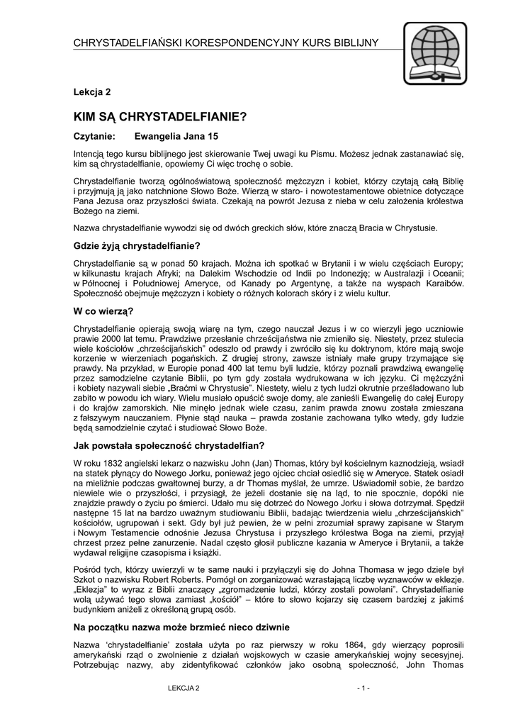 CHRYSTADELFIAŃSKI KORESPONDENCYJNY KURS BIBLIJNY Lekcja 2 KIM SĄ CHRYSTADELFIANIE? Czytanie: Ewangelia Jana 15 Intencją tego kursu biblijnego jest skierowanie Twej uwagi ku Pismu. Możesz jednak zastanawiać się, kim są chrystadelfianie, opowiemy Ci więc trochę o sobie. Chrystadelfianie tworzą ogólnoświatową społeczność mężczyzn i kobiet, którzy czytają całą Biblię i przyjmują ją jako natchnione Słowo Boże. Wierzą w staro- i nowotestamentowe obietnice dotyczące Pana Jezusa oraz przyszłości świata. Czekają na powrót Jezusa z nieba w celu założenia królestwa Bożego na ziemi. Nazwa chrystadelfianie wywodzi się od dwóch greckich słów, które znaczą Bracia w Chrystusie. Gdzie żyją chrystadelfianie? Chrystadelfianie są w ponad 50 krajach. Można ich spotkać w Brytanii i w wielu częściach Europy; w kilkunastu krajach Afryki; na Dalekim Wschodzie od Indii po Indonezję; w Australazji i Oceanii; w Północnej i Południowej Ameryce, od Kanady po Argentynę, a także na wyspach Karaibów. Społeczność obejmuje mężczyzn i kobiety o różnych kolorach skóry i z wielu kultur. W co wierzą? Chrystadelfianie opierają swoją wiarę na tym, czego nauczał Jezus i w co wierzyli jego uczniowie prawie 2000 lat temu. Prawdziwe przesłanie chrześcijaństwa nie zmieniło się. Niestety, przez stulecia wiele kościołów „chrześcijańskich” odeszło od prawdy i zwróciło się ku doktrynom, które mają swoje korzenie w wierzeniach pogańskich. Z drugiej strony, zawsze istniały małe grupy trzymające się prawdy. Na przykład, w Europie ponad 400 lat temu byli ludzie, którzy poznali prawdziwą ewangelię przez samodzielne czytanie Biblii, po tym gdy została wydrukowana w ich języku. Ci mężczyźni i kobiety nazywali siebie „Braćmi w Chrystusie”. Niestety, wielu z tych ludzi okrutnie prześladowano lub zabito w powodu ich wiary. Wielu musiało opuścić swoje domy, ale zanieśli Ewangelię do całej Europy i do krajów zamorskich. Nie minęło jednak wiele czasu, zanim prawda znowu została zmieszana z fałszywym nauczaniem. Płynie stąd nauka – prawda zostanie zachowana tylko wtedy, gdy ludzie będą samodzielnie czytać i studiować Słowo Boże. Jak powstała społeczność chrystadelfian? W roku 1832 angielski lekarz o nazwisku John (Jan) Thomas, który był kościelnym kaznodzieją, wsiadł na statek płynący do Nowego Jorku, ponieważ jego ojciec chciał osiedlić się w Ameryce. Statek osiadł na mieliźnie podczas gwałtownej burzy, a dr Thomas myślał, że umrze. Uświadomił sobie, że bardzo niewiele wie o przyszłości, i przysiągł, że jeżeli dostanie się na ląd, to nie spocznie, dopóki nie znajdzie prawdy o życiu po śmierci. Udało mu się dotrzeć do Nowego Jorku i słowa dotrzymał. Spędził następne 15 lat na bardzo uważnym studiowaniu Biblii, badając twierdzenia wielu „chrześcijańskich” kościołów, ugrupowań i sekt. Gdy był już pewien, że w pełni zrozumiał sprawy zapisane w Starym i Nowym Testamencie odnośnie Jezusa Chrystusa i przyszłego królestwa Boga na ziemi, przyjął chrzest przez pełne zanurzenie. Nadal często głosił publiczne kazania w Ameryce i Brytanii, a także wydawał religijne czasopisma i książki. Pośród tych, którzy uwierzyli w te same nauki i przyłączyli się do Johna Thomasa w jego dziele był Szkot o nazwisku Robert Roberts. Pomógł on zorganizować wzrastającą liczbę wyznawców w eklezje. „Eklezja” to wyraz z Biblii znaczący „zgromadzenie ludzi, którzy zostali powołani”. Chrystadelfianie wolą używać tego słowa zamiast „kościół” – które to słowo kojarzy się czasem bardziej z jakimś budynkiem aniżeli z określoną grupą osób. Na początku nazwa może brzmieć nieco dziwnie Nazwa ‘chrystadelfianie’ została użyta po raz pierwszy w roku 1864, gdy wierzący poprosili amerykański rząd o zwolnienie z działań wojskowych w czasie amerykańskiej wojny secesyjnej. Potrzebując nazwy, aby zidentyfikować członków jako osobną społeczność, John Thomas LEKCJA 2 -1- przypomniał sobie o „Braciach w Chrystusie” sprzed 300 lat, użył więc nazwy 'chrystadelfianie', co jest grecką formą tego określenia. Owi XIX-wieczni chrystadelfianie byli wielkimi podróżnikami, którzy nauczali w wielu częściach świata, więc przed końcem wieku w wielu krajach istniały już grupy wierzących. Jak chrystadelfianie są zorganizowani? Istnieją różne komitety dla organizowania pracy misyjnej i opieki nad chorymi, starszymi i samotnymi; mamy też biura w kilku krajach, zajmujące się wydawaniem czasopism i książek. Nie mamy jednak opłacanych osób duchownych ani żadnej organizacji centralnej. Potrzeby finansowe są pokrywane z ochotniczych darowizn od członków. Nie mamy żadnych księży. Możesz jednak zapytać: jeżeli nie ma żadnego urzędu centralnego łączącego wszystkich członków, to w jaki sposób chrystadelfianie organizują się? Odpowiedź jest taka, że nasza wspólna wiara i nasze wspólne praktyki stanowią zasadnicze ogniwo wiążące członków razem. Każda miejscowa grupa jest samodzielna i wyznacza własnych „starszych”, zazwyczaj przez głosowanie raz do roku. Osoby mianowane służą eklezji wykonując różne obowiązki jako sekretarze, skarbnicy, zarządcy lub jako przewodniczący zebrań. Nie otrzymują zapłaty za swoją pracę. Nie są „kapłanami”, ponieważ wierzymy, że Jezus, teraz w niebie, jest jedynym Kapłanem, któremu ochrzczeni członkowie jego Kościoła mogą wyznawać swe grzechy w modlitwie. Chrystadelfianie nie budują ogromnych, wymyślnych budynków kościelnych. Oczywiście są miejsca, gdzie eklezje mogą pozwolić sobie na własną salę lub pomieszczenie na spotkania i nauczanie. Gdzie indziej spotykają się w wynajętych klasach szkolnych, salach komunalnych albo w domach lub mieszkaniach. Te same wierzenia W którejkolwiek części świata by nie mieszkali, chrysta