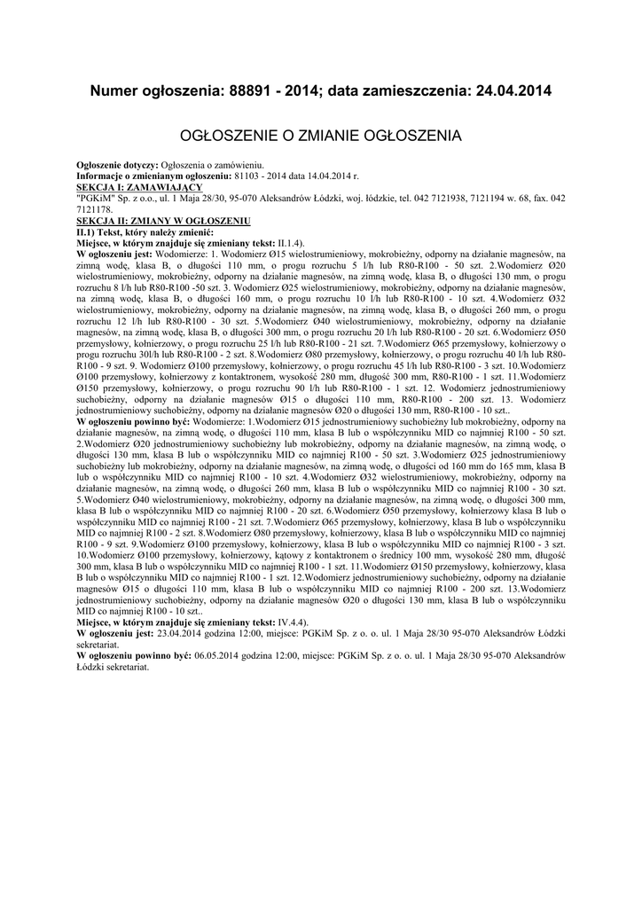 Numer ogłoszenia: 88891 - 2014; data zamieszczenia: 24.04.2014 OGŁOSZENIE O ZMIANIE OGŁOSZENIA Ogłoszenie dotyczy: Ogłoszenia o zamówieniu. Informacje o zmienianym ogłoszeniu: 81103 - 2014 data 14.04.2014 r. SEKCJA I: ZAMAWIAJĄCY "PGKiM" Sp. z o.o., ul. 1 Maja 28/30, 95-070 Aleksandrów Łódzki, woj. łódzkie, tel. 042 7121938, 7121194 w. 68, fax. 042 7121178. SEKCJA II: ZMIANY W OGŁOSZENIU II.1) Tekst, który należy zmienić: Miejsce, w którym znajduje się zmieniany tekst: II.1.4). W ogłoszeniu jest: Wodomierze: 1. Wodomierz Ø15 wielostrumieniowy, mokrobieżny, odporny na działanie magnesów, na zimną wodę, klasa B, o długości 110 mm, o progu rozruchu 5 l/h lub R80-R100 - 50 szt. 2.Wodomierz Ø20 wielostrumieniowy, mokrobieżny, odporny na działanie magnesów, na zimną wodę, klasa B, o długości 130 mm, o progu rozruchu 8 l/h lub R80-R100 -50 szt. 3. Wodomierz Ø25 wielostrumieniowy, mokrobieżny, odporny na działanie magnesów, na zimną wodę, klasa B, o długości 160 mm, o progu rozruchu 10 l/h lub R80-R100 - 10 szt. 4.Wodomierz Ø32 wielostrumieniowy, mokrobieżny, odporny na działanie magnesów, na zimną wodę, klasa B, o długości 260 mm, o progu rozruchu 12 l/h lub R80-R100 - 30 szt. 5.Wodomierz Ø40 wielostrumieniowy, mokrobieżny, odporny na działanie magnesów, na zimną wodę, klasa B, o długości 300 mm, o progu rozruchu 20 l/h lub R80-R100 - 20 szt. 6.Wodomierz Ø50 przemysłowy, kołnierzowy, o progu rozruchu 25 l/h lub R80-R100 - 21 szt. 7.Wodomierz Ø65 przemysłowy, kołnierzowy o progu rozruchu 30l/h lub R80-R100 - 2 szt. 8.Wodomierz Ø80 przemysłowy, kołnierzowy, o progu rozruchu 40 l/h lub R80R100 - 9 szt. 9. Wodomierz Ø100 przemysłowy, kołnierzowy, o progu rozruchu 45 l/h lub R80-R100 - 3 szt. 10.Wodomierz Ø100 przemysłowy, kołnierzowy z kontaktronem, wysokość 280 mm, długość 300 mm, R80-R100 - 1 szt. 11.Wodomierz Ø150 przemysłowy, kołnierzowy, o progu rozruchu 90 l/h lub R80-R100 - 1 szt. 12. Wodomierz jednostrumieniowy suchobieżny, odporny na działanie magnesów Ø15 o długości 110 mm, R80-R100 - 200 szt. 13. Wodomierz jednostrumieniowy suchobieżny, odporny na działanie magnesów Ø20 o długości 130 mm, R80-R100 - 10 szt.. W ogłoszeniu powinno być: Wodomierze: 1.Wodomierz Ø15 jednostrumieniowy suchobieżny lub mokrobieżny, odporny na działanie magnesów, na zimną wodę, o długości 110 mm, klasa B lub o współczynniku MID co najmniej R100 - 50 szt. 2.Wodomierz Ø20 jednostrumieniowy suchobieżny lub mokrobieżny, odporny na działanie magnesów, na zimną wodę, o długości 130 mm, klasa B lub o współczynniku MID co najmniej R100 - 50 szt. 3.Wodomierz Ø25 jednostrumieniowy suchobieżny lub mokrobieżny, odporny na działanie magnesów, na zimną wodę, o długości od 160 mm do 165 mm, klasa B lub o współczynniku MID co najmniej R100 - 10 szt. 4.Wodomierz Ø32 wielostrumieniowy, mokrobieżny, odporny na działanie magnesów, na zimną wodę, o długości 260 mm, klasa B lub o współczynniku MID co najmniej R100 - 30 szt. 5.Wodomierz Ø40 wielostrumieniowy, mokrobieżny, odporny na działanie magnesów, na zimną wodę, o długości 300 mm, klasa B lub o współczynniku MID co najmniej R100 - 20 szt. 6.Wodomierz Ø50 przemysłowy, kołnierzowy klasa B lub o współczynniku MID co najmniej R100 - 21 szt. 7.Wodomierz Ø65 przemysłowy, kołnierzowy, klasa B lub o współczynniku MID co najmniej R100 - 2 szt. 8.Wodomierz Ø80 przemysłowy, kołnierzowy, klasa B lub o współczynniku MID co najmniej R100 - 9 szt. 9.Wodomierz Ø100 przemysłowy, kołnierzowy, klasa B lub o współczynniku MID co najmniej R100 - 3 szt. 10.Wodomierz Ø100 przemysłowy, kołnierzowy, kątowy z kontaktronem o średnicy 100 mm, wysokość 280 mm, długość 300 mm, klasa B lub o współczynniku MID co najmniej R100 - 1 szt. 11.Wodomierz Ø150 przemysłowy, kołnierzowy, klasa B lub o współczynniku MID co najmniej R100 - 1 szt. 12.Wodomierz jednostrumieniowy suchobieżny, odporny na działanie magnesów Ø15 o długości 110 mm, klasa B lub o współczynniku MID co najmniej R100 - 200 szt. 13.Wodomierz jednostrumieniowy suchobieżny, odporny na działanie magnesów Ø20 o długości 130 mm, klasa B lub o współczynniku MID co najmniej R100 - 10 szt.. Miejsce, w którym znajduje się zmieniany tekst: IV.4.4). W ogłoszeniu jest: 23.04.2014 godzina 12:00, miejsce: PGKiM Sp. z o. o. ul. 1 Maja 28/30 95-070 Aleksandrów Łódzki sekretariat. W ogłoszeniu powinno być: 06.05.2014 godzina 12:00, miejsce: PGKiM Sp. z o. o. ul. 1 Maja 28/30 95-070 Aleksandrów Łódzki sekretariat.