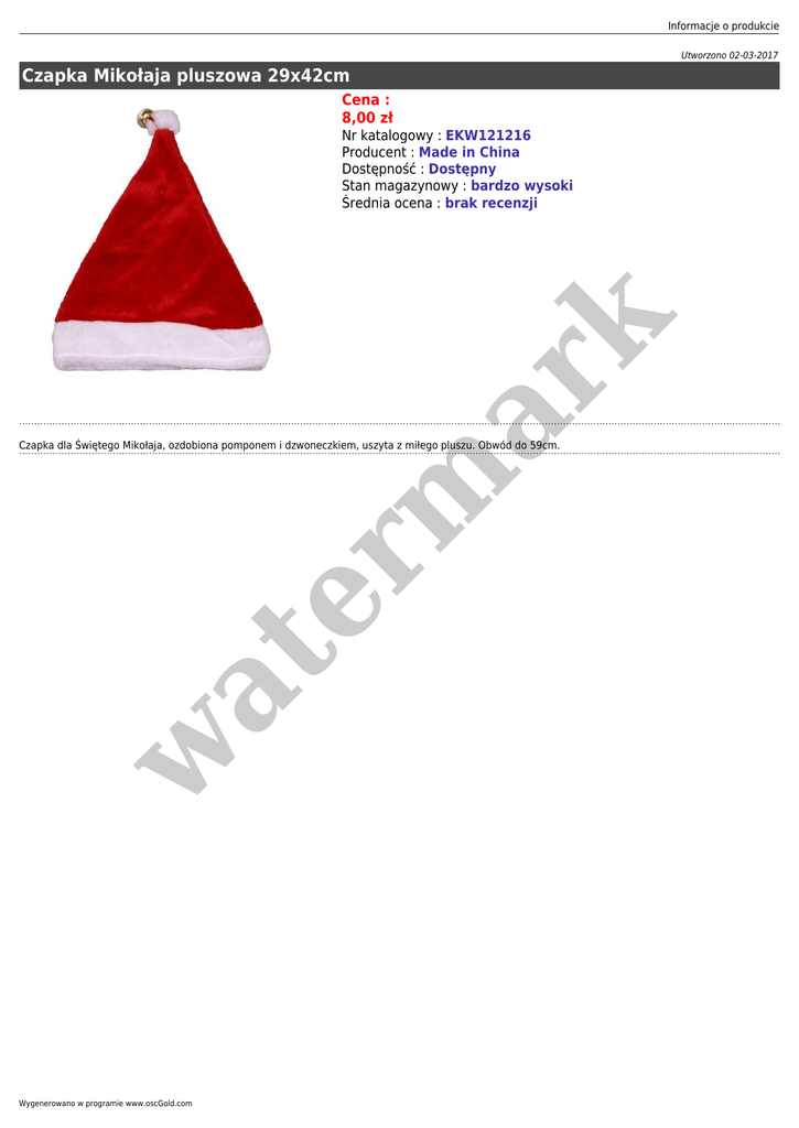 Informacje o produkcie Utworzono 02-03-2017 Czapka Mikołaja pluszowa 29x42cm Cena : 8,00 zł er m ar k Nr katalogowy : EKW121216 Producent : Made in China Dostępność : Dostępny Stan magazynowy : bardzo wysoki Średnia ocena : brak recenzji w at Czapka dla Świętego Mikołaja, ozdobiona pomponem i dzwoneczkiem, uszyta z miłego pluszu. Obwód do 59cm. Wygenerowano w programie www.oscGold.com