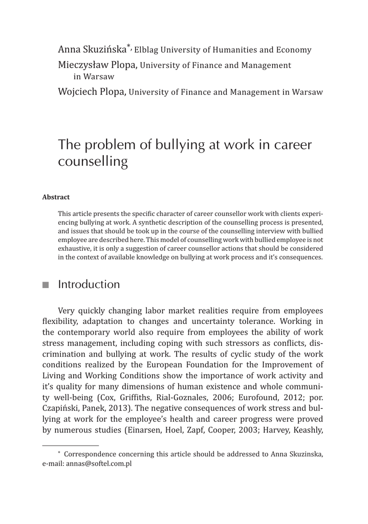 Anna Skuzińska*, Elblag University of Humanities and Economy Mieczysław Plopa, University of Finance and Management in Warsaw Wojciech Plopa, University of Finance and Management in Warsaw The problem of bullying at work in career counselling Abstract This article presents the specific character of career counsellor work with clients experiencing bullying at work. A synthetic description of the counselling process is presented, and issues that should be took up in the course of the counselling interview with bullied employee are described here. This model of counselling work with bullied employee is not exhaustive, it is only a suggestion of career counsellor actions that should be considered in the context of available knowledge on bullying at work process and it’s consequences. QQ Introduction Very quickly changing labor market realities require from employees flexibility, adaptation to changes and uncertainty tolerance. Working in the contemporary world also require from employees the ability of work stress management, including coping with such stressors as conflicts, discrimination and bullying at work. The results of cyclic study of the work conditions realized by the European Foundation for the Improvement of Living and Working Conditions show the importance of work activity and it’s quality for many dimensions of human existence and whole community well-being (Cox, Griffiths, Rial-Goznales, 2006; Eurofound, 2012; por. Czapiński, Panek, 2013). The negative consequences of work stress and bullying at work for the employee’s health and career progress were proved by numerous studies (Einarsen, Hoel, Zapf, Cooper, 2003; Harvey, Keashly, * Correspondence concerning this article should be addressed to Anna Skuzinska, e-mail: [email protected] 138 Anna Skuzińska, Mieczysław Plopa, Wojciech Plopa 2005; Hoel, Faragher, Cooper, 2004; Mikkelsen, Einarsen, 2001; Matthiesen, Einarsen, 2004). The career counselors may assist employees in their adaptation to changing labor market demands, and in their efforts to coping with work stress. The aim of this article is to encourage career counselors’ reflection on to the methodology of the counseling bullied employees. QQ Career counseling In accordance with employment promotion and labour market institutions law the career counselling consist among other in assist unemployed people with occupation and workplace choice (Law journal 2004, No 99, 1001 with later modifications). The career counselling for adults in Poland is realised by public and private employment agencies and other mentioned in the employment and labour market institutions law (idem). Because of the very quickly changing labour market demands and in the presence of the lifelong learning necessity, the career counselling become necessary not only for the young people or unemployed people but also for employed ones. The career counselling aim is to assist individuals when they choose their profession, when they change job or retrain, and when they make decision on change their profession. The career counsellor help people who made wrong profession choice and those who have not satisfaction with the occupation they exercise. The career counselling is also about the problem of adaptation to the workplace, career development planning, and the workplace choice. According to Brown (Brown, 1985 in: Gladding, 1994) the career counselling aim is to help individuals acquire their occupational role and to efficiently exercise it. The career counsellor assist his clients in the better self-understanding, in the learning new behaviours, new ways of feeling and thinking (Gladding, 1994). According to Rey Lamb, American career counselling specialist, the career counselling is a process in which the career counsellor help his client to reach a better self-understanding with respect to the work environment, and in this way the career counsellor help his client to do a realistic workplace choice or change and to reach appropriate adaptation to the workplace (Lamb, 1993). The difficulties with adaptation to the job include among others overqualifiation and underqualification, conflicts with superiors and / or colleagues. The job adaptation problems comprise also coping with stressors related to career development, including coping with the absence of career development opportunities (career stagnation) (Cooper, Marshall, 1987; Lamb, 1993; Łoboda, 1990). The problem of bullying at work in career counselling QQ 139 Occupational career and bullying at work The term of occupational career commonly means to move up career ladder. Occupational career is a sequence of events in a person’s life that are connected to his or her occupational activity (Suchar, 2010, p.7); it’s a sequence of professions and other life roles (Super, 1976 in: Gladding, 1994, p. 162). McDaniels adds to the notion of occupational career activities carried out off duty, because they may be important for future occupations (in: Gladding, 1994). Besides paid and unpaid employment the contemporary notion of occupational career comprises also the time passed on training and the time spend on looking after one’s family. The occupational career is nowadays examined from a perspective of the whole human life cycle. Occupational career consist not only in professional successes, promotions, rewards, but also in failures in occupational domain (Rostowska, Rostowski, 2002). The lack of stability, the diversity and the episodic character are features of the contemporary professional career as well as uncertainty of the professional future, and the need for continuous occupational career building. To these features may be added also employee’s ability to tolerate occupational career uncertainty and the ability to cope with this uncertainty (Mitchell, Krumboltz, Levin, 1999; Suchar, 2010; Wojtasik, 2011). The career ‘breakdown’ or career stagnation i.e. the lack of progress in the professional development, may be caused by 
