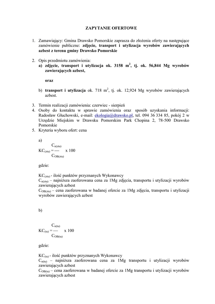ZAPYTANIE OFERTOWE 1. Zamawiający: Gmina Drawsko Pomorskie zaprasza do złożenia oferty na następujące zamówienie publiczne: zdjęcie, transport i utylizacja wyrobów zawierających azbest z terenu gminy Drawsko Pomorskie 2. Opis przedmiotu zamówienia: a) zdjęcie, transport i utylizacja ok. 3158 m2, tj. ok. 56,844 Mg wyrobów zawierających azbest, oraz b) transport i utylizacja ok. 718 m2, tj. ok. 12,924 Mg wyrobów zawierających azbest. 3. Termin realizacji zamówienia: czerwiec - sierpień 4. Osoby do kontaktu w sprawie zamówienia oraz sposób uzyskania informacji: Radosław Głuchowski, e-mail: [email protected], tel. 094 36 334 85, pokój 2 w Urzędzie Miejskim w Drawsku Pomorskim Park Chopina 2, 78-500 Drawsko Pomorskie 5. Kryteria wyboru ofert: cena a) Cn(ztu) KC(ztu) = x 100 COB(ztu) gdzie: KC(ztu) - ilość punktów przyznanych Wykonawcy Cn(ztu) – najniższa zaoferowana cena za 1Mg zdjęcia, transportu i utylizacji wyrobów zawierających azbest COB(ztu) – cena zaoferowana w badanej ofercie za 1Mg zdjęcia, transportu i utylizacji wyrobów zawierających azbest b) Cn(tu) KC(tu) = x 100 COB(tu) gdzie: KC(tu) - ilość punktów przyznanych Wykonawcy Cn(tu) – najniższa zaoferowana cena za 1Mg transportu i utylizacji wyrobów zawierających azbest COB(tu) – cena zaoferowana w badanej ofercie za 1Mg transportu i utylizacji wyrobów zawierających azbest c) KC(ztu) + KC(tu) =SP gdzie: SP – suma przyznanych punktów 6. Do oferty należy załączyć: 1) oświadczenie, że Wykonawca ubiegający się o zamówienie spełnia warunki określone w art. 22 ust. 1 ustawy z 29 stycznia 2004 r. Prawo zamówień publicznych (Dz. U. z 2010 r. Nr 113, poz. 759 z późn. zm.); 2) kserokopię decyzji zatwierdzającej program gospodarki odpadami niebezpiecznymi, powstającymi w wyniku działalności gospodarczej; 3) kserokopię umowy dotyczącej Wykonawcy; przyjmowania odpadów niebezpiecznych od 4) zaświadczenie o ukończeniu szkolenia w sprawie bezpieczeństwa i higieny pracy przy zabezpieczeniu i usuwaniu wyrobów zawierających azbest 7. Uwaga: oferta powinna zawierać cenę za 1 Mg zdjęcia, transportu i utylizacji wyrobów zawierających azbest oraz cenę za 1 Mg transportu i utylizacji wyrobów zawierających azbest. 8. Warunki gwarancji (jeśli dotyczy): nie dotyczy. 9. Sposób przygotowania oferty: ofertę należy sporządzić w języku polskim, w formie pisemnej, na maszynie, komputerze, nieścieralnym atramentem. 10. Miejsce i termin złożenia/przesłania ofert: ofertę należy złożyć/przesłać do dnia 6 czerwca 2013 r., do godz. 1000 w sekretariacie Urzędu Miejskiego w Drawsku Pomorskim, pokój 210 lub za pośrednictwem faksu nr: 94 3633113, lub pocztą elektroniczną na adres: [email protected]; 11. Ogłoszenie o postępowaniu i warunki udziału w postępowaniu mogą być zmienione, a postępowanie może być odwołane przez Zamawiającego w każdym czasie, bez podania przyczyn. 12. Zamawiający może unieważnić postępowanie między innymi, gdy: 1) w postępowaniu nie złożono żadnej oferty, 2) cena najkorzystniejszej oferty przekroczyła wartość kwoty, którą zamawiający przeznaczył na finansowanie zamówienia, 3) wystąpiła istotna zmiana okoliczności, niezależna od zamawiającego, powodująca, że dalsze prowadzenie postępowania lub wykonanie zamówienia nie jest zasadne. Oferta Na wykonanie (nazwa zamówienia)………………………….. ……………………………………………………………….. ………………………………………………………………. (nazwa, pieczęć wykonawcy) 1. Oświadczam, że spełniam warunki określone w art. 22 ust. 1 ustawy z 29 stycznia 2004 r. Prawo zamówień publicznych (Dz. U. z 2010 r. Nr 113 poz. 759 z późn. zm.) 2. Oferuję realizację zamówienia zgodnie z opisem zawartym w zapytaniu ofertowym gminy Drawsko Pomorskie z dnia ………………………... za kwotę: a) netto : .................... PLN (słownie : ..................................................................) podatek VAT .......... % - ..................... (słownie .....................................................................) cena brutto: ..................... (słownie : .......................................................................................) za 1 Mg zdjęcia, transportu i utylizacji wyrobów zawierających azbest oraz b) netto : .................... PLN (słownie : ..................................................................) podatek VAT .......... % - ..................... (słownie .....................................................................) cena brutto: ..................... (słownie : .......................................................................................) za 1 Mg transportu i utylizacji wyrobów zawierających azbest. 3. Załączniki do oferty: (jeśli dotyczy) ……………………………….. .................................dn. ..20 r. ............................................. (pieczęć i podpis Wykonawcy)
