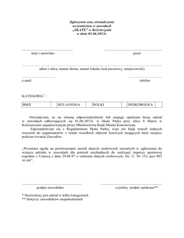 Zgłoszenie oraz oświadczenie uczestnictwa w zawodach „SKATE” w Kościerzynie w dniu 01.06.2013r. ....................................................... imię i nazwisko .............................................................. pesel …………………………………………………………………………………………………... adres ( ulica, numer domu, numer lokalu, kod pocztowy, miejscowość) ……………………… e-mail ……………………… telefon KATEGORIA* : BMX HULAJNOGA ROLKI DESKOROLKA Oświadczam, że na własną odpowiedzialność lub mojego opiekuna biorę udział w zawodach odbywających się 01.06.2013r. w Skate Parku przy ulicy 8 Marca w Kościerzynie organizowanym przez Młodzieżową Radę Miasta Kościerzyna. Zapoznałem/am się z Regulaminem Skate Parku, więc nie będę wnosił żadnych roszczeń do organizatorów z tytułu wszelkich zdarzeń losowych mogących mieć miejsce podczas trwania Zawodów. „Wyrażam zgodę na przetwarzanie moich danych osobowych zawartych w zgłoszeniu do wzięcia udziału w zawodach dla potrzeb niezbędnych do realizacji imprezy sportowej (zgodnie z Ustawą z dnia 29.08.97 o ochronie danych osobowych, Dz. U. Nr 133, poz 883 ze zm”. ................................................................. podpis zawodnika * Dozwolony jest udział w kilku kategoriach ** Dotyczy zawodników niepełnoletnich .................................................................. czytelny podpis opiekuna**