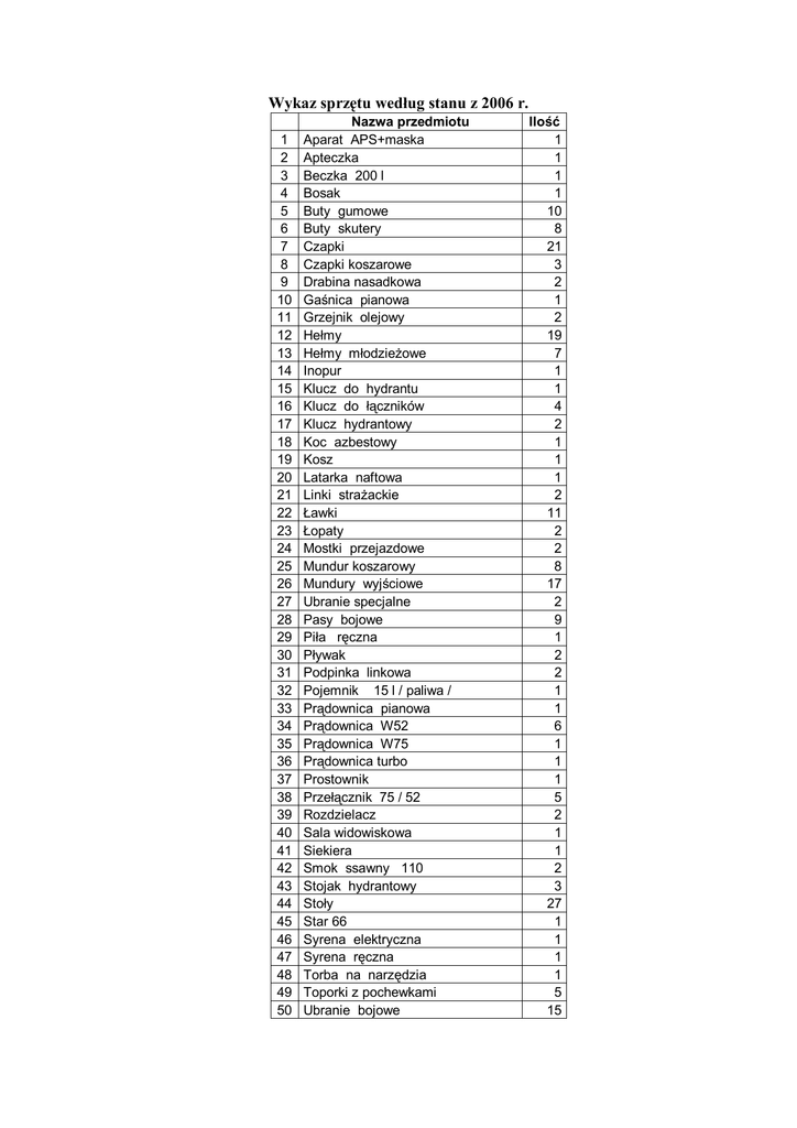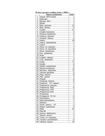 Wykaz sprzętu według stanu z 2006 r. 1 2 3 4 5 6 7 8 9 10 11 12 13 14 15 16 17 18 19 20 21 22 23 24 25 26 27 28 29 30 31 32 33 34 35 36 37 38 39 40 41 42 43 44 45 46 47 48 49 50 Nazwa przedmiotu Aparat APS+maska Apteczka Beczka 200 l Bosak Buty gumowe Buty skutery Czapki Czapki koszarowe Drabina nasadkowa Gaśnica pianowa Grzejnik olejowy Hełmy Hełmy młodzieżowe Inopur Klucz do hydrantu Klucz do łączników Klucz hydrantowy Koc azbestowy Kosz Latarka naftowa Linki strażackie Ławki Łopaty Mostki przejazdowe Mundur koszarowy Mundury wyjściowe Ubranie specjalne Pasy bojowe Piła ręczna Pływak Podpinka linkowa Pojemnik 15 l / paliwa / Prądownica pianowa Prądownica W52 Prądownica W75 Prądownica turbo Prostownik Przełącznik 75 / 52 Rozdzielacz Sala widowiskowa Siekiera Smok ssawny 110 Stojak hydrantowy Stoły Star 66 Syrena elektryczna Syrena ręczna Torba na narzędzia Toporki z pochewkami Ubranie bojowe Ilość 1 1 1 1 10 8 21 3 2 1 2 19 7 1 1 4 2 1 1 1 2 11 2 2 8 17 2 9 1 2 2 1 1 6 1 1 1 5 2 1 1 2 3 27 1 1 1 1 5 15 51 52 53 54 55 56 57 58 59 60 61 62 63 Ubranie specjalne Węże ssawne Węże W52 Węże W75 Węże ssawne Ws110/2.40/ Wiadro blaszane Widły Widły hak Wytwornica pianowa Zatrzaśnik Zbiornik brezentowy Radiotelefon GM 360 Remiza 2 2 17 12 2 1 1 1 1 4 1 1 1