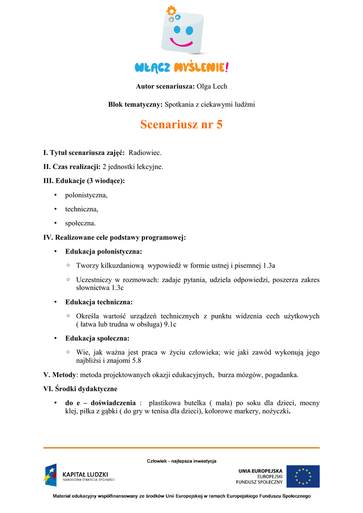 Autor scenariusza: Olga Lech Blok tematyczny: Spotkania z ciekawymi ludźmi Scenariusz nr 5 I. Tytuł scenariusza zajęć: Radiowiec. II. Czas realizacji: 2 jednostki lekcyjne. III. Edukacje (3 wiodące): • polonistyczna, • techniczna, • społeczna. IV. Realizowane cele podstawy programowej: • Edukacja polonistyczna: ◦ Tworzy kilkuzdaniową wypowiedź w formie ustnej i pisemnej 1.3a ◦ Uczestniczy w rozmowach: zadaje pytania, udziela odpowiedzi, poszerza zakres słownictwa 1.3c • Edukacja techniczna: ◦ Określa wartość urządzeń technicznych z punktu widzenia cech użytkowych ( łatwa lub trudna w obsługa) 9.1c • Edukacja społeczna: ◦ Wie, jak ważna jest praca w życiu człowieka; wie jaki zawód wykonują jego najbliżsi i znajomi 5.8 V. Metody: metoda projektowanych okazji edukacyjnych, burza mózgów, pogadanka. VI. Środki dydaktyczne • do e – doświadczenia : plastikowa butelka ( mała) po soku dla dzieci, mocny klej, piłka z gąbki ( do gry w tenisa dla dzieci), kolorowe markery, nożyczki. VII. Forma zajęć: indywidualna, praca w grupach, praca z całym zespołem. VIII. Przebieg zajęć: • Część wprowadzająca – warunki wyjściowe. ◦ Uczniowie rozwiązują krzyżówkę i odczytują hasło, które jest tematem lekcji. ◦ W tym miesiącu rozpoczyna się wiosna. ◦ Jeden z symboli narodowych naszego kraju. ◦ Nazwa zegara, który odmierza czas przesypując ziarnka piasku. ◦ Państwo tulipanów i wiatraków. ◦ Część mowy, która odpowiada na pytanie: co robi? ◦ Wyjaśnienie znaczenia słowa radio. ◦ Radio to urządzenie elektryczne przekazujące wiadomości na odległość za pomocą fal elektromagnetycznych. • Zadanie otwarte. ◦ Jakiego typu programy możemy usłyszeć w radio? • Część warsztatowa. ◦ Wycieczka do pobliskiego radia – uczniowie zwiedzają wnętrza studia radiowego( studio reżysera dźwięku, studio emisyjne, pokój wydawcy/ telefonisty, reżyserka, studio produkcyjne). Zapoznają się z pracą dziennikarza radiowego. Słuchają informacji na temat przygotowania audycji radiowej oraz etapów powstawania audycji radiowej. Poznają nazwy wyposażenia studia nagrań (konsoleta cyfrowa, komputer, magnetofony, CD, mikrofony, słuchawki). Poznają osoby, które pracują nad powstaniem audycji radiowej ( dziennikarz, reżyser, dźwiękowiec, scenarzysta) • E – doświadczenie (załącznik do scenariusza zajęć). • Pytania/ zadania/ inne czynności pozwalające utrwalanie wiedzy: ◦ Uczniowie wcielają się w rolę prezentera radiowego i biorą udział w nagraniu audycji, której będą bohaterami: ▪ wspólnie zapowiadają audycję; ▪ rozmowa dziennikarza z dziećmi na temat miejscowości z której przybyli, szkoły i klasy, opowiadają za co lubią swoją szkołę i kim chcieliby zostać w przyszłości; ▪ uczniowie prezentują swoje talenty ( wspólnie śpiewają piosenkę i mówią wiersz); ▪ audycja kończy się pozdrowieniami ( każdy uczeń na antenie radia, przekazuje pozdrowienia wybranej przez siebie osobie) • Dodatkowe pytania/ zadania/ czynności dla: ◦ ucznia zdolnego – uczniowie piszą wypowiedź na temat „ Jakie znaczenie dla ludzi miało wynalezienie radia?” ◦ ucznia dziewięcioletniego – uczniowie tworzą i piszą rzeczowniki z cząstką – radio. ◦ ucznia ośmioletniego – uczniowie wyszukują w gazetach z programem radiowym tytuły audycji radiowych dla dzieci i wypisują je. ◦ ucznia wymagającego pomocy: uczniowie wykonują pracę plastyczną (malują, jak wyobrażają sobie pierwsze radio). • Podsumowanie zajęć: Praca radiowca jest bardzo ciekawa. Radio to tajemnicze miejsce, z którego nas słychać, ale nie widać. To teatr wyobraźni. • Propozycja pracy domowej: Napisz kilka zdań na temat: Czy chciałbyś/ chciałabyś pracować w radio? Uzasadnij swoją wypowiedź. Załącznik e- doświadczenia do scenariusza nr 5 I. Tytuł e- doświadczenia: Robimy mikrofon. II. Zakres doświadczenia: Wykonanie mikrofonu. III. Cel doświadczenia: Pokazanie, w jaki sposób można wykonać mikrofon do zabawy w radiowca. IV. Hipoteza doświadczenia: Jak zrobić mikrofon z plastikowej butelki? V. Spodziewane obserwacje/ wnioski uczniów: Z plastikowej butelki i piłeczki z gąbki można wykonać mikrofon – zabawkę. Trzeba w odpowiedni sposób połączyć elementy. VI. Wnioski z doświadczenia: Wykonanie mikrofonu jest proste i nie zajmuje wiele czasu. Daje nam możliwość dobrej zabawy i wcielenia się w rolę gwiazdy lub dziennikarza radiowego. Obraz Dźwięk Przywitanie dzieci przed telewizorem Witam Was mali odkrywcy. Wiem, że na przez aktora. dzisiejszej lekcji poznaliście pracę radiowca. Podstawowym elementem pracy w radio jest mikrofon. Na pewno każdy z was chciałby mieć swój własny mikrofon. Dzisiaj pokażę wam, jak w prosty sposób można wykonać mikrofon – zabawkę. Prezentacja środków do doświadczenia. Do przeprowadzenia dzisiejszego Zbliżenie na poszczególne przedmioty. doświadczenia będą mi potrzebne: plastikowa butelka ( mała) po soku dla dzieci, mocny klej, piłka z gąbki ( do gry w tenisa dla dzieci), kolorowe markery, nożyczki. Aktor wykonuje doświadczenie: mycie Plastikową butelkę ( bez nakrętki) po butelki, odklejanie naklejek, pisanie logo, wycinanie otworu w piłeczce z gąbki, smarowanie klejem piłeczki, umieszczanie piłeczki na butelce. soku dokładnie myję i odklejam z niej wszystkie naklejki. Kiedy butelka jest już czysta, piszę na niej logo ulubionej stacji radiowej oraz zdobię ją. Następnie w piłeczce z gąbki wycinam niewielki otwór, taki, abym mógł nałożyć gąbkę na otwór w butelce. Teraz smaruję wycięty w gąbce otwór klejem i umieszczam piłeczkę na butelce. Lekko wpycham piłeczkę w butelkę, żeby się dobrze przykleiła. Mikrofon gotowy. Teraz każdy z was młodzi odkrywcy może wcielić się w rolę dziennikarza radiowego. Prezentacja wniosków przez aktora. Wykonanie mikrofonu j