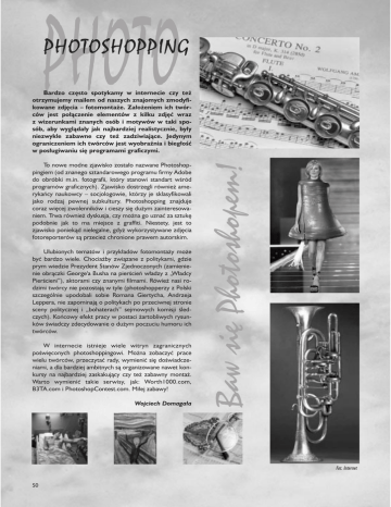 PHOTO PHOTOSHOPPING To nowe modne zjawisko zosta³o nazwane Photoshoppingiem (od znanego sztandarowego programu firmy Adobe do obróbki m.in. fotografii, który stanowi standart wœród programów graficznych). Zjawisko dostrzegli równie¿ amerykañcy naukowcy – socjologowie, którzy je sklasyfikowali jako rodzaj pewnej subkultury. Photoshopping znajduje coraz wiêcej zwolenników i cieszy siê du¿ym zainteresowaniem. Trwa równie¿ dyskusja, czy mo¿na go uznaæ za sztukê podobnie jak to ma miejsce z graffiti. Niestety, jest to zjawisko poniek¹d nielegalne, gdy¿ wykorzystywane zdjêcia fotoreporterów s¹ przecie¿ chronione prawem autorskim. Ulubionych tematów i przyk³adów fotomonta¿y mo¿e byæ bardzo wiele. Chocia¿by zwi¹zane z politykami, gdzie prym wiedzie Prezydent Stanów Zjednoczonych (zamienienie obr¹czki George'a Busha na pierœcieñ w³adzy z „W³adcy Pierœcieni”), aktorami czy znanymi filmami. Rówie¿ nasi rodzimi twórcy nie pozostaj¹ w tyle (photoshopperzy z Polski szczególnie upodobali sobie Romana Giertycha, Andrzeja Leppera, nie zapominaj¹ o politykach po przeciwnej stronie sceny politycznej i „bohaterach” sejmowych komisji œledczych). Koñcowy efekt pracy w postaci ¿artobliwych rysunków œwiadczy zdecydowanie o du¿ym poczuciu humoru ich twórców. W internecie istnieje wiele witryn zagranicznych poœwiêconych photoshoppingowi. Mo¿na zobaczyæ prace wielu twórców, przeczytaæ rady, wymieniæ siê doœwiadczeniami, a dla bardziej ambitnych s¹ organizowane nawet konkursy na najbardziej zaskakuj¹cy czy te¿ zabawny monta¿. Warto wymieniæ takie serwisy, jak: Worth1000.com, B3TA.com i PhotoshopContest.com. Mi³ej zabawy! Wojciech Domaga³a Baw siê Photoshopem! Bardzo czêsto spotykamy w internecie czy te¿ otrzymujemy mailem od naszych znajomych zmodyfikowane zdjêcia – fotomonta¿e. Za³o¿eniem ich twórców jest po³¹czenie elementów z kilku zdjêæ wraz z wizerunkami znanych osób i motywów w taki sposób, aby wygl¹da³y jak najbardziej realistycznie, by³y niezwykle zabawne czy te¿ zadziwiaj¹ce. Jedynym ograniczeniem ich twórców jest wyobraŸnia i bieg³oœæ w pos³ugiwaniu siê programami graficzymi. Fot. Internet 50