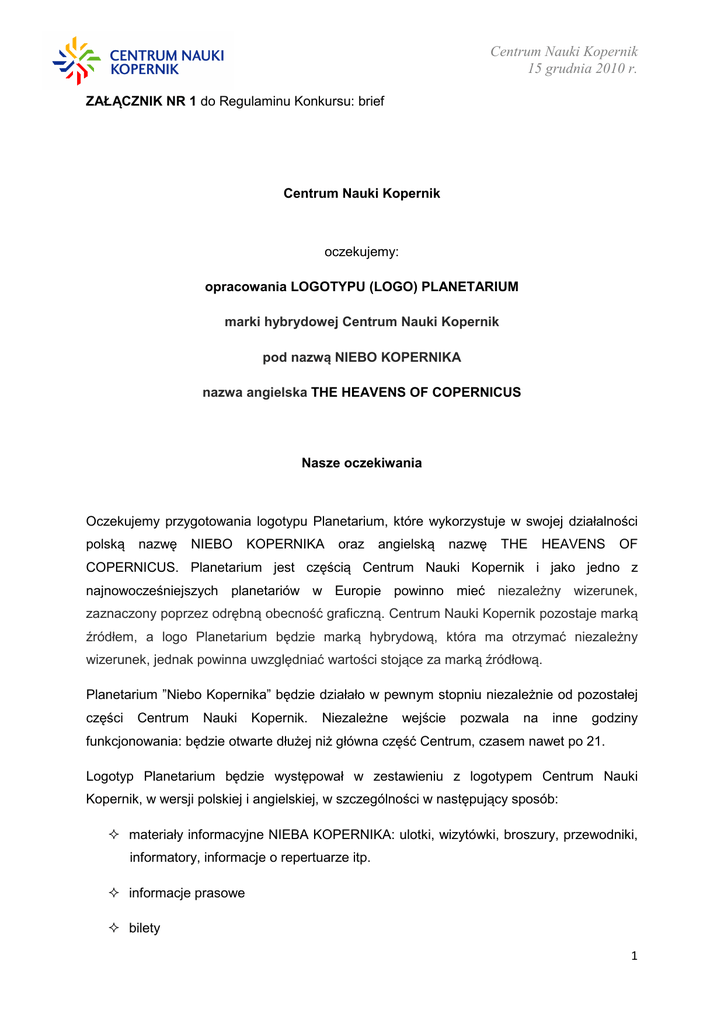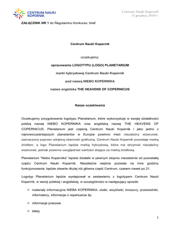 Centrum Nauki Kopernik 15 grudnia 2010 r. ZAŁĄCZNIK NR 1 do Regulaminu Konkursu: brief Centrum Nauki Kopernik oczekujemy: opracowania LOGOTYPU (LOGO) PLANETARIUM marki hybrydowej Centrum Nauki Kopernik pod nazwą NIEBO KOPERNIKA nazwa angielska THE HEAVENS OF COPERNICUS Nasze oczekiwania Oczekujemy przygotowania logotypu Planetarium, które wykorzystuje w swojej działalności polską nazwę NIEBO KOPERNIKA oraz angielską nazwę THE HEAVENS OF COPERNICUS. Planetarium jest częścią Centrum Nauki Kopernik i jako jedno z najnowocześniejszych planetariów w Europie powinno mieć niezależny wizerunek, zaznaczony poprzez odrębną obecność graficzną. Centrum Nauki Kopernik pozostaje marką źródłem, a logo Planetarium będzie marką hybrydową, która ma otrzymać niezależny wizerunek, jednak powinna uwzględniać wartości stojące za marką źródłową. Planetarium ”Niebo Kopernika” będzie działało w pewnym stopniu niezależnie od pozostałej części Centrum Nauki Kopernik. Niezależne wejście pozwala na inne godziny funkcjonowania: będzie otwarte dłużej niż główna część Centrum, czasem nawet po 21. Logotyp Planetarium będzie występował w zestawieniu z logotypem Centrum Nauki Kopernik, w wersji polskiej i angielskiej, w szczególności w następujący sposób: materiały informacyjne NIEBA KOPERNIKA: ulotki, wizytówki, broszury, przewodniki, informatory, informacje o repertuarze itp. informacje prasowe bilety 1 Centrum Nauki Kopernik 15 grudnia 2010 r. strona www prezentacje Power Point plakaty, billboardy reklamy prasowe reklamy telewizyjne reklamy internetowe reklamy na/w środkach komunikacji miejskiej reklamy na budynkach stanowiska i urządzenia ekspozycji pamiątki – koszulki, czapeczki, długopisy, gadżety do sklepiku. Prace konkursowe powinny proponować sposób korzystania z Logo w różnych sytuacjach. Założenia Logotyp ma stać się podstawowym elementem identyfikującym markę PLANETARIUM i jego działalność, taką jak np. multimedialne pokazy dające wrażenie zanurzenia w prezentowanej rzeczywistości, które wyświetlane będą na 16-metrowej kopule. Ma również identyfikować inne formy aktywności NIEBA KOPERNIKA, które będą dostosowane do gości w różnym wieku, o rozmaitych zainteresowaniach. Na półsferycznym ekranie Planetarium będą wyświetlane filmy popularnonaukowe i dokumentalne, spektakle naukowe, pokazy artystyczne, widowiska muzyczno-wizualne z zastosowaniem nowoczesnych technologii oraz projekcje astronomiczne z wykorzystaniem naziemnych i satelitarnych teleskopów. Planetarium będzie oczywiście pokazywało obrazy gwiaździstego nieba, ale nie tylko. Tematem wyświetlanych w Planetarium filmów będą przede wszystkim szeroko rozumiane treści z obszaru nauk przyrodniczych (podróż na statku wraz z Darwinem na Galapagos, „wizyta” we wnętrzu ludzkiego ciała i na dnie oceanów, podbój kosmosu) a także innych obszarów wiedzy – odwiedziny piramid Majów lub afrykańskich sawann i ich mieszkańców. Ważną częścią aktywności Planetarium będą pokazy artystyczne – rodzaj teledysków przy dźwiękach muzyki – oraz koncerty. 2 Centrum Nauki Kopernik 15 grudnia 2010 r. Przykładowy kadr z filmu w Planetarium Okoliczności Jak prezentuje się NIEBO KOPERNIKA Wewnątrz kopuły Planetarium znajdzie się ekran sferyczny o średnicy około 16m. Pod ekranem umieszczona będzie widownia Planetarium, która pomieści 140-160 osób. Z jej przodu będzie niewielka scena przeznaczona do występów artystycznych. Ekran (a więc i widownia) Planetarium będzie pochylony w jej kierunku pod kątem około 17 stopni. Kolejne rzędy foteli w miarę oddalania się od proscenium będą umieszczone coraz wyżej. Obrazy mają być wyświetlane na całej powierzchni kopuły. 3 Centrum Nauki Kopernik 15 grudnia 2010 r. Projekcje będą wyświetlane za pomocą projektora gwiazdowego, który ukazuje niezwykle wierny obraz rozgwieżdżonego nieba. Za pomocą cyfrowych rzutników będzie można pokazać na kopule dowolny obraz i film. Różnica w porównaniu z kinem jest jednak ogromna – w Planetarium obraz nas otacza, jesteśmy niemalże jego częścią, a nie jak w kinie patrzymy „z boku”. Dodatkowo w Planetarium będziemy też mieli aparaturę do pokazów laserowych w wypełniającym widownię dymie. Przykładowe pokazy laserowe w planetarium w Hamburgu Pokazy multimedialne popularnonaukowe. Seanse dla wszystkich grup wiekowych – od przedszkolaka do seniora. Programy popularnonaukowe (nie tylko astronomiczne, docelowo również biologiczne, chemiczne, geograficzne). Programy edukacyjne – realizujące szkolną podstawę programową. Pokazy rodzinne, dla rodziców z dziećmi. W Planetarium będziemy też organizować wykłady badaczy zajmujących się daną dziedziną wiedzy – będą one ilustrowane animowanymi projekcjami na całym ekranie Planetarium. . 4 Centrum Nauki Kopernik 15 grudnia 2010 r. Przykładowy kadr z seansu astronomicznego Działania z pogranicza nauki i sztuki. Koncerty (również muzyki klasycznej) pod gwiazdami, pokazy artystyczne (grafika, lasery + muzyka) oraz pokazy wieczorne, bardziej komercyjne – na zasadzie kosmicznych teledysków z muzyką i laserami. Docelowo część z tych pokazów będziemy produkowali samodzielnie. Eksponaty. W hallu Planetarium, a także w pobliżu wejścia na widownię, znajdzie się miejsce na interaktywne eksponaty, za pomocą których goście planetarium będą mogli prowadzić własne doświadczenia i samodzielnie „nawiązywać kontakt” z kosmosem. Wśród eksponatów znajdzie się m.in. kula, na której będzie można samodzielnie wyświetlić mapę – globus – wielu ciał niebieskich i Ziemi lub sprawdzić aktualną ziemską pogodę, a także eksponaty artystyczne, skłaniające do refleksji na temat miejsca człowieka we Wszechświecie. Eksponat Magic Planet 5 Centrum Nauki Kopernik 15 grudnia 2010 r. Skojarzenia i odbiór Logo Planetarium Logo P