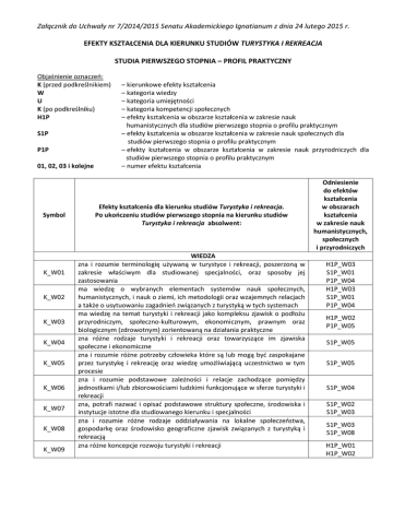 Załącznik do Uchwały nr 7/2014/2015 Senatu Akademickiego Ignatianum z dnia 24 lutego 2015 r. EFEKTY KSZTAŁCENIA DLA KIERUNKU STUDIÓW TURYSTYKA I REKREACJA STUDIA PIERWSZEGO STOPNIA – PROFIL PRAKTYCZNY Objaśnienie oznaczeń: K (przed podkreślnikiem) W U K (po podkreślniku) H1P S1P P1P 01, 02, 03 i kolejne Symbol K_W01 K_W02 K_W03 K_W04 K_W05 K_W06 K_W07 K_W08 K_W09 – kierunkowe efekty kształcenia – kategoria wiedzy – kategoria umiejętności – kategoria kompetencji społecznych – efekty kształcenia w obszarze kształcenia w zakresie nauk humanistycznych dla studiów pierwszego stopnia o profilu praktycznym – efekty kształcenia w obszarze kształcenia w zakresie nauk społecznych dla studiów pierwszego stopnia o profilu praktycznym – efekty kształcenia w obszarze kształcenia w zakresie nauk przyrodniczych dla studiów pierwszego stopnia o profilu praktycznym – numer efektu kształcenia Efekty kształcenia dla kierunku studiów Turystyka i rekreacja. Po ukończeniu studiów pierwszego stopnia na kierunku studiów Turystyka i rekreacja absolwent: WIEDZA zna i rozumie terminologię używaną w turystyce i rekreacji, poszerzoną w zakresie właściwym dla studiowanej specjalności, oraz sposoby jej zastosowania ma wiedzę o wybranych elementach systemów nauk społecznych, humanistycznych, i nauk o ziemi, ich metodologii oraz wzajemnych relacjach a także o usytuowaniu zagadnień związanych z turystyką w tych systemach ma wiedzę na temat turystyki i rekreacji jako kompleksu zjawisk o podłożu przyrodniczym, społeczno-kulturowym, ekonomicznym, prawnym oraz biologicznym (zdrowotnym) zorientowaną na działania praktyczne zna różne rodzaje turystyki i rekreacji oraz towarzyszące im zjawiska społeczne i ekonomiczne zna i rozumie różne potrzeby człowieka które są lub mogą być zaspokajane przez turystykę i rekreację oraz wiedzę umożliwiającą uczestnictwo w tym procesie zna i rozumie podstawowe zależności i relacje zachodzące pomiędzy jednostkami i/lub zbiorowościami ludzkimi funkcjonujące w sferze turystyki i rekreacji zna, potrafi nazwać i opisać podstawowe struktury społeczne, środowiska i instytucje istotne dla studiowanego kierunku i specjalności zna i rozumie różne rodzaje oddziaływania na lokalne społeczeństwa, gospodarkę oraz środowisko geograficzne zjawisk związanych z turystyką i rekreacją zna różne koncepcje rozwoju turystyki i rekreacji Odniesienie do efektów kształcenia w obszarach kształcenia w zakresie nauk humanistycznych, społecznych i przyrodniczych H1P_W03 S1P_W01 P1P_W04 H1P_W03 S1P_W01 P1P_W04 H1P_W02 P1P_W05 S1P_W05 S1P_W05 S1P_W04 S1P_W02 S1P_W03 S1P_W03 S1P_W08 H1P_W01 H1P_W02 K_W10 zna elementy składowe rynku turystycznego, charakterystyczne dla studiowanej specjalności w szczególności K_W14 ma wiedzę o tradycji i współczesnych przeobrażeniach ruchu turystycznego, zwłaszcza dotyczących studiowanej specjalności ma podstawową wiedzę o projektowaniu i prowadzeniu działalności gospodarczej w turystyce, zwłaszcza w odniesieniu do studiowanej specjalności zna powiązania prawne, organizacyjne, funkcjonalne podstawowych segmentów rynku turystycznego, w szczególności dla studiowanej specjalności zna problemy, potrzeby i oczekiwania podmiotów uczestniczących w turystyce i rekreacji K_W15 ma wiedzę umożliwiającą praktyczną działalność turystyczną i rekreacyjną , zwłaszcza w odniesieniu do studiowanej specjalności K_W11 K_W12 K_W13 K_W16 K_W17 K_W18 K_W19 K_W20 K_U01 K_U02 K_U03 K_U04 K_U05 K_U06 zna podstawy systemu bezpieczeństwa i zasady higieny pracy w ruchu turystycznym, ich praktyczne uwarunkowania oraz realizacje zna sposoby konstruowania i kontrolowania własnej ścieżki kariery zawodowej posiada wiedzę dotyczącą prawidłowego komunikowania się z ludźmi (także w języku obcym) oraz nawiązywania prawidłowych relacji społecznych, a także podejmowania decyzji zgodnych z zasadami etyki ma podstawową wiedzę o przestrzeni geograficznej, szczególnie w obszarze studiowanej specjalności, umożliwiającą prawidłowe funkcjonowanie w dziedzinie turystyki i rekreacji Ma podstawową dotyczącą funkcjonowania organizmu ludzkiego UMIEJĘTNOŚCI potrafi opisywać i interpretować, na podstawie kompilacji wiedzy z różnych źródeł i/lub własnych doświadczeń/praktyki podstawowe struktury przestrzenne, ekonomiczne i społeczne mające związek z branżą turystyczną na podstawie własnej obserwacji potrafi rozpoznawać i analizować różne zjawiska generowane w związku z turystyką i rekreacją oraz przez turystykę i rekreację, i inne, odniesione do studiowanej specjalności potrafi wykorzystać zdobytą wiedzę teoretyczną w odniesieniu do konkretnych sytuacji praktyki turystyki i rekreacji (ekonomicznej, marketingowej, interpersonalnej, prawnej, ekologicznej) umie, na podstawie posiadanej wiedzy teoretycznej, rozpoznać, opisać, interpretować motywy oraz sposoby zachowań organizatorów i animatorów procesów w biznesie turystycznym oraz klientów branży turystycznej umie, na podstawie posiadanej wiedzy teoretycznej, rozpoznać, opisać, interpretować potencjał turystyczny wybranych regionów, szczególnie związanych ze studiowaną specjalnością umie, na podstawie posiadanej wiedzy teoretycznej, rozpoznać, opisać, interpretować zjawiska społeczne (także w ujęciu historycznym) i przyrodnicze mające odniesienie do turystyki i rekreacji oraz przewidywać wybrane ich skutki H1P_W05 S1P_W02 S1P_W03 S1P_W07 H1P_W02 S1P_W08 S1P_W06 H1P_W06 H1P_W07 S1P_W09 H1P_W08 S1P_W04 P1P_W05 H1P_W07 S1P_W11 P1P_W11 H1P_W09 P1P_W09 S1P_W11 P1P_W11 S1P_W07 P1P_W01 P1P_W05 P1P_W08 S1P_W01 S1P_U01 S1P_U08 P1P_U03 S1P_U01 S1P_U08 P1P_U04 P1P_U07 H1P_U02 S1P_U01 S1P_U02 S1P_U06 S1P_U01 S1P_U02 S1P_U03 S1P_U08 P1P_U07 S1P_U01 S1P_U02 P1P_U07 S1P_U03 S1P_U04 K_U07 K_U08 K_U09 K_U10 umie pracować nad własnym doskonaleniem, w szczególności zawodowym, z wykorzyst