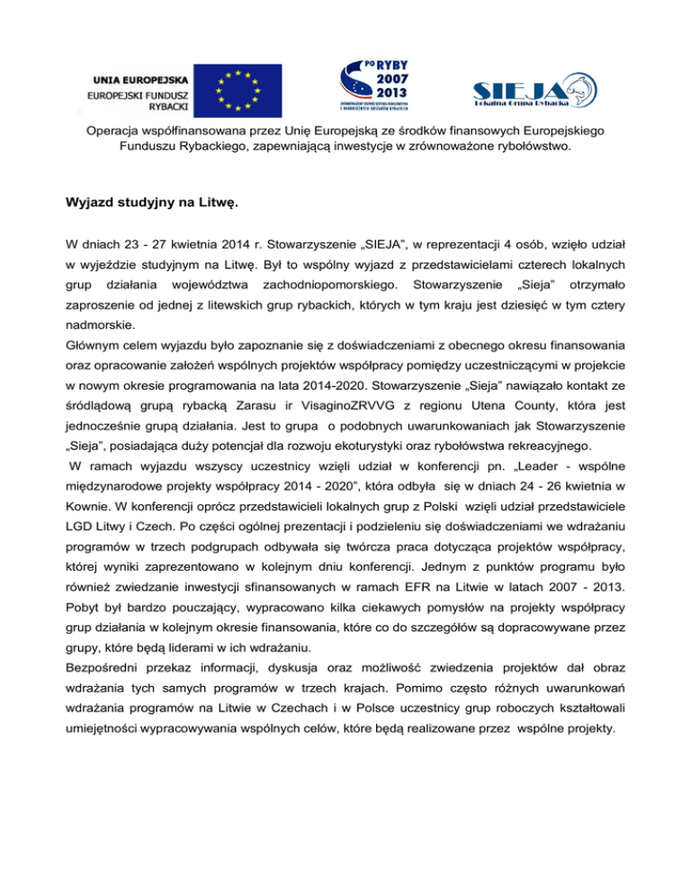 Operacja współfinansowana przez Unię Europejską ze środków finansowych Europejskiego Funduszu Rybackiego, zapewniającą inwestycje w zrównoważone rybołówstwo. Wyjazd studyjny na Litwę. W dniach 23 - 27 kwietnia 2014 r. Stowarzyszenie „SIEJA”, w reprezentacji 4 osób, wzięło udział w wyjeździe studyjnym na Litwę. Był to wspólny wyjazd z przedstawicielami czterech lokalnych grup działania województwa zachodniopomorskiego. Stowarzyszenie „Sieja” otrzymało zaproszenie od jednej z litewskich grup rybackich, których w tym kraju jest dziesięć w tym cztery nadmorskie. Głównym celem wyjazdu było zapoznanie się z doświadczeniami z obecnego okresu finansowania oraz opracowanie założeń wspólnych projektów współpracy pomiędzy uczestniczącymi w projekcie w nowym okresie programowania na lata 2014-2020. Stowarzyszenie „Sieja” nawiązało kontakt ze śródlądową grupą rybacką Zarasu ir VisaginoZRVVG z regionu Utena County, która jest jednocześnie grupą działania. Jest to grupa o podobnych uwarunkowaniach jak Stowarzyszenie „Sieja”, posiadająca duży potencjał dla rozwoju ekoturystyki oraz rybołówstwa rekreacyjnego. W ramach wyjazdu wszyscy uczestnicy wzięli udział w konferencji pn. „Leader - wspólne międzynarodowe projekty współpracy 2014 - 2020”, która odbyła się w dniach 24 - 26 kwietnia w Kownie. W konferencji oprócz przedstawicieli lokalnych grup z Polski wzięli udział przedstawiciele LGD Litwy i Czech. Po części ogólnej prezentacji i podzieleniu się doświadczeniami we wdrażaniu programów w trzech podgrupach odbywała się twórcza praca dotycząca projektów współpracy, której wyniki zaprezentowano w kolejnym dniu konferencji. Jednym z punktów programu było również zwiedzanie inwestycji sfinansowanych w ramach EFR na Litwie w latach 2007 - 2013. Pobyt był bardzo pouczający, wypracowano kilka ciekawych pomysłów na projekty współpracy grup działania w kolejnym okresie finansowania, które co do szczegółów są dopracowywane przez grupy, które będą liderami w ich wdrażaniu. Bezpośredni przekaz informacji, dyskusja oraz możliwość zwiedzenia projektów dał obraz wdrażania tych samych programów w trzech krajach. Pomimo często różnych uwarunkowań wdrażania programów na Litwie w Czechach i w Polsce uczestnicy grup roboczych kształtowali umiejętności wypracowywania wspólnych celów, które będą realizowane przez wspólne projekty.