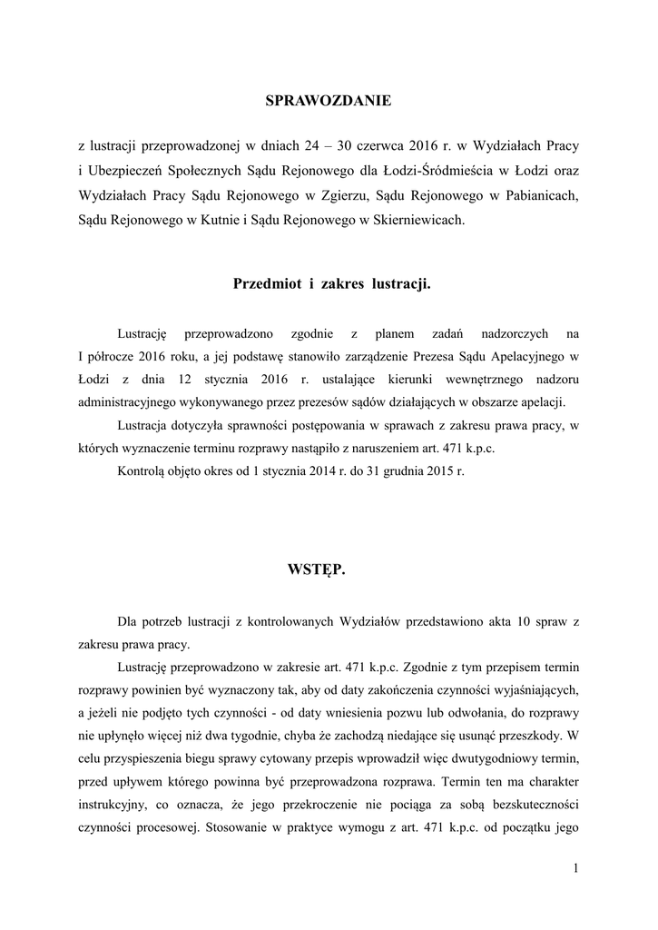 SPRAWOZDANIE z lustracji przeprowadzonej w dniach 24 – 30 czerwca 2016 r. w Wydziałach Pracy i Ubezpieczeń Społecznych Sądu Rejonowego dla Łodzi-Śródmieścia w Łodzi oraz Wydziałach Pracy Sądu Rejonowego w Zgierzu, Sądu Rejonowego w Pabianicach, Sądu Rejonowego w Kutnie i Sądu Rejonowego w Skierniewicach. Przedmiot i zakres lustracji. Lustrację przeprowadzono zgodnie z planem zadań nadzorczych na I półrocze 2016 roku, a jej podstawę stanowiło zarządzenie Prezesa Sądu Apelacyjnego w Łodzi z dnia 12 stycznia 2016 r. ustalające kierunki wewnętrznego nadzoru administracyjnego wykonywanego przez prezesów sądów działających w obszarze apelacji. Lustracja dotyczyła sprawności postępowania w sprawach z zakresu prawa pracy, w których wyznaczenie terminu rozprawy nastąpiło z naruszeniem art. 471 k.p.c. Kontrolą objęto okres od 1 stycznia 2014 r. do 31 grudnia 2015 r. WSTĘP. Dla potrzeb lustracji z kontrolowanych Wydziałów przedstawiono akta 10 spraw z zakresu prawa pracy. Lustrację przeprowadzono w zakresie art. 471 k.p.c. Zgodnie z tym przepisem termin rozprawy powinien być wyznaczony tak, aby od daty zakończenia czynności wyjaśniających, a jeżeli nie podjęto tych czynności - od daty wniesienia pozwu lub odwołania, do rozprawy nie upłynęło więcej niż dwa tygodnie, chyba że zachodzą niedające się usunąć przeszkody. W celu przyspieszenia biegu sprawy cytowany przepis wprowadził więc dwutygodniowy termin, przed upływem którego powinna być przeprowadzona rozprawa. Termin ten ma charakter instrukcyjny, co oznacza, że jego przekroczenie nie pociąga za sobą bezskuteczności czynności procesowej. Stosowanie w praktyce wymogu z art. 471 k.p.c. od początku jego 1 obowiązywania miało charakter iluzoryczny, jako zdeterminowane realnymi możliwościami sądów pracy. Od dnia 3 maja 2012 r. stosowanie tego przepisu doznało dalszego ograniczenia. Z tą bowiem datą ustawa z dnia 16 września 2011 r. o zmianie ustawy - Kodeks postępowania cywilnego oraz niektórych innych ustaw (Dz. U. Nr 233 poz. 1381) znowelizowała art. 207 k.p.c. w § 2. Zgodnie z tą zmianą, przewodniczący może zarządzić wniesienie odpowiedzi na pozew w wyznaczonym terminie nie krótszym niż dwa tygodnie. Skoro doręczenie pozwu zarządzane jest jednocześnie z wyznaczeniem pierwszej rozprawy (art. 206 § 1 zd. 2 k.p.c.), a wniesienie odpowiedzi na pozew może nastąpić w terminie nie krótszym niż dwa tygodnie, to nie jest w tych warunkach procesowych możliwe przeprowadzenie rozprawy przed upływem dwutygodniowego terminu, o którym mowa w przepisie art. 471 k.p.c. W każdej zatem sprawie, w której przewodniczący zarządzi wniesienie odpowiedzi na pozew (w sprawach z zakresu prawa pracy jest to regułą) dojdzie do naruszenia przepisu stanowiącego przedmiot niniejszej lustracji. Niezależnie od tej przeszkody obiektywnie uniemożliwiającej prawidłowe stosowanie art. 471 k.p.c. dokonano badań aktowych nadesłanych do lustracji spraw. Ustalenia lustracji – badanie aktowe. ( ….. ) Wnioski końcowe. Badanie akt nadesłanych spraw pozwala na stwierdzenie, że nie miały miejsca znaczące uchybienia wymagające podejmowania działań z zakresu wewnętrznego nadzoru administracyjnego wykonywanego przez prezesów sądów działających w obszarze apelacji. Analizowane postępowania nie budzą zastrzeżeń w zakresie wyznaczonym przedmiotem lustracji albowiem niezależnie od przyczyn o charakterze ustawodawczym powołanych w części wstępnej - do wyznaczenia terminu rozprawy z naruszeniem art. 471 k.p.c. dochodziło z innych, równie obiektywnych przyczyn. Należą do nich w szczególności: wywołana wielkością wpływu spraw konieczność wyznaczania sesji z 2 dużym wyprzedzeniem, orzekanie przez sędziów niektórych Sądów także w innych wydziałach niż wydziały pracy, podejmowanie czynności i dokonywanie niezbędnych rozstrzygnięć procesowych poprzedzających dopuszczalne wyznaczenie pierwszej rozprawy. W powyższych uwarunkowaniach i wobec niestwierdzenia rażącego naruszenia dyspozycji art. 471 k.p.c. odstępuję od wydania zaleceń polustracyjnych. Łódź, dnia 22 lipca 2016 r. Wizytator ds. pracy i ubezpieczeń społecznych Sądu Okręgowego w Łodzi Karol Kotyński 3