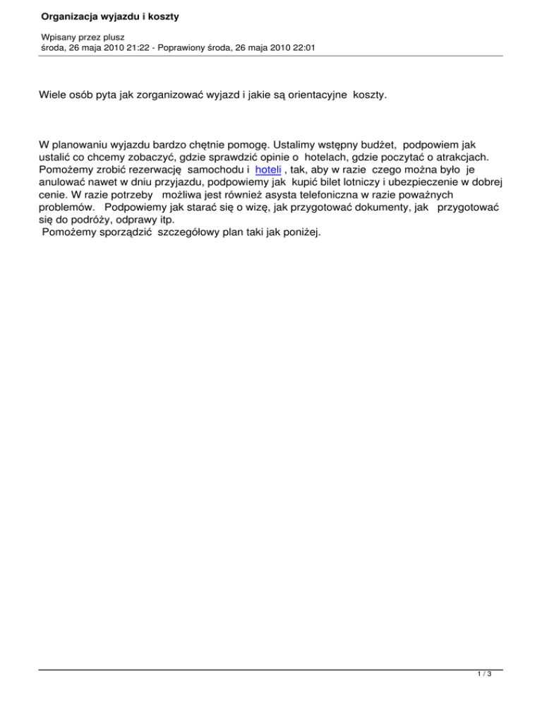Organizacja wyjazdu i koszty Wpisany przez plusz środa, 26 maja 2010 21:22 - Poprawiony środa, 26 maja 2010 22:01 Wiele osób pyta jak zorganizować wyjazd i jakie są orientacyjne koszty. W planowaniu wyjazdu bardzo chętnie pomogę. Ustalimy wstępny budżet, podpowiem jak ustalić co chcemy zobaczyć, gdzie sprawdzić opinie o hotelach, gdzie poczytać o atrakcjach. Pomożemy zrobić rezerwację samochodu i hoteli , tak, aby w razie czego można było je anulować nawet w dniu przyjazdu, podpowiemy jak kupić bilet lotniczy i ubezpieczenie w dobrej cenie. W razie potrzeby możliwa jest również asysta telefoniczna w razie poważnych problemów. Podpowiemy jak starać się o wizę, jak przygotować dokumenty, jak przygotować się do podróży, odprawy itp. Pomożemy sporządzić szczegółowy plan taki jak poniżej. 1/3 Organizacja wyjazdu i koszty Wpisany przez plusz środa, 26 maja 2010 21:22 - Poprawiony środa, 26 maja 2010 22:01 Koszt miarę godzina dopracowujemy pozwala raz miejsca galerię pierwszy. samodzielne takiej zdjęć analizy, należy na znaczne usługi w Opowiemy sieci. omijać. szczegóły. później jest i posługują oszczędności zależny Po iprzygotowujemy pokażemy powrocie Koszt się od naszej czasu językiem podczas pomożemy zdjęcia, wymaganego pracy siępodróży angielskim do doradzimy toopracować kolejnego ok 100 i uniknięcie zczas naszej gdzie zł spotkania za płyty wymagany godzinę warto strony. ze błędów zdjęciami się i wpracy, Dla do zatrzymać, ciągu osoby przygotowania osób, co oraz 1-2 podróżującej oczywiście które godzin utworzyć a które są w to po 1 2/3 Organizacja wyjazdu i koszty Wpisany przez plusz środa, 26 maja 2010 21:22 - Poprawiony środa, 26 maja 2010 22:01 Miejsca, które warto odwiedzić i o których poczytać: Andamany Havelock Port Blair Neil Island Elephant Beach Red Skin Jolly Buoy Diwali Latające ryby Cellular Jail --dzień Port Blair Beach number 7od (RadhaNagar) Chennai Określenie kosztów wyjazdu do Indii Koszt wydatków zobaczyć. jest zależny na jedzenie. od kilku W przypadku czynników Indii -doświadczenia ceny musimy biletu dokładnie lotniczego, kosztów gdzie noclegów chcemy oraz jechać i się co z Unikamy niestety mniejszym bezpieczeństwem lub rozwiązywanie nie najtańszych komfortem mamy (a problemów. takiej raczej pobytu miejsc gwarancji. poczuciem noclegowych. lub po Z prostu bezpieczeństwa) mało Mogą atrakcyjną one wiemy, co i prawda tracimy dzielnicą, że niższa być czas dobrej mniejszym na cena jakości, zwykle do wiąże ale atrakcji Orientacyjne koszty wyjazdu na dla dwóch osób, 12 dni, 9Andamanach. noclegów Zakładamy obniżyć, autobusem, najtańszych za zależy przy ok. raczej sami "chatkach", głównie założeniu, 220 kupujemy komfortowe PLN na że ceny przykład lecimy bilety biletu wakacyjne na zAndamany oraz kilkoma w prom, bazie wybranego warunki. sami przesiadkami, nurkowej. walczymy Przy standardu BTW. pewnym poruszamy z określić insektami ceny hotelu wysiłku nurkowania na się :) można idotarcie na mieszkamy Andamanach tokoszty ok 3000 w jeszcze INR przelot do Chennai 5300-8000 przelot do Port Blair 1200-2100 noclegi i asysta lokalnego biura, bilety na prom 1200-3500 PLN wyżywienie 500-1500 PLN szczepienia 400 PLN ubezpieczenie, wizai wstępne 1000 PLN RAZEM: 9600 - mieć 16500 PLN Aby rozpocząć kupić bilet planowanie w dobrej cenie oraz rezerwacje możliwość ok 3-4 wyboru miesiąceatrakcyjnych przed wyjazdem. noclegów, warto 3/3