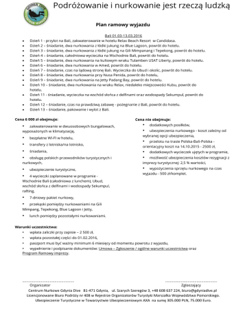 Podróżowanie i nurkowanie jest rzeczą ludzką Plan ramowy wyjazdu Bali 01.03-13.03.2016 Dzień 1 - przylot na Bali, zakwaterowanie w hotelu Relax Beach Resort w Candidasa. Dzień 2 – śniadanie, dwa nurkowania z łódki jukung na Blue Lagoon, powrót do hotelu. Dzień 3 – śniadanie, dwa nurkowania z łódki jukung na Gili Mimpanang i Tepekong, powrót do hotelu. Dzień 4 – śniadanie, całodniowa wycieczka na Wschodnie Bali, powrót do hotelu. Dzień 5 – śniadanie, dwa nurkowania na kultowym wraku Tulamben USAT Liberty, powrót do hotelu. Dzień 6 – śniadanie, dwa nurkowania w Amed, powrót do hotelu. Dzień 7 – śniadanie, czas na lądową stronę Bali. Wycieczka do Ubud i okolic, powrót do hotelu. Dzień 8 – śniadanie, dwa nurkowania przy Nusa Penida, powrót do hotelu, Dzień 9 – śniadanie, dwa nurkowania na Jetty Padang Bay, powrót do hotelu. Dzień 10 – śniadanie, dwa nurkowania na wraku Relax, niedaleko miejscowości Kubu, powrót do hotelu. Dzień 11 - śniadanie, wycieczka na wschód słońca z delfinami oraz wodospady Sekumpul, powrót do hotelu. Dzień 12 – śniadanie, czas na prawdziwą zabawę - pożegnanie z Bali, powrót do hotelu. Dzień 13 – śniadanie, pakowanie i wylot z Bali. Cena 6 000 zł obejmuje: • zakwaterowanie w dwuosobowych bungalowach, wyposażonych w klimatyzację, • • • • bezpłatne WI-FI w hotelu, • • ubezpieczenie turystyczne, • • 7-dniowy pakiet nurkowy, • lunch pomiędzy pozostałymi nurkowaniami. transfery z lotniska/na lotnisko, śniadania, obsługę polskich przewodników turystycznych i nurkowych, 4 wycieczki zaplanowane w programie Wschodnie Bali (całodniowa z lunchem), Ubud, wschód słońca z delfinami i wodospady Sekumpul, rafting, Cena nie obejmuje: • • dodatkowych posiłków, ubezpieczenia nurkowego - koszt zależny od wybranej opcji ubezpieczenia, • przelotu na trasie Polska-Bali-Polska orientacyjny koszt na 14.10.2015 - 2500 zł, • • dodatkowych wycieczek ujętych w programie, możliwość ubezpieczenia kosztów rezygnacji z imprezy turystycznej: 2,5 % wartości, • wypożyczenia sprzętu nurkowego na czas wyjazdu - 500 zł/komplet. przekąski pomiędzy nurkowaniami na Gili Mimpang, Tepekong, Blue Lagoon i Jetty, Warunki uczestnictwa: • • • • wpłata zaliczki przy zapisie – 2 500 zł, wpłata pozostałej części do 01.02.2016, paszport musi być ważny minimum 6 miesięcy od momentu powrotu z wyjazdu, wypełnienie i podpisanie dokumentów: Umowa – Zgłoszenie / ogólne warunki uczestnictwa oraz Program Ramowy imprezy. …………………………………………….. Organizator …………………………………………….. Zgłaszający Centrum Nurkowe Gdynia Dive 81-471 Gdynia, ul. Szarych Szeregów 3, +48 608 637 224, [email protected] Licencjonowane Biuro Podróży nr 408 w Rejestrze Organizatorów Turystyki Marszałka Województwa Pomorskiego. Ubezpieczenie Turystyczne w Towarzystwie Ubezpieczeniowym AXA na sumę 305.000 PLN, 75.000 Euro.