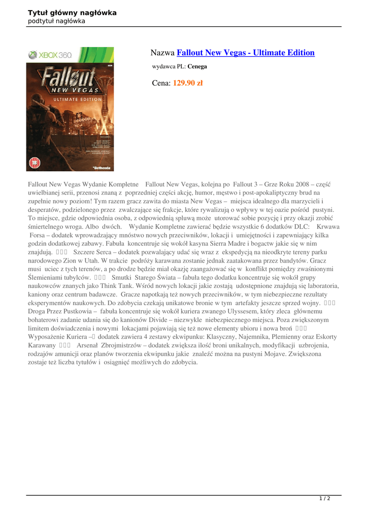 Tytuł główny nagłówka podtytuł nagłówka Nazwa Fallout New Vegas - Ultimate Edition wydawca PL: Cenega Cena: 129.90 zł Fallout New Vegas Wydanie Kompletne Fallout New Vegas, kolejna po Fallout 3 – Grze Roku 2008 – część uwielbianej serii, przenosi znaną z poprzedniej części akcję, humor, męstwo i post-apokaliptyczny brud na zupełnie nowy poziom! Tym razem gracz zawita do miasta New Vegas – miejsca idealnego dla marzycieli i desperatów, podzielonego przez zwalczające się frakcje, które rywalizują o wpływy w tej oazie pośród pustyni. To miejsce, gdzie odpowiednia osoba, z odpowiednią spluwą może utorować sobie pozycję i przy okazji zrobić śmiertelnego wroga. Albo dwóch. Wydanie Kompletne zawierać będzie wszystkie 6 dodatków DLC: Krwawa Forsa – dodatek wprowadzający mnóstwo nowych przeciwników, lokacji i umiejętności i zapewniający kilka godzin dodatkowej zabawy. Fabuła koncentruje się wokół kasyna Sierra Madre i bogactw jakie się w nim znajdują. Szczere Serca – dodatek pozwalający udać się wraz z ekspedycją na nieodkryte tereny parku narodowego Zion w Utah. W trakcie podróży karawana zostanie jednak zaatakowana przez bandytów. Gracz musi uciec z tych terenów, a po drodze będzie miał okazję zaangażować się w konflikt pomiędzy zwaśnionymi Ślemieniami tubylców. Smutki Starego Świata – fabuła tego dodatku koncentruje się wokół grupy naukowców znanych jako Think Tank. Wśród nowych lokacji jakie zostają udostępnione znajdują się laboratoria, kaniony oraz centrum badawcze. Gracze napotkają też nowych przeciwników, w tym niebezpieczne rezultaty eksperymentów naukowych. Do zdobycia czekają unikatowe bronie w tym artefakty jeszcze sprzed wojny. Droga Przez Pustkowia – fabuła koncentruje się wokół kuriera zwanego Ulyssesem, który zleca głównemu bohaterowi zadanie udania się do kanionów Divide – niezwykle niebezpiecznego miejsca. Poza zwiększonym limitem doświadczenia i nowymi lokacjami pojawiają się też nowe elementy ubioru i nowa broń Wyposażenie Kuriera – dodatek zawiera 4 zestawy ekwipunku: Klasyczny, Najemnika, Plemienny oraz Eskorty Karawany Arsenał Zbrojmistrzów – dodatek zwiększa ilość broni unikalnych, modyfikacji uzbrojenia, rodzajów amunicji oraz planów tworzenia ekwipunku jakie znaleźć można na pustyni Mojave. Zwiększona zostaje też liczba tytułów i osiągnięć możliwych do zdobycia. 1/2 Tytuł główny nagłówka podtytuł nagłówka Nazwa Wartość Wydawca PL Cenega Poland Data premiery 10-go lutego 2012 Producent Tryb gry Kategoria wiekowa Wersja językowa Wymagania sprzętowe Format Obsidian Entertainment Single Player 18+ ENG Konsola Xbox 360 1xDVD 2/2