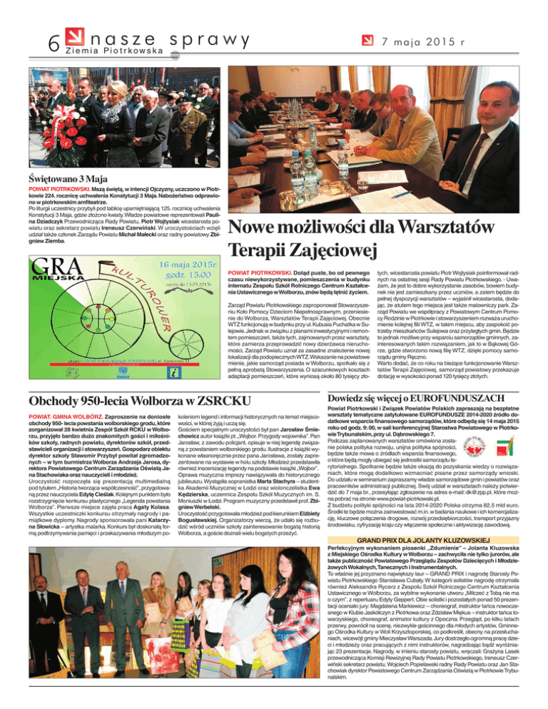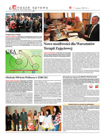 6 nasze sprawy 7 maja 2015 r Z i e m i a Pi o t r kow s k a Świętowano 3 Maja POWIAT PIOTRKOWSKI. Mszą świętą, w intencji Ojczyzny, uczczono w Piotrkowie 224. rocznicę uchwalenia Konstytucji 3 Maja. Nabożeństwo odprawiono w piotrkowskim amfiteatrze. Po liturgii uczestnicy przybyli pod tablicę upamiętniającą 125. rocznicę uchwalenia Konstytucji 3 Maja, gdzie złożono kwiaty.Władze powiatowe reprezentowali Paulina Dziadczyk Przewodnicząca Rady Powiatu, Piotr Wojtysiak wicestarosta powiatu oraz sekretarz powiatu Ireneusz Czerwiński. W uroczystościach wzięli udział także członek Zarządu Powiatu Michał Małecki oraz radny powiatowy Zbigniew Ziemba. Nowe możliwości dla Warsztatów Terapii Zajęciowej POWIAT PIOTRKOWSKI. Dotąd puste, bo od pewnego czasu niewykorzystywane, pomieszczenia w budynku internatu Zespołu Szkół Rolniczego Centrum Kształcenia Ustawicznego w Wolborzu, znów będą tętnić życiem. Zarząd Powiatu Piotrkowskiego zaproponował Stowarzyszeniu Koło Pomocy Dzieciom Niepełnosprawnym, przeniesienie do Wolborza, Warsztatów Terapii Zajęciowej. Obecnie WTZ funkcjonują w budynku przy ul.Kubusia Puchatka w Sulejowie.Jednak w związku z planami inwestycyjnymi i remontem pomieszczeń, także tych, zajmowanych przez warsztaty, które zamierza przeprowadzić nowy dzierżawca nieruchomości, Zarząd Powiatu uznał za zasadne znalezienie nowej lokalizacji dla podopiecznych WTZ.Wskazanie na powiatowe mienie, jakie samorząd posiada w Wolborzu, spotkało się z pełną aprobatą Stowarzyszenia. O szacunkowych kosztach adaptacji pomieszczeń, które wyniosą około 80 tysięcy zło- Obchody 950-lecia Wolborza w ZSRCKU POWIAT. GMINA WOLBÓRZ. Zaproszenie na doniosłe obchody 950- lecia powstania wolborskiego grodu, które zorganizował 28 kwietnia Zespół Szkół RCKU w Wolborzu, przyjęło bardzo dużo znakomitych gości i miłośników szkoły, radnych powiatu, dyrektorów szkół, przedstawicieli organizacji i stowarzyszeń. Gospodarz obiektu dyrektor szkoły Sławomir Przybył powitał zgromadzonych – w tym burmistrza Wolborza Andrzeja Jarosa, dyrektora Powiatowego Centrum Zarządzania Oświatą Jana Stachowiaka oraz nauczycieli i młodzież. Uroczystość rozpoczęła się prezentacją multimedialną pod tytułem „Historia tworząca współczesność”, przygotowaną przez nauczyciela Edytę Cieślak. Kolejnym punktem było rozstrzygnięcie konkursu plastycznego „Legenda powstania Wolborza”. Pierwsze miejsce zajęła praca Agaty Kolasa. Wszystkie uczestniczki konkursu otrzymały nagrody i pamiątkowe dyplomy. Nagrody sponsorowała pani Katarzyna Słowicka – artystka malarka. Konkurs był doskonałą formą podtrzymywania pamięci i przekazywania młodszym po- koleniom legend i informacji historycznych na temat miejscowości, w której żyją i uczą się. Gościem specjalnym uroczystości był pan Jarosław Śmiechowicz autor książki pt. „Wojbor. Przygody wojownika”. Pan Jarosław, z zawodu policjant, opisuje w niej legendę związaną z powstaniem wolborskiego grodu. Ilustracje z książki wykonane własnoręcznie przez pana Jarosława, zostały zaprezentowane na wystawie w holu szkoły. Młodzież przedstawiła również inscenizację legendy na podstawie książki „Wojbor”. Oprawa muzyczna imprezy nawiązywała do historycznego jubileuszu.Wystąpiła sopranistka Marta Stachyra – studentka Akademii Muzycznej w Łodzi oraz wiolonczelistka Ewa Kędzierska, uczennica Zespołu Szkół Muzycznych im. S. Moniuszki w Łodzi. Program muzyczny przedstawił prof. Zbigniew Werbelski. Uroczystość przygotowała młodzież pod kierunkiem Elżbiety Bogusławskiej. Organizatorzy wierzą, że udało się rozbudzić wśród uczniów szkoły zainteresowanie bogatą historią Wolborza, a goście doznali wielu bogatych przeżyć. tych, wicestarosta powiatu Piotr Wojtysiak poinformował radnych na ostatniej sesji Rady Powiatu Piotrkowskiego. - Uważam, że jest to dobre wykorzystanie zasobów, bowiem budynek nie jest zamieszkany przez uczniów, a zatem będzie do pełnej dyspozycji warsztatów – wyjaśnił wicestarosta, dodając, że atutem tego miejsca jest także malowniczy park. Zarząd Powiatu we współpracy z Powiatowym Centrum Pomocy Rodzinie w Piotrkowie i stowarzyszeniem rozważa uruchomienie kolejnej filii WTZ, w takim miejscu, aby zaspokoić potrzeby mieszkańców Sulejowa oraz przyległych gmin. Będzie to jednak możliwe przy wsparciu samorządów gminnych, zainteresowanych takim rozwiązaniem, jak to w Bąkowej Górze, gdzie stworzono nową filię WTZ, dzięki pomocy samorządu gminy Ręczno. Warto dodać, że co roku na bieżące funkcjonowanie Warsztatów Terapii Zajęciowej, samorząd powiatowy przekazuje dotację w wysokości ponad 120 tysięcy złotych. Dowiedz się więcej o EUROFUNDUSZACH Powiat Piotrkowski i Związek Powiatów Polskich zapraszają na bezpłatne warsztaty tematyczne zatytułowane EUROFUNDUSZE 2014-2020 źródło dodatkowe wsparcia finansowego samorządów, które odbędą się 14 maja 2015 roku od godz. 9: 00, w sali konferencyjnej Starostwa Powiatowego w Piotrkowie Trybunalskim, przy ul. Dąbrowskiego 7. Podczas zaplanowanych warsztatów omówiona zostanie polska polityka rozwoju, unijna polityka spójności, będzie także mowa o źródłach wsparcia finansowego, o które będą mogły ubiegać się jednostki samorządu terytorialnego. Spotkanie będzie także okazją do pozyskania wiedzy o rozwiązaniach, które mogą dodatkowo wzmacniać pisane przez samorządy wnioski. Do udziału w seminarium zapraszamy władze samorządowe gmin i powiatów oraz pracowników administracji publicznej. Swój udział w warsztatach należy potwierdzić do 7 maja br., przesyłając zgłoszenie na adres e-mail: [email protected], które można pobrać na stronie www.powiat-piotrkowski.pl. Z budżetu polityki spójności na lata 2014-2020 Polska otrzyma 82,5 mld euro. Środki te będzie można zainwestować m.in.w badania n