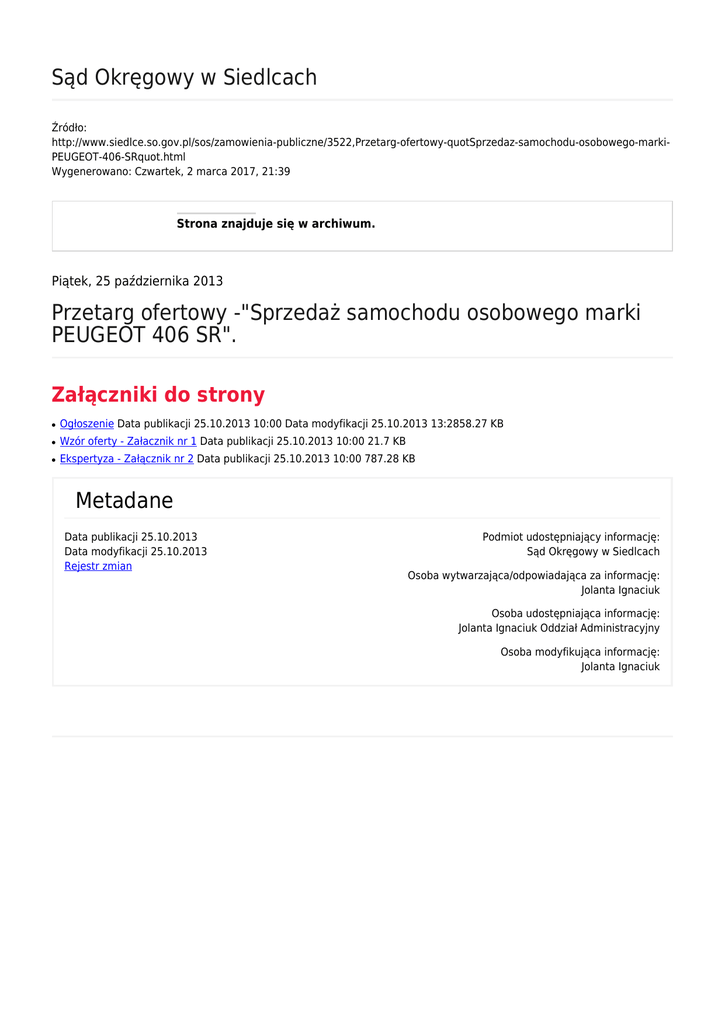 Sąd Okręgowy w Siedlcach Źródło: http://www.siedlce.so.gov.pl/sos/zamowienia-publiczne/3522,Przetarg-ofertowy-quotSprzedaz-samochodu-osobowego-markiPEUGEOT-406-SRquot.html Wygenerowano: Czwartek, 2 marca 2017, 21:39 Strona znajduje się w archiwum. Piątek, 25 października 2013 Przetarg ofertowy -"Sprzedaż samochodu osobowego marki PEUGEOT 406 SR". Załączniki do strony ● Ogłoszenie Data publikacji 25.10.2013 10:00 Data modyfikacji 25.10.2013 13:2858.27 KB ● Wzór oferty - Załacznik nr 1 Data publikacji 25.10.2013 10:00 21.7 KB ● Ekspertyza - Załącznik nr 2 Data publikacji 25.10.2013 10:00 787.28 KB Metadane Data publikacji 25.10.2013 Data modyfikacji 25.10.2013 Rejestr zmian Podmiot udostępniający informację: Sąd Okręgowy w Siedlcach Osoba wytwarzająca/odpowiadająca za informację: Jolanta Ignaciuk Osoba udostępniająca informację: Jolanta Ignaciuk Oddział Administracyjny Osoba modyfikująca informację: Jolanta Ignaciuk