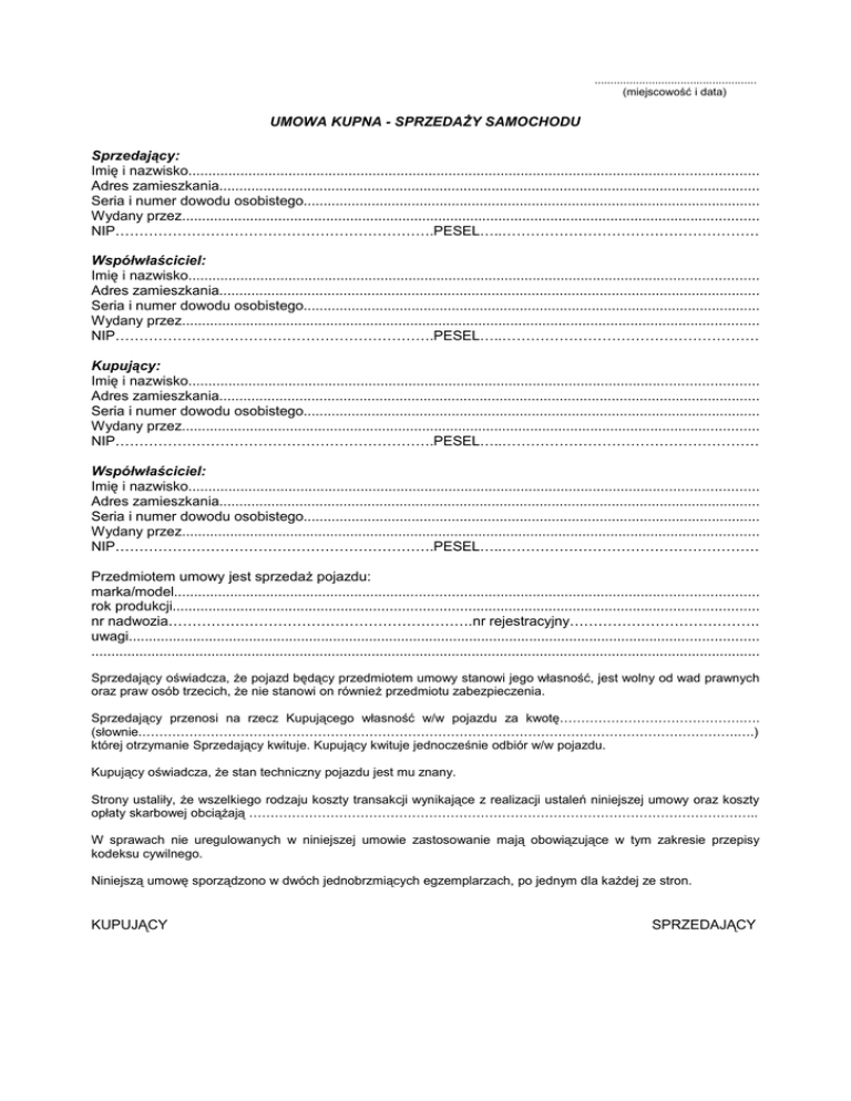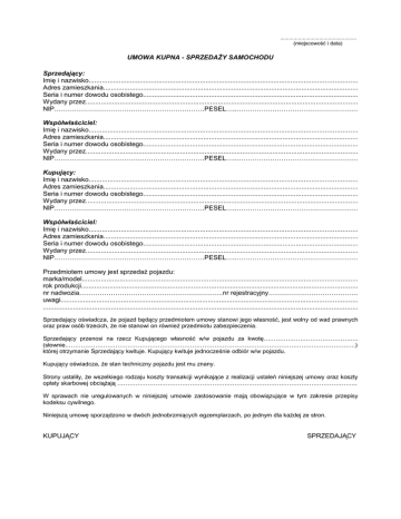 ................................................... (miejscowość i data) UMOWA KUPNA - SPRZEDAŻY SAMOCHODU Sprzedający: Imię i nazwisko.............................................................................................................................................. Adres zamieszkania....................................................................................................................................... Seria i numer dowodu osobistego.................................................................................................................. Wydany przez................................................................................................................................................ NIP………………………………………………………….PESEL…..……………………………………………… Współwłaściciel: Imię i nazwisko.............................................................................................................................................. Adres zamieszkania....................................................................................................................................... Seria i numer dowodu osobistego.................................................................................................................. Wydany przez................................................................................................................................................ NIP………………………………………………………….PESEL…..……………………………………………… Kupujący: Imię i nazwisko.............................................................................................................................................. Adres zamieszkania....................................................................................................................................... Seria i numer dowodu osobistego.................................................................................................................. Wydany przez................................................................................................................................................ NIP………………………………………………………….PESEL…..……………………………………………… Współwłaściciel: Imię i nazwisko.............................................................................................................................................. Adres zamieszkania....................................................................................................................................... Seria i numer dowodu osobistego.................................................................................................................. Wydany przez................................................................................................................................................ NIP………………………………………………………….PESEL…..……………………………………………… Przedmiotem umowy jest sprzedaż pojazdu: marka/model................................................................................................................................................. rok produkcji................................................................................................................................................. nr nadwozia……………………………………………………….nr rejestracyjny…………………………………. uwagi............................................................................................................................................................. ....................................................................................................................................................................... Sprzedający oświadcza, że pojazd będący przedmiotem umowy stanowi jego własność, jest wolny od wad prawnych oraz praw osób trzecich, że nie stanowi on również przedmiotu zabezpieczenia. Sprzedający przenosi na rzecz Kupującego własność w/w pojazdu za kwotę…………………………………….…. (słownie.………………………………………………………………………………………………………………………….….) której otrzymanie Sprzedający kwituje. Kupujący kwituje jednocześnie odbiór w/w pojazdu. Kupujący oświadcza, że stan techniczny pojazdu jest mu znany. Strony ustaliły, że wszelkiego rodzaju koszty transakcji wynikające z realizacji ustaleń niniejszej umowy oraz koszty opłaty skarbowej obciążają ……………………………………………………………………………………………………….. W sprawach nie uregulowanych w niniejszej umowie zastosowanie mają obowiązujące w tym zakresie przepisy kodeksu cywilnego. Niniejszą umowę sporządzono w dwóch jednobrzmiących egzemplarzach, po jednym dla każdej ze stron. KUPUJĄCY SPRZEDAJĄCY