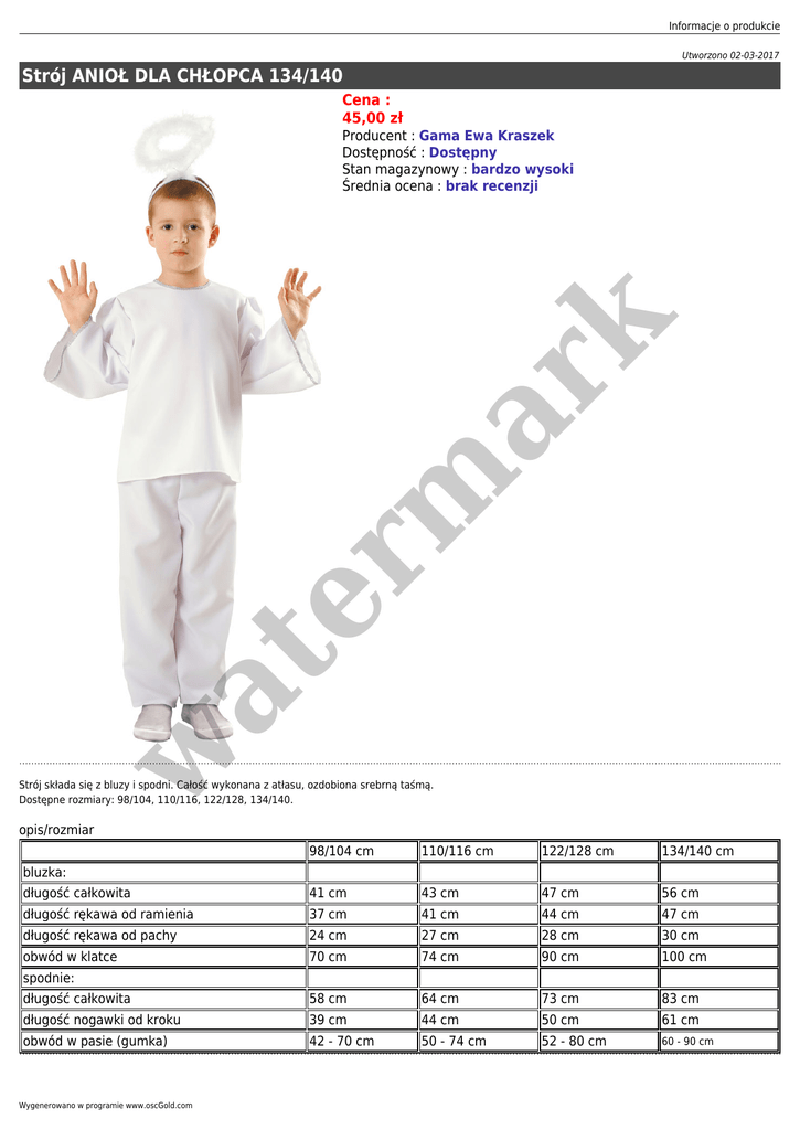 Informacje o produkcie Utworzono 02-03-2017 Strój ANIOŁ DLA CHŁOPCA 134/140 Cena : 45,00 zł w at er m ar k Producent : Gama Ewa Kraszek Dostępność : Dostępny Stan magazynowy : bardzo wysoki Średnia ocena : brak recenzji Strój składa się z bluzy i spodni. Całość wykonana z atłasu, ozdobiona srebrną taśmą. Dostępne rozmiary: 98/104, 110/116, 122/128, 134/140. opis/rozmiar 98/104 cm 110/116 cm 122/128 cm 134/140 cm długość całkowita 41 cm 43 cm 47 cm 56 cm długość rękawa od ramienia 37 cm 41 cm 44 cm 47 cm długość rękawa od pachy 24 cm 27 cm 28 cm 30 cm obwód w klatce 70 cm 74 cm 90 cm 100 cm długość całkowita 58 cm 64 cm 73 cm 83 cm długość nogawki od kroku 39 cm 44 cm 50 cm 61 cm obwód w pasie (gumka) 42 - 70 cm 50 - 74 cm 52 - 80 cm 60 - 90 cm bluzka: spodnie: Wygenerowano w programie www.oscGold.com