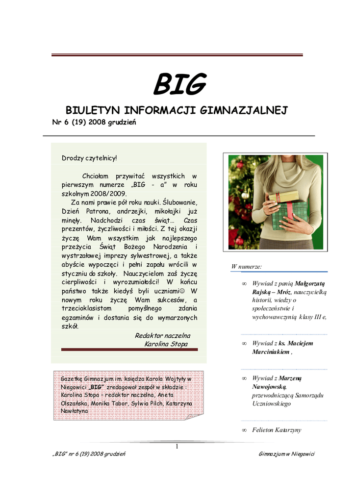 BIG BIULETYN INFORMACJI GIMNAZJALNEJ Nr 6 (19) 2008 grudzień Drodzy czytelnicy! Chciałam przywitać wszystkich w pierwszym numerze „BIG - a” w roku szkolnym 2008/2009. Za nami prawie pół roku nauki. Ślubowanie, Dzień Patrona, andrzejki, mikołajki juŜ minęły. Nadchodzi czas świąt… Czas prezentów, Ŝyczliwości i miłości. Z tej okazji Ŝyczę Wam wszystkim jak najlepszego przeŜycia Świąt BoŜego Narodzenia i wystrzałowej imprezy sylwestrowej, a takŜe abyście wypoczęci i pełni zapału wrócili w styczniu do szkoły. Nauczycielom zaś Ŝyczę cierpliwości i wyrozumiałości! W końcu państwo takŜe kiedyś byli uczniami☺ W nowym roku Ŝyczę Wam sukcesów, a trzecioklasistom pomyślnego zdania egzaminów i dostania się do wymarzonych szkół. W numerze: • Wywiad z panią Małgorzatą Rajską – Mróz, nauczycielką historii, wiedzy o społeczeństwie i wychowawczynią k lasy III e, Redaktor naczelna Karolina Stopa • Wywiad z ks. Maciejem Marciniakiem , Gazetkę Gimnazju m i m. księdza Karola Wojtyły w • Wywiad z Marzeną Nawojowską, przewodniczącą Samorządu Uczniowsk iego • Felieton Katarzyny Niegowici „BIG” zredagował zespół w składzie : Karolina Stopa – redaktor naczelna, An eta Olszańska, Monika Tabor, Sylw ia Pilch, Katarzyna Naw łatyna Nawłatyny 1 „BIG” nr 6 (19) 2008 grudzień Gimnazjum w Niegowici Wywiad z panią Małgorzatą Rajską-Mróz. „W SZYSTKO KRĘCI SIĘ WOKÓŁ HISTORII…” Rozmaw iały: Monika Tabor i Sylw ia Pilch BIG: W iemy, pani M.R.-M.: Są chętni. Jest to inna, organizatorką obchodów Dnia Praw ciekawa forma happeningu, czyli nic Człowieka (od nie mówimy, tylko chodzimy w znakach redakcji: 10 XII br.). Skąd wziął róŜnych praw. Manifestujemy, czyli się taki pomysł? opowiadamy się za tymi z praw, które w Ŝe jest naszej szkole uwaŜamy za najwaŜniejsze. BIG: Zmieniając temat, ciekawi jesteśmy, czy uczyła pani kiedyś w innej szkole? M.R.-M.: Tak, uczyłam przez wiele lat w Szkole Podstawowej w Marszowicach. BIG: Czy moŜna porównać tę szkołę Małgorzata Rajska – Mróz: Jestem współorganizatorką Mirosławą Dudek. razem z Pierwszy z naszym gimnazjum? panią M.R.-M.: Na pewno moŜna porównać. raz Ale tę szkołę w Marszowicach darzę organizowałyśmy taki dzień kilka lat taką wyjątkową sympatią, poniewaŜ temu przez trzy kolejne lata. Cieszył tam zaczęła się moja droga zawodowa. się zainteresowaniem uczniów, więc postanowiliśmy wrócić do BIG: tego satysfakcję, pomysłu. BIG: Czy uczniowie Czy odczuwa pani kiedy wstawia jakąś pani jedynki i wpisuje uwagi? teraz zareagowali równie chętnie? 2 „BIG” nr 6 (19) 2008 grudzień Gimnazjum w Niegowici M.R.-M.: śadnej! Głównie nie lubię ani BIG: oceniać, ani wpisywać uwag. Dla mnie nauczyciela najwaŜniejsza jest lekcja. marzeniem. BIG: Jak wygląda pani lekcja To M.R.-M.: wychowawcza? znaczy, był Tak, Ŝe zawód zawsze pani ewentualnie jakieś pokrewne. Oprócz tego myślałam o archeologii. BIG: Jaki ma pani cel w Ŝyciu? M.R.-M.: Cel w Ŝyciu… Spełnić się zawodowo i spełnić się w swojej pani jakieś rodzinie. BIG: Czy pamięta śmieszne wydarzenie z lekcji? M.R.-M.: Śmiesznych sytuacji, same M.R.-M.: RóŜnie, trochę się bawimy, wiecie, jest duŜo, nawet na waszych trochę lekcjach realizujemy zgodnie z rozkładem, trochę na nich krzyczę. Po jaki przebieg miał miniony podczas przerwy w szkole podstawowej, gdzie dopiero zaczęłam Dlaczego wybrała pani pracować, historię? bym uczeń wyszedł za ogrodzenie, a ja poszłam za nim, M.R.-M.: Wybrałam historię i drugi raz teŜ pośmiejemy. niesamowitym zdarzeniu. Pewnego dnia tydzień. BIG: się Chciałabym wam opowiedzieć o takim prostu rozmawiam z moimi uczniami o tym, czasem tak wybrała. święcie przekonana, Ŝe idzie sobie Jestem zapalić. Idę za nim, ale widzę, Ŝe nie czwartym pokoleniem nauczycielskim ucieka. Pytam go, co ma w ręce, bo właśnie z historii. Wszystko kręci się trzymał wokół historii. papierową torebkę. Niechętnie, ale mi tę torebkę dał. Moje zdziwienie było niesamowite, bo w tej torebce miał ugotowane 3 „BIG” nr 6 (19) 2008 grudzień Gimnazjum w Niegowici ziemniaki w łu pinach. najzwyczajniej w śniadanie. to Była Było świecie dla to ulubionych uczniów, co nie ma nic jego mnie tak wspólnego z ocenami. powiedzieć, Ŝe lgną do MoŜna mnie z niezręczna sytuacja, Ŝe zamieniłam się wzajemnością uczniowie, którzy są z nim. Zapytałam, czy nie mógłby dać największymi rozrabiakami. mi tych ziemniaków, bo nie jadłam BIG: nigdy takich, a w zamian ofiarowałam przyszłość z naszą szkołą? mu moją droŜdŜówkę. Zgodził się ze M.R.-M.: Myślę, Ŝe tak. Pracuję tu od mną wymienić. początku, kiedy zaczęły się gimnazja. BIG: Rzeczywiście, dobre! BIG: M.R.-M.: No! opowiedzieć BIG: Jakie ma pani zainteresowania osobistym? pozaszkolne? M.R.-M.: W zasadzie nic więcej ponad M.R.-M.: Słuchajcie! Pasjami piję kawę, to, co powszechnie wiadomo. Jestem z czytam ksiąŜki i podróŜuję. Bochni i mam rodzinę. BIG: A jakie ksiąŜki pani BIG: najbardziej lubi? M.R-M.: Czy A jak wiąŜe pani mogłaby o nam swoim wygląda pani swoją pani Ŝyciu dom rodzinny? to M.R.-M.: Mój dom wygląda jak skansen. wszystkie: i historyczne, i literaturę Jestem otoczona starymi meblami, piękną, takŜe powieści współczesne. bibelotami, niektóre mają ponad sto Nie czytam jedynie ksiąŜek science- lat i to uwielbiam. fiction. BIG: Co lubi pani w swoich uczniach? BIG: Którą klasę najbardziej pani M.R.-M.: lubi? szczerość. M.R.-M.: Chyba wiadomo, Ŝe III e! Ale BIG: Dziękujemy za wywiad. muszę powiedzieć, Ŝe kaŜdą klasę M.R.-M.: Ja równieŜ. darzę KaŜde. Czy sympatią. W zasadzie Mam Szczerość, bezwzględnie takich 4 „BIG” nr 6 (19) 2008 grudzień Gimnazjum w Niegowici Wywiad z księdzem Maciejem Marciniakiem „Staram się patrzeć na dzieci jak na wielką inwestycj