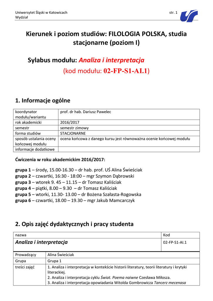 Uniwersytet Śląski w Katowicach Wydział str. 1 Kierunek i poziom studiów: FILOLOGIA POLSKA, studia stacjonarne (poziom I) Sylabus modułu: Analiza i interpretacja (kod modułu: 02-FP-S1-AI.1) 1. Informacje ogólne koordynator modułu/wariantu rok akademicki semestr forma studiów sposób ustalania oceny końcowej modułu informacje dodatkowe prof. dr hab. Dariusz Pawelec 2016/2017 semestr zimowy STACJONARNE ocena końcowa z danego kursu jest równoważna ocenie końcowej modułu Ćwiczenia w roku akademickim 2016/2017: grupa 1 – środy, 15.00-16.30 – dr hab. prof. UŚ Alina Świeściak grupa 2 – czwartki, 16:30 - 18:00 – mgr Szymon Dąbrowski grupa 3 – wtorek 9. 45 – 11.15 – dr Tomasz Kaliściak grupa 4 – piątki, 8.00 – 9.30 – dr Tomasz Kaliściak grupa 5 – wtorki, 11.30- 13.00 – dr Bożena Szałasta-Rogowska grupa 6 – czwartki, 18.00 – 19.30 – mgr Jakub Mamcarczyk 2. Opis zajęć dydaktycznych i pracy studenta nazwa Kod Analiza i interpretacja 02-FP-S1-AI.1 Prowadzący Grupa treści zajęć Alina Świeściak Grupa 1 1. Analiza i interpretacja w kontekście historii literatury, teorii literatury i krytyki literackiej. 2. Analiza i interpretacja cyklu Świat. Poema naiwne Czesława Miłosza. 3. Analiza i interpretacja opowiadania Witolda Gombrowicza Tancerz mecenasa Uniwersytet Śląski w Katowicach Wydział str. 2 Kraykowskiego. 4. Sztuka interpretacji (według Janusza Sławińskiego). 5. Analiza i interpretacja „wierszy mechanicznych” Tytusa Czyżewskiego. 6. Interpretacja jako dialektyka wyjaśnienia i rozumienia, koło hermeneutyczne (H.G. Gadamer, P. Ricoeur). 7. Analiza i interpretacja Ćwiczeń stylistycznych Raymonda Queneau w przekładzie Jana Gondowicza. 8. Analiza i interpretacja tomu Kup kota w worku Tadeusza Różewicza. 9. Interpretacja i nadinterpretacja według Umberta Eco. 10. Analiza i interpretacja opowiadania Biblioteka Babel J.L. Borgesa. 11. Interpretacja w kontekście postmodernizmu (Stanley Fish). 12. Analiza i interpretacja wiersza Wild Water Kingdom Andrzeja Sosnowskiego. metody prowadzenia zajęć liczba godzin dydaktycznych (kontaktowych) liczba godzin pracy własnej studenta opis pracy własnej studenta organizacja zajęć analiza tekstów naukowych, analiza i interpretacja tekstów literackich, miniwykład, dyskusja literatura obowiązkowa 1. J.L. Borges, Biblioteka Babel, w: tegoż, Fikcje, przeł. A. Sobol-Jurczykowski, Warszawa 2003. 2. T. Czyżewski, Noc–dzień. Mechaniczny instynkt elektryczny, Kraków 1922; tegoż, Zielone oko. Poezje formistyczne. Elektryczne wizje, Kraków 1920 (można korzystać ze zbioru T. Czyżewski, Poezje, oprac. i przedmową opatrzył K. Karasek, Warszawa 1987 lub innego). 3. W. Gombrowicz, Tancerz mecenasa Kraykowskiego, w: tegoż, Bakakaj, Kraków 2014. 4. C. Miłosz, Świat. Poema naiwne, w: tegoż, Wiersze, t. 1, Kraków 2001 (lub wybór wierszy Miłosza, w którym znajduje się cykl). 5. R. Queneau, Ćwiczenia stylistyczne, przeł. J. Gondowicz, „Literatura na Świecie” 2000, nr 6. 6 T. Różewicz, Kup kota w worku, Wrocław 2008. 7. A. Sosnowski, Wild Water Kingdom, w: tegoż, Pozytywki i marienbadki, Wrocław 2009 (lub inny zbiór). 8. U. Eco, R. Rorty, J. Culler, Ch. Brooks-Rose, Interpretacja i nadinterpretacja, red. S. Collini, przeł. T. Bieroń, Kraków 2008. 9. S. Fish, Czy na tych zajęciach jest tekst, w: tegoż, Interpretacja, retoryka, polityka: eseje wybrane, Kraków 2002. 30 60 lektura tekstów zadanych przez nauczyciela akademickiego; napisanie krótkiego szkicu dotyczącego problemu zadanego przez prowadzącego Kurs obejmuje zajęcia o charakterze konwersatorium. [termin zajęć wg harmonogramu] Uniwersytet Śląski w Katowicach Wydział str. 3 10. J. Sławiński, Analiza, interpretacja i wartościowanie dzieła literackiego, w: Problemy metodologiczne współczesnego literaturoznawstwa, red. H. Markiewicz i J. Sławiński, Kraków 1976. 11. J. Sławiński, O problemach „sztuki interpretacji”, w: tegoż, Dzieło, język, tradycja, Warszawa 1974 (i następne). 12. P. Ricoeur, Język, znaczenie, interpretacja, Warszawa 1989. literatura uzupełniająca E. Auerbach, Blizna Odyseusza, w: tegoż, Mimesis. Rzeczywistość przedstawiona w literaturze Zachodu, Warszawa 1968 i następne. H.G. Gadamer, Poetica, Warszawa 2001 (wybrany tekst). Liryka polska. Interpretacje, red. J. Prokop, J. Sławiński, Gdańsk 2001 (tekst do wyboru). M.P. Markowski, Interpretacja i literatura, „Teksty Drugie” 2001, nr 5. R. Nycz, Teoria interpretacji. Problem pluralizmu, w: tegoż, Tekstowy świat, Kraków 1993. I Opacki, Mówione wierszem, Katowice 2004 (tekst do wyboru). E. Pound, ABC czytania, w: Nowa Krytyka, oprac. Z. Łapiński, Warszawa 1983. J. Sławiński, Miejsce interpretacji, Gdańsk 2001. J. Sławiński, Uwagi o interpretacji (literaturoznawczej), w: tegoż, Próby teoretycznoliterackie, Warszawa 1992. Sztuka interpretacji, t. 1–2, red. H. Markiewicz, Wrocław 1971 (tekst do wyboru). adres strony www zajęć informacje dodatkowe 3. Opis sposobów weryfikacji efektów kształcenia modułu Nazwa Kod Analiza i interpretacja 02-FP-S1-AI.1 kod zajęć osoba przeprowadzająca weryfikację grupa(wymagania merytoryczne kryteria oceny przebieg procesu Dr hab. prof. UŚ Alina Świeściak Grupa 1 Student ma podstawową wiedzę na temat teoretycznych i eseistycznych ujęć procesów lektury oraz interpretacji. Aktywnie uczestniczy w dyskusji na zajęciach, jest przygotowany do zajęć. Dostrzega specyfikę tekstu literackiego w zależności od jego miejsca w systemie obiegów literackich i komunikacyjnych. Jest autorem szkicu na temat czytania i interpretowania literatury. Ocena na podstawie aktywności oraz stopnia przygotowania do zajęć; ocena szkicu może wpłynąć na podniesienie (lub obniżenie) oceny końcowej o stopień. Praca pisemna musi zostać złożona do [31.12.2016]. Końcowa ocena z kursu zostanie wystawiona na ostatnich zajęciach. Uniwersytet Śląski w Katowi