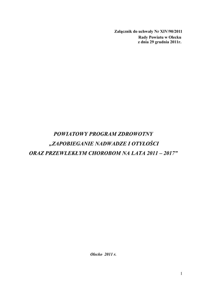 Załącznik do uchwały Nr XIV/90/2011 Rady Powiatu w Olecku z dnia 29 grudnia 2011r. POWIATOWY PROGRAM ZDROWOTNY „ZAPOBIEGANIE NADWADZE I OTYŁOŚCI ORAZ PRZEWLEKŁYM CHOROBOM NA LATA 2011 – 2017” Olecko 2011 r. 1 Wstęp Narodowy Instytut Zdrowia Publicznego Państwowy Zakład Higieny w publikacji pt. „Sytuacja zdrowotna ludności Polski” opracowanej pod redakcją Bogdana Wojtyniaka i Pawła Goryńskiego wydanej w 2008r. informuje, że pod względem występowania otyłości i nadwagi mieszkańcy Polski znajdują się poniżej średniej dla krajów UE. Jednak problem ten powoli zaczyna narastać i obecnie dotyczy ponad 43% populacji. W większym stopniu dotyczy mężczyzn niż kobiet. Sytuacja dzieci i młodzieży w porównaniu z innymi krajami UE jest bardzo korzystna, niemniej odnotowano wzrost odsetka osób z nadwagą w młodszych grupach wiekowych. Światowa Organizacja Zdrowia definiuje nadwagę i otyłość jako nieprawidłową lub nadmierną akumulację tłuszczu, stanowiącą zagrożenie dla zdrowia ludzkiego. Otyłość jest przewlekłą chorobą metaboliczną, wynikającą z zaburzeń homeostazy energii. Nadmierna ilość tkanki tłuszczowej w organizmie powoduje patologie i dysfunkcje we wszystkich układach i narządach. Otyłość może być również czynnikiem ryzyka wielu chorób, m.in. takich jak choroby sercowo-naczyniowe (miażdżyca i nadciśnienie tętnicze), cukrzyca typu 2, niektóre nowotwory, choroby zwyrodnieniowe stawów, kamicy pęcherzyka żółciowego, czy zespołu snu z bezdechem. Aktywność fizyczna jest uznawana za najważniejszy czynnik podtrzymujący zdrowie i przeciwdziałający występowaniu chorób cywilizacyjnych. Wyniki badań wskazują, że aktywność fizyczna Polaków jest zbyt niska. Według danych Narodowego Instytutu Zdrowia Publicznego (NIZP) wśród młodzieży obserwuje się obniżenie aktywności fizycznej w starszych grupach wiekowych w wielu krajach UE. Szczególnie duży spadek występuje wśród dziewcząt, z których w Polsce co piąta w wieku 11 lat deklaruje umiarkowaną lub dużą codzienną aktywność fizyczną, a w wieku 15 lat już tylko co dziesiąta. NIZP podaje informację, że poziom aktywności fizycznej osób dorosłych w Polsce jest jednym z najniższych w Europie. Wskazują na to m. in. badania przeprowadzone w sześciu krajach europejskich. Wzrost zachorowalności na tzw. choroby cywilizacyjne powoduje zwiększenie zainteresowania czynnikami ryzyka tych chorób. Szczególnie dotyczy to czynników ryzyka, którym można skutecznie przeciwdziałać poprzez działania promocji zdrowia, a więc czynników zależnych od prowadzonego stylu życia. Wyróżnić można kilka czynników ryzyka, np. palenie papierosów, nieprawidłowa dieta, nadmierne spożycie alkoholu, otyłość czy mała aktywność fizyczna. Czynniki te według szacunków WHO dla roku 2002 były odpowiedzialne w Polsce za około 55% zgonów i prawie 40% utraconych lat życia przeżytego w zdrowiu. W dalszej części opisana została m. in. diagnoza występowania otyłości i zachorowalności na niektóre choroby niezakaźne, wśród mieszkańców powiatu oleckiego, a także powiatowy program zdrowotny „Zapobieganie nadwadze i otyłości oraz przewlekłym chorobom na lata 2011 – 2017”. Celem programu jest zwiększenie świadomości mieszkańców powiatu oleckiego o roli żywienia i aktywności fizycznej dla zachowania zdrowia. Program jest realizacją części zapisów: • Narodowego Programu Zapobiegania Nadwadze i Otyłości oraz Przewlekłym Chorobom Niezakaźnym Poprzez Poprawę Żywienia i Aktywności Fizycznej Na Lata 2007-2011, • Narodowego Programu Zdrowia Na Lata 2007-2015, • Wojewódzkiego Programu Promocji i Ochrony Zdrowia Na Lata 2007-2013, • Globalnej Strategii Dotyczącej Diety, Aktywności Fizycznej i Zdrowia. 2 I. Diagnoza. Powiat Olecki zamieszkuje 34 111 mieszkańców, w tym 17 262 kobiet i 16 849 mężczyzn (wg danych GUS na dzień 31.12.2009r.). Z tego 16 061 tj. 47,08 % mieszka w mieście, zaś 18 050 na terenach wiejskich, stanowi to 52,92% ogółu mieszkańców. Na terenie powiatu oleckiego usługi z zakresu podstawowej opieki zdrowotnej udziela sześciu świadczeniodawców, natomiast leczenie szpitalne zapewnia jeden. Tabela 1. Świadczeniodawcy z zakresu podstawowej opieki zdrowotnej. Lp. 1. 2. 3. 4. 5. 6. Nazwa świadczeniodawcy Adres Centrum Medyczne Zakład Opieki Zdrowotnej ul. Gołdapska 1 Olmedica Sp. z o.o. 19-400 Olecko Niepubliczny Zakład Opieki Zdrowotnej „GAMED” ul. 11-go Listopada 23 19-400 Olecko Niepubliczny Zakład Opieki Zdrowotnej Zakład ul. 11-go Listopada 23 Leczniczy „ESKULAP” 19-400 Olecko Samodzielny Publiczny Gminny Ośrodek Zdrowia ul. Jeziorna 14 w Wieliczkach 19-404 Wieliczki Samodzielny Publiczny Gminny Ośrodek Zdrowia ul. Witosa 1 w Kowalach Oleckich 19-420 Kowale Oleckie Niepubliczny Zakład Opieki Zdrowotnej „Lekarz 19-411 Świętajno Rodzinny” Świętajno 104 Tabela 2. Świadczeniodawca zapewniający leczenie szpitalne. Lp. Nazwa świadczeniodawcy Adres 1. Centrum Medyczne Olmedica Sp. z o.o. Zakład Opieki Zdrowotnej ul. Gołdapska 1 19-400 Olecko W celu głębszego zbadania problemu otyłości i niektórych chorób niezakaźnych wśród mieszkańców powiatu oleckiego poniżej przedstawiano dane statystyczne z lat 2007-2009, obrazujące skalę problemu. Dane pochodzą z Biuletynu Statystycznego Ochrony Zdrowia Województwa Warmińsko – Mazurskiego z roku 2007, 2008 oraz 2009, opracowanego przez Warmińsko – Mazurskie Centrum Zdrowia Publicznego w Olsztynie. 3 Tabela 3. Występowanie otyłości u dzieci i młodzieży w wieku 0-18 lat będących pod opieką lekarza POZ wg rozpoznania w latach 2007-2009 w powiecie oleckim. Jednostka chorobowa Lata 2007 2008 2009 Otyłość Chorobowość (liczba bezwzględna) 0-2 66 96 88 1 1 0 dzieci i młodzieży w wieku 3-4 5-9 10-14 2 7 10 17 17 16 25 40 42 15-18 Chorobowość (wsk. na 10 tys. lud.) 21 31 20 77,5 115,4 108,4