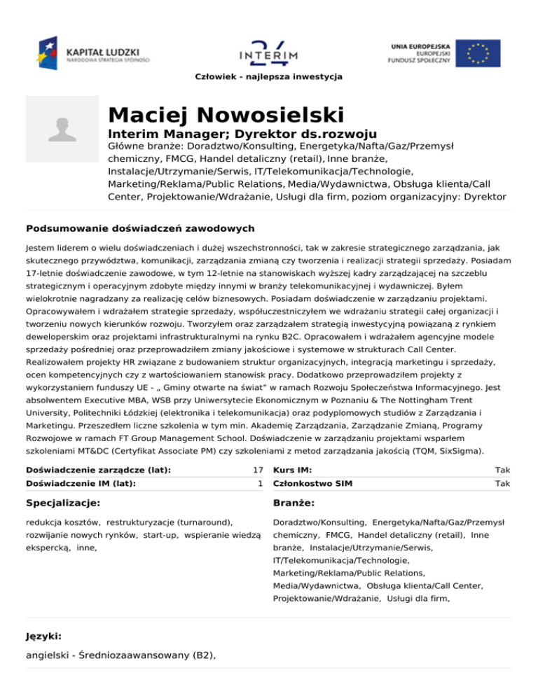 Człowiek - najlepsza inwestycja Maciej Nowosielski lnterim Manager; Dyrektor ds.rozwoju Główne branże: Doradztwo/Konsulting, Energetyka/Nafta/Gaz/Przemysł chemiczny, FMCG, Handel detaliczny (retail), Inne branże, Instalacje/Utrzymanie/Serwis, IT/Telekomunikacja/Technologie, Marketing/Reklama/Public Relations, Media/Wydawnictwa, Obsługa klienta/Call Center, Projektowanie/Wdrażanie, Usługi dla firm, poziom organizacyjny: Dyrektor Podsumowanie doświadczeń zawodowych Jestem liderem o wielu doświadczeniach i dużej wszechstronności, tak w zakresie strategicznego zarządzania, jak skutecznego przywództwa, komunikacji, zarządzania zmianą czy tworzenia i realizacji strategii sprzedaży. Posiadam 17-letnie doświadczenie zawodowe, w tym 12-letnie na stanowiskach wyższej kadry zarządzającej na szczeblu strategicznym i operacyjnym zdobyte między innymi w branży telekomunikacyjnej i wydawniczej. Byłem wielokrotnie nagradzany za realizację celów biznesowych. Posiadam doświadczenie w zarządzaniu projektami. Opracowywałem i wdrażałem strategie sprzedaży, współuczestniczyłem we wdrażaniu strategii całej organizacji i tworzeniu nowych kierunków rozwoju. Tworzyłem oraz zarządzałem strategią inwestycyjną powiązaną z rynkiem deweloperskim oraz projektami infrastrukturalnymi na rynku B2C. Opracowałem i wdrażałem agencyjne modele sprzedaży pośredniej oraz przeprowadziłem zmiany jakościowe i systemowe w strukturach Call Center. Realizowałem projekty HR związane z budowaniem struktur organizacyjnych, integracją marketingu i sprzedaży, ocen kompetencyjnych czy z wartościowaniem stanowisk pracy. Dodatkowo przeprowadziłem projekty z wykorzystaniem funduszy UE - „ Gminy otwarte na świat” w ramach Rozwoju Społeczeństwa Informacyjnego. Jest absolwentem Executive MBA, WSB przy Uniwersytecie Ekonomicznym w Poznaniu & The Nottingham Trent University, Politechniki Łódzkiej (elektronika i telekomunikacja) oraz podyplomowych studiów z Zarządzania i Marketingu. Przeszedłem liczne szkolenia w tym min. Akademię Zarządzania, Zarządzanie Zmianą, Programy Rozwojowe w ramach FT Group Management School. Doświadczenie w zarządzaniu projektami wsparłem szkoleniami MT&DC (Certyfikat Associate PM) czy szkoleniami z metod zarządzania jakością (TQM, SixSigma). Doświadczenie zarządcze (lat): Doświadczenie IM (lat): 17 1 Kurs IM: Tak Członkostwo SIM Tak Specjalizacje: Branże: redukcja kosztów, restrukturyzacje (turnaround), Doradztwo/Konsulting, Energetyka/Nafta/Gaz/Przemysł rozwijanie nowych rynków, start-up, wspieranie wiedzą chemiczny, FMCG, Handel detaliczny (retail), Inne ekspercką, inne, branże, Instalacje/Utrzymanie/Serwis, IT/Telekomunikacja/Technologie, Marketing/Reklama/Public Relations, Media/Wydawnictwa, Obsługa klienta/Call Center, Projektowanie/Wdrażanie, Usługi dla firm, Języki: angielski - Średniozaawansowany (B2), Kompetencje: MARKETING (9) IT/Telekomunikacja/Technologie, Obsługa klienta/Call Center, Doradztwo/Konsulting, Handel detaliczny (retail), Sektor publiczny, OPERACJE (9) IT/Telekomunikacja/Technologie, Obsługa klienta/Call Center, Doradztwo/Konsulting, Handel detaliczny (retail), SPRZEDAŻ (9) IT/Telekomunikacja/Technologie, Obsługa klienta/Call Center, Doradztwo/Konsulting, Handel detaliczny (retail), STRATEGIA (9) IT/Telekomunikacja/Technologie, Obsługa klienta/Call Center, Handel detaliczny (retail), Sektor publiczny, ZARZĄDZANIE (9) IT/Telekomunikacja/Technologie, Obsługa klienta/Call Center, Doradztwo/Konsulting, Handel detaliczny (retail), HR (5) IT/Telekomunikacja/Technologie, Obsługa klienta/Call Center, Doradztwo/Konsulting, IT (3) IT/Telekomunikacja/Technologie, Obsługa klienta/Call Center, Doradztwo/Konsulting, JAKOŚĆ (3) IT/Telekomunikacja/Technologie, Obsługa klienta/Call Center, PRODUKCJA (3) IT/Telekomunikacja/Technologie, Doradztwo/Konsulting, ZAKUPY (2) IT/Telekomunikacja/Technologie, KONTROLING (1) IT/Telekomunikacja/Technologie, ADMINISTRACJA (1) Sektor publiczny, FINANSE (1) IT/Telekomunikacja/Technologie, Jeśli chcesz zapoznać się z pełnym profilem Kandydata/ki lub szukasz Kandydata/ki o innym profilu zawodowym zapraszamy do rejestracji na darmowej platformie interim24.pl: https://interim24.pl/company_register lub kontaktu z nami: tel. 22 50 234 70, e-mail: [email protected] Projekt współfinansowany ze środków Unii Europejskiej w ramach Europejskiego Funduszu Społecznego.