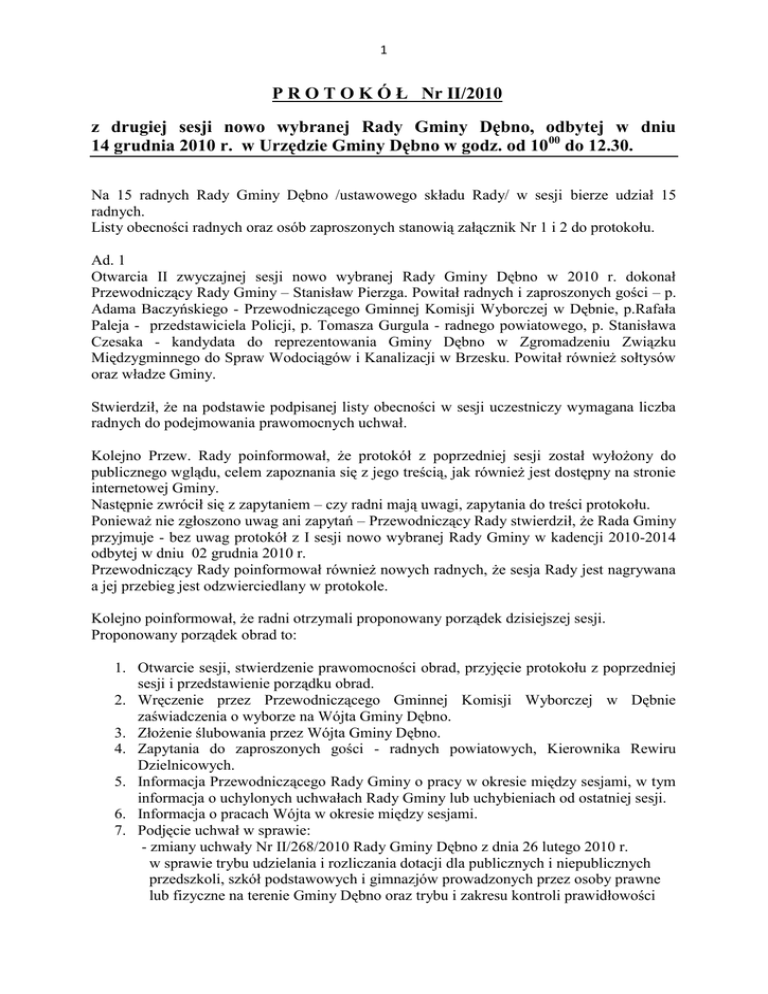 1 P R O T O K Ó Ł Nr II/2010 z drugiej sesji nowo wybranej Rady Gminy Dębno, odbytej w dniu 14 grudnia 2010 r. w Urzędzie Gminy Dębno w godz. od 1000 do 12.30. Na 15 radnych Rady Gminy Dębno /ustawowego składu Rady/ w sesji bierze udział 15 radnych. Listy obecności radnych oraz osób zaproszonych stanowią załącznik Nr 1 i 2 do protokołu. Ad. 1 Otwarcia II zwyczajnej sesji nowo wybranej Rady Gminy Dębno w 2010 r. dokonał Przewodniczący Rady Gminy – Stanisław Pierzga. Powitał radnych i zaproszonych gości – p. Adama Baczyńskiego - Przewodniczącego Gminnej Komisji Wyborczej w Dębnie, p.Rafała Paleja - przedstawiciela Policji, p. Tomasza Gurgula - radnego powiatowego, p. Stanisława Czesaka - kandydata do reprezentowania Gminy Dębno w Zgromadzeniu Związku Międzygminnego do Spraw Wodociągów i Kanalizacji w Brzesku. Powitał również sołtysów oraz władze Gminy. Stwierdził, że na podstawie podpisanej listy obecności w sesji uczestniczy wymagana liczba radnych do podejmowania prawomocnych uchwał. Kolejno Przew. Rady poinformował, że protokół z poprzedniej sesji został wyłożony do publicznego wglądu, celem zapoznania się z jego treścią, jak również jest dostępny na stronie internetowej Gminy. Następnie zwrócił się z zapytaniem – czy radni mają uwagi, zapytania do treści protokołu. Ponieważ nie zgłoszono uwag ani zapytań – Przewodniczący Rady stwierdził, że Rada Gminy przyjmuje - bez uwag protokół z I sesji nowo wybranej Rady Gminy w kadencji 2010-2014 odbytej w dniu 02 grudnia 2010 r. Przewodniczący Rady poinformował również nowych radnych, że sesja Rady jest nagrywana a jej przebieg jest odzwierciedlany w protokole. Kolejno poinformował, że radni otrzymali proponowany porządek dzisiejszej sesji. Proponowany porządek obrad to: 1. Otwarcie sesji, stwierdzenie prawomocności obrad, przyjęcie protokołu z poprzedniej sesji i przedstawienie porządku obrad. 2. Wręczenie przez Przewodniczącego Gminnej Komisji Wyborczej w Dębnie zaświadczenia o wyborze na Wójta Gminy Dębno. 3. Złożenie ślubowania przez Wójta Gminy Dębno. 4. Zapytania do zaproszonych gości - radnych powiatowych, Kierownika Rewiru Dzielnicowych. 5. Informacja Przewodniczącego Rady Gminy o pracy w okresie między sesjami, w tym informacja o uchylonych uchwałach Rady Gminy lub uchybieniach od ostatniej sesji. 6. Informacja o pracach Wójta w okresie między sesjami. 7. Podjęcie uchwał w sprawie: - zmiany uchwały Nr II/268/2010 Rady Gminy Dębno z dnia 26 lutego 2010 r. w sprawie trybu udzielania i rozliczania dotacji dla publicznych i niepublicznych przedszkoli, szkół podstawowych i gimnazjów prowadzonych przez osoby prawne lub fizyczne na terenie Gminy Dębno oraz trybu i zakresu kontroli prawidłowości 2 ich wykorzystania, zmienionej uchwałą Nr III/276/2010 Rady Gminy Dębno z dnia 26 marca 2010 r., - wyznaczenia osób do reprezentowania Gminy Dębno w Zgromadzeniu Związku Komunalnego do Spraw Wodociągów i Kanalizacji z siedzibą w Brzesku, - ustalenia wynagrodzenia Wójta Gminy Dębno. 8. Zapytania i wolne wnioski. 9. Zamknięcie sesji. Przew. Rady zapytał – czy radni mają uwagi, pytania, wnioski do proponowanego porządku obrad. Wójt Grzegorz Brach zwrócił się z prośbą do Rady o przyjęcie do porządku obrad dodatkowego projektu uchwały w sprawie: - zmiany Uchwały Budżetowej na 2010 rok. Wójt wyjaśnił, że do projektu dołączone zostało uzasadnienie. Podjęcie tej uchwały wynika z niezbędnych korekt w budżecie, które pojawiły się od ostatniej sesji. Przew. Rady zapytał – czy radni mają jeszcze inne wnioski, uwagi, zapytania do proponowanego porządku obrad. Ponieważ zapytań jak również innych propozycji do porządku obrad nie zgłoszono, Przewodniczący Rady poprosił o przegłosowanie wnioskowanej przez Wójta zmiany do porządku obrad i wprowadzenie w pkt 7 dodatkowego projektu uchwały w sprawie zmiany Uchwały Budżetowej na 2010 rok. W głosowaniu jawnym wzięło udział 15 radnych, „za” wprowadzeniem do porządku obrad projektu powyższej uchwały głosowało -15 radnych, „przeciw” -0, „wstrzymało się od głosu” -0. Kolejno Przewodniczący Rady Stanisław Pierzga poprosił o przegłosowanie - przyjęcie całego porządku obrad wraz z przyjętym dodatkowym projektem uchwały. W głosowaniu jawnym wzięło udział 15 radnych, „za” przyjęciem proponowanego j.w. porządku obrad głosowało 15 radnych, „przeciw” -0, „wstrzymało się od głosu” -0. Ad. 2 , Ad. 3 W dalszej części obrad Przew. Rady Stanisław Pierzga poprosił Przewodniczącego Gminnej Komisji Wyborczej w Dębnie o wręczenie zaświadczenia o wyborze na Wójta Gminy Dębno – Panu Grzegorzowi Brachowi. Przewodniczący Gminnej Komisji Wyborczej w Dębnie – Adam Baczyński zabierając głos poinformował, że w dniu 05 grudnia 2010 r. odbyła się druga tura wyborów samorządowych, w której spośród dwóch kandydatów na Wójta Gminy Dębno został wybrany Pan Grzegorz Brach. Kolejno pogratulował wyboru Wójtowi - podkreślając, że jest to już III kadencja, co oznaczam, że zaufanie wyborców jest duże. Następnie Przew. Gminnej Komisji Wyborczej w Dębnie dokonał wręczenia Panu Grzegorzowi Brachowi zaświadczenia o wyborze na Wójta Gminy Dębno. 3 Przewodniczący Rady Stanisław Pierzga poinformował, że zgodnie z art. 29a ustawy z dnia 8 marca 1990 r. o samorządzie gminnym – objęcie obowiązków przez Wójta następuje z chwilą złożenia wobec Rady Gminy ślubowania. Wobec powyższego poprosił radnych o powstanie a Wójta Gminy Dębno - Grzegorza Bracha o złożenie ślubowania. Wójt –Grzegorz Brach złożył wobec Rady Gminy Dębno ślubowanie o następującej treści: „Obejmując urząd Wójta Gminy Dębno, uroczyście ślubuję, że dochowam wierności prawu, a powierzony mi urząd sprawować będę tylko dla dobra publicznego i pomyślności mieszkańców Gminy Dębno - TAK