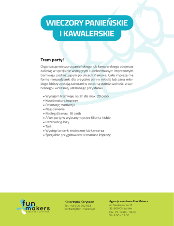Tram party! Organizacja wieczoru panieńskiego lub kawalerskiego obejmuje zabawę w specjalnie wynajętym i udekorowanym imprezowym tramwaju, podróżującym po ulicach Krakowa. Cała impreza ma formę niespodzianki dla przyszłej panny młodej lub pana młodego, którzy zostają zabierani w ostatnią podróż wolności z wybranego i wcześniej ustalonego przystanku. • Wynajem tramwaju na 3h dla max. 20 osób • Koordynatora imprezy • Dekorację tramwaju • Nagłośnienie • Nocleg dla max. 10 osób • After party w wybranym przez Klienta klubie • Rezerwację loży • Tort • Występ tancerki erotycznej lub tancerza • Specjalnie przygotowany scenariusz imprezy Katarzyna Koryczan Tel. +48 500 262 953 [email protected] Agencja eventowa Fun Makers ul. Sienkiewicza 11 32-500 Chrzanów Pn.- Pt. 12:00 - 18:00 Sb. 9:00 - 13:00 Aresztowanie panny młodej Jednorazowa akcja zaaranżowanego porwania przyszłej panny młodej i dostarczeniu jej w określone miejsce na terenie powiatu chrzanowskiego i miast aglomeracyjnych: Krakowa lub Katowic. • Bez minimum uczestników • Czas trwania: 1h • Dokładny scenariusz ustalamy telefonicznie • Aresztowanie Panny Młodej w umówionym z grupą miejscu • Przejazd samochodem wraz z kierowcą i dwoma policjantami • Ofiara zostaje delikatnie skuta kajdankami • Zakończenie w dowolnym miejscu na terenie powiatu chrzanowskiego i miast aglomeracyjnych: Krakowa lub Katowic Aresztowanie pana młodego Jednorazowa akcja zaaranżowanego porwania przyszłego pana młodego i dostarczeniu go w określone miejsce na terenie powiatu chrzanowskiego i miast aglomeracyjnych: Krakowa lub Katowic. • Bez minimum uczestników • Czas trwania: 1h • Dokładny scenariusz ustalamy telefonicznie • Aresztowanie Pana Młodego w umówionym z grupą miejscu • Przejazd samochodem wraz z kierowcą i dwoma policjantkami • Ofiara zostaje delikatnie skuta kajdankami • Zakończenie w dowolnym miejscu na terenie powiatu chrzanowskiego i miast aglomeracyjnych: Krakowa lub Katowic. ŻADNA Z PRZEDSTAWIONYCH OFERT NIE SPEŁNIA TWOICH OCZEKIWAŃ? NAPISZ DO NAS! PRZYGOTUJEMY DLA CIEBIE INDYWIDUALNĄ KONCEPCJĘ EVENTU! Katarzyna Koryczan Tel. +48 500 262 953 [email protected] Agencja eventowa Fun Makers ul. Sienkiewicza 11 32-500 Chrzanów Pn.- Pt. 12:00 - 18:00 Sb. 9:00 - 13:00