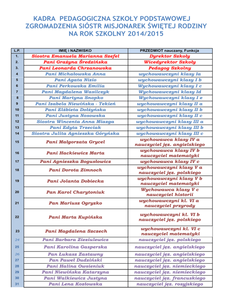 KADRA PEDAGOGICZNA SZKOŁY PODSTAWOWEJ ZGROMADZENIA SIÓSTR MISJONAREK ŚWIĘTEJ RODZINY NA ROK SZKOLNY 2014/2015 L.P. IMIĘ i NAZWISKO PRZEDMIOT nauczany, Funkcja 1. 14 Siostra Emanuela Marianna Szefel Pani Grażyna Średzińska Pani Leonarda Chrzanowska Pani Michałowska Anna Pani Agata Nizio Pani Perkowska Emilia Pani Magdalena Wasilczyk Pani Martyna Snopko Pani Izabela Niewińska - Tekień Pani Elżbieta Dołżyńska Pani Justyna Nosowska Siostra Wincenta Anna Miazga Pani Edyta Trzeciak Siostra Julita Agnieszka Góryńska 15 Pani Małgorzata Grycel 16 Pani Hackiewicz Marta 17 Pani Agnieszka Bogusłowicz 18 Pani Dorota Zimnoch 19 Pani Jolanta Dobiecka 20 Pan Karol Charytoniuk 21 Pan Mariusz Ogryzko Dyrektor Szkoły Wicedyrektor Szkoły Pedagog Szkolny wychowawczyni klasy Ia wychowawczyni klasy I b Wychowawczyni klasy I c Wychowawczyni klasy Id Wychowawczyni klasy I e wychowawczyni klasy II a wychowawczyni klasy II b wychowawczyni klasy II c wychowawczyni klasy III a wychowawczyni klasy III b wychowawczyni klasy III c wychowawca klasy IV a nauczyciel jęz. angielskiego wychowawca klasy IV b nauczyciel matematyki wychowawca klasy IV c wychowawczyni klasy V a nauczyciel jęz. polskiego wychowawczyni klasy V b nauczyciel matematyki Wychowawca klasy V c nauczyciel historii wychowawczyni kl. VI a nauczyciel przyrody 22 Pani Marta Kupińska 23 Pani Magdalena Szczech 24 Pani Barbara Zieziulewicz wychowawczyni kl. VI c nauczyciel matematyki nauczyciel jęz. polskiego 25 Pani Karolina Gasperska nauczyciel jęz. angielskiego 26 Pan Łukasz Zastawny Pan Paweł Dudziński Pani Halina Owsieniuk Pani Niewińska Katarzyna Pani Walkiewicz Justyna Pani Lena Kozłowska nauczyciel jęz. angielskiego nauczyciel jęz. angielskiego nauczyciel jęz. niemieckiego nauczyciel jęz. niemieckiego nauczyciel jęz. francuskiego nauczyciel jęz. rosyjskiego 2. 3. 4 5 6 7 8 9 10 11 12 13 27 28 29 30 31 wychowawczyni kl. VI b nauczyciel jęz. polskiego 35 Pan Marek Dudzicz Pan Marek Brzozowski Pani Edyta Guzowska Pani Danuta Kalinowska 36 Pani Beata Wnuczyńska - Ogryzko 37 44 Pani Urszula Sulkowska Siostra Bezrutczyk Czesława Siostra Paula Anna Andraka Malinowska - Czerkas Grażyna Pani Urszula Julitta Wolfang – Bylińska Pani Justyna Wysocka Pan Marek Matuszelański Pan Ryszard Chodyniecki 45 Pani Anna Iliaszuk 46 Pan Modest Dziekoński 47. Pan Dawid Kiszycki 48. Pani Anna Chomiczewska 49. Pani Anna Piotrowska 50. Pan Marcin Mazewski Pani Wioletta Łukaszewicz 32 33 34 38 39 40 41 42 43 51 52 nauczyciel informatyki nauczyciel historii nauczyciel historii nauczyciel historii nauczyciel przyrody i Wychowania do Życia w Rodzinie nauczyciel przyrody nauczyciel religii nauczyciel religii nauczyciel religii nauczyciel muzyki nauczyciel plastyki nauczyciel techniki Nauczyciel techniki nauczyciel Wychowania Fizycznego nauczyciel Wychowania Fizycznego nauczyciel Wychowania Fizycznego nauczyciel Wychowania Fizycznego nauczyciel Wychowania Fizycznego nauczyciel zajęć świetlicowych nauczyciel zajęć świetlicowych GIMN Edyta Żywicka Ewa Filipowicz Marlena Leszko Justyna Walkiewicz Katarzyna Marcinkiewicz Beata Wnuczyńska -Ogryzko Paweł Grodzki wicedyrektor szkoły Język polski Język polski Język angielski Język francuski nauczyciel matematyki Biologia-wychowanie do życia w rodzinie geografia