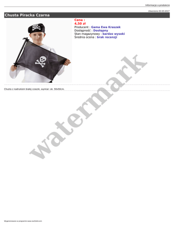 Informacje o produkcie Utworzono 02-03-2017 Chusta Piracka Czarna Cena : 4,50 zł er m ar k Producent : Gama Ewa Kraszek Dostępność : Dostępny Stan magazynowy : bardzo wysoki Średnia ocena : brak recenzji w at Chusta z nadrukiem białej czaszki, wymiar: ok. 50x50cm. Wygenerowano w programie www.oscGold.com