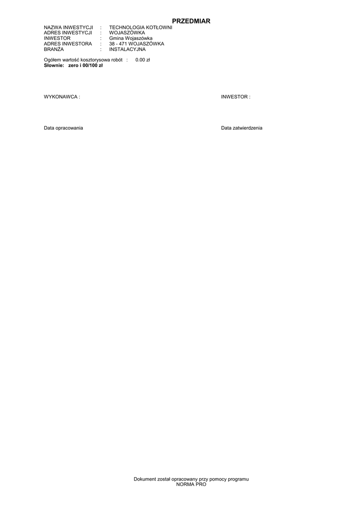 PRZEDMIAR NAZWA INWESTYCJI ADRES INWESTYCJI INWESTOR ADRES INWESTORA BRANśA : : : : : TECHNOLOGIA KOTŁOWNI WOJASZÓWKA Gmina Wojaszówka 38 - 471 WOJASZÓWKA INSTALACYJNA Ogółem wartość kosztorysowa robót : Słownie: zero i 00/100 zł 0.00 zł WYKONAWCA : INWESTOR : Data opracowania Data zatwierdzenia Dokument został opracowany przy pomocy programu NORMA PRO Technologia kotłowni przedmiar Lp. Podstawa 1 1 KNR-W 2-15 d.1 0504-01 2 KNR-W 2-15 d.1 0504-01 3 KNR 2-15 0310d.1 05 4 KNR-W 2-15 d.1 0510-01 5 KNR 7-07 0101d.1 01 6 KNR 7-07 0101d.1 01 7 KNR 7-07 0101d.1 01 8 KNR 7-07 0101d.1 01 9 KNR 7-07 0101d.1 01 10 KNR-W 2-15 d.1 0520-03 11 KNR-W 2-15 d.1 0520-04 12 KNR-W 2-15 d.1 0520-02 13 KNR-W 2-15 d.1 0520-04 14 KNR-W 2-15 d.1 0522-03 15 KNR-W 2-15 d.1 0522-03 16 KNR-W 2-15 d.1 0522-02 17 KNR-W 2-15 d.1 0521-01 18 KNR-W 2-15 d.1 0521-02 19 KNR-W 2-15 d.1 0521-02 20 KNR-W 2-15 d.1 0518-02 POZYCJE KOSZTORYSU Opis Centralne ogrzewanie kocioł 2 x 295 kW Kotły stalowe wodne An - montaŜ kotła - kocioł grzewczy zeliwny wodny niskotemperaturowy o mocy 295 KW z palnikiem wentylatorowym na gaz ziemny dwustopniowy z armaturą z wbudowaną skrzynką sterujacą ,armaturą DN 20 wraz ze sterownikiem i modułami funkcyjnymi zgodnie z projektem Kotły stalowe wodne An - montaŜ kotła - kocioł grzewczy zeliwny wodny niskotemperaturowy o mocy 295 KW z palnikiem wentylatorowym na gaz ziemny dwustopniowy z armaturą z wbudowaną skrzynką sterujacą z ,armatura DN 20 wraz ze sterownikiem i modułami funkcyjnymi zgodnie z projektem Kurki gazowe przelotowe o śr. 50 mm An - scieŜka gazowa do o mocy 295 KW wraz z palnikiem wentylatorowym na gaz ziemny dwustopniowy zgodnie z projektem Naczynia wzbiorcze pionowe systemu zamkniętego o pojemności całkowitej do 2.0 m3 An - Przeponowe naczynie wzbiorcze o średnicy 750mm, wysokość 2050, przyłącze DN 25mm zgodnie z projektem Pompy wirowe odśrodkowe o układzie poziomym lub pionowym o napędzie elektrycznym o masie 0.05 t An - pompa obiegowa dla obiegu nr 1 50-100F napięcie 1*230240V zgodnie z projektem Pompy wirowe odśrodkowe o układzie poziomym lub pionowym o napędzie elektrycznym o masie 0.05 t An - pompa obiegowa dla obiegu nr 2 50-100F napięcie 1*230240V zgodnie z projektem Pompy wirowe odśrodkowe o układzie poziomym lub pionowym o napędzie elektrycznym o masie 0.05 t An - pompa obiegowa dla obiegu nr 3 50-100F napięcie 1*230240V zgodnie z projektem Pompy wirowe odśrodkowe o układzie poziomym lub pionowym o napędzie elektrycznym o masie 0.05 t An - pompa obiegowa dla obiegu nr 4 40-100F napięcie 1*230240V zgodnie z projektem Pompy wirowe odśrodkowe o układzie poziomym lub pionowym o napędzie elektrycznym o masie 0.05 t An - pompa obiegowa dla obiegu nr 5 50-100F napięcie 1*230240V zgodnie z projektem Zawory zaporowe staliwne dla ciśnień 4.0 MPa o śr. nominalnej 40 mm An - zawór mieszajacy trójdrogowy Dn 40 o połączeniu kołnieŜowym z siłownikiem zgodnie z projektem Zawory zaporowe staliwne dla ciśnień 4.0 MPa o śr. nominalnej 50-65 mm An - zawór mieszajacy trójdrogowy f Dn 50 o połączeniu kołnierzowym z siłownikiem zgodnie z projektem Zawory zaporowe staliwne dla ciśnień 4.0 MPa o śr. nominalnej 25-32 mm An - zawór mieszajacy trójdrogowy Dn 32o połączeniu kołnierzowym z siłownikiem zgodnie z projektem Zawory zaporowe staliwne dla ciśnień 4.0 MPa o śr. nominalnej 50-65 mm An - zawór mieszajacy trójdrogowy Dn 32 o połączeniu kołnierzowym z siłownikiem zgodnie z projektem Zawory zwrotne Ŝeliwne dla ciśnień 1.6 MPa o śr. nominalnej 50-65 mm An - filtr siatkowy gwintowany DN 65 mm zgodnie z projektem Zawory zwrotne Ŝeliwne dla ciśnień 1.6 MPa o śr. nominalnej 50-65 mm An - filtr siatkowy gwintowany DN 65 mm zgodnie z projektem Zawory zwrotne Ŝeliwne dla ciśnień 1.6 MPa o śr. nominalnej 40 mm An - filtr siatkowy gwintowany Dn 40 zgodnie z projektem Zawory zwrotne Ŝeliwne dla ciśnień 1.6 MPa o śr. nominalnej 40 mm An - zawór zwrotny gwintowany Dn 40 zgodnie z projektem Zawory zwrotne Ŝeliwne dla ciśnień 1.6 MPa o śr. nominalnej 50-65 mm An - zawór zwrotny gwintowany Dn 50 zgodnie z projektem Zawory zwrotne Ŝeliwne dla ciśnień 1.6 MPa o śr. nominalnej 50-65 mm An - zawór zwrotny gwintowany Dn 65 zgodnie z projektem Zawory zaporowe Ŝeliwne dla ciśnień 0.6 MPa o śr. nominalnej 50-65 mm An - zawór kulowy gwintowany Dn 50 zgodnie z projektem -2- Norma PRO Wersja 4.18a jedn.obm. Obmiar kocioł 1.00 kocioł 1.00 szt. 2.00 szt. 1.00 kpl. 1.00 kpl. 1.00 kpl. 1.00 kpl. 1.00 kpl. 1.00 szt. 2.00 szt. 1.00 szt. 1.00 szt. 1.00 szt. 2.00 szt. 2.00 szt. 1.00 szt. 1.00 szt. 2.00 szt. 2.00 szt. 6.00 Technologia kotłowni przedmiar POZYCJE KOSZTORYSU Lp. Podstawa 21 KNR-W 2-15 d.1 0518-02 Opis jedn.obm. Zawory zaporowe Ŝeliwne dla ciśnień 0.6 MPa o śr. nominalnej szt. 50-65 mm An - zawór kulowy gwintowany Dn 65 zgodnie z projektem 22 KNR-W 2-15 Zawory zaporowe Ŝeliwne dla ciśnień 0.6 MPa o śr. nominalnej szt. d.1 0518-01 40 mm An - zawór kulowy gwintowany Dn 40 zgodnie z projektem 23 KNR-W 2-15 Zawory zaporowe Ŝeliwne dla ciśnień 0.6 MPa o śr. nominalnej szt. d.1 0518-04 100 mm An - zawór kulowy kołnierzowy Dn 100 zgodnie z projektem 24 KNR-W 2-15 Zawory zaporowe staliwne dla ciśnień 4.0 MPa o śr. nominalnej szt. d.1 0520-02 25-32 mm An - zawór bezpieczeństwa membranowy firmy zgodnie z projektem 25 KNR-W 2-15 Zawory zaporowe staliwne dla ciśnień 4.0 MPa o śr. nominalnej szt. d.1 0520-02 25-32 mm An - urzadzenie zabezpieczenie stanu wody w kotle z przyłaczem elektrycznym zgodnie z projektem 26 KNR-W 2-15 Manometry montowane wraz z wykonaniem tulei szt. d.1 0530-04 An - manometr tarczowy o srednicy 160 mm z kurkiek manometrycznym o zakresie wskazań 0 - 4 bar zgodnie z projektem 27 KNR-W 2-15 Zawory odpowietrzające automatyczne szt. d.1 0412-07 An - automatyczny odpowietrznik pływakowy z zaworem odcinajacym Dn 15 zgodnie z projektem 28 KNR-W 2-15 Zawory zap