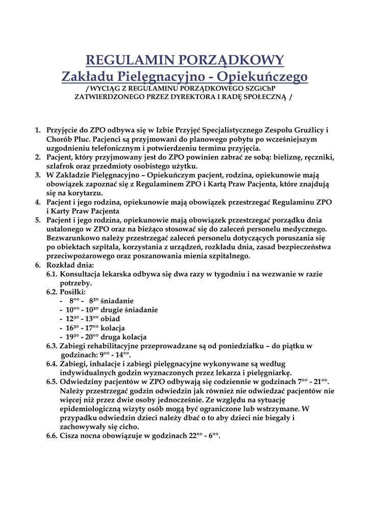 REGULAMIN PORZĄDKOWY Zakładu Pielęgnacyjno - Opiekuńczego / WYCIĄG Z REGULAMINU PORZĄDKOWEGO SZGiChP ZATWIERDZONEGO PRZEZ DYREKTORA I RADĘ SPOŁECZNĄ / 1. Przyjęcie do ZPO odbywa się w Izbie Przyjęć Specjalistycznego Zespołu Gruźlicy i Chorób Płuc. Pacjenci są przyjmowani do planowego pobytu po wcześniejszym uzgodnieniu telefonicznym i potwierdzeniu terminu przyjęcia. 2. Pacjent, który przyjmowany jest do ZPO powinien zabrać ze sobą: bieliznę, ręczniki, szlafrok oraz przedmioty osobistego użytku. 3. W Zakładzie Pielęgnacyjno – Opiekuńczym pacjent, rodzina, opiekunowie mają obowiązek zapoznać się z Regulaminem ZPO i Kartą Praw Pacjenta, które znajdują się na korytarzu. 4. Pacjent i jego rodzina, opiekunowie mają obowiązek przestrzegać Regulaminu ZPO i Karty Praw Pacjenta 5. Pacjent i jego rodzina, opiekunowie mają obowiązek przestrzegać porządku dnia ustalonego w ZPO oraz na bieżąco stosować się do zaleceń personelu medycznego. Bezwarunkowo należy przestrzegać zaleceń personelu dotyczących poruszania się po obiektach szpitala, korzystania z urządzeń, rozkładu dnia, zasad bezpieczeństwa przeciwpożarowego oraz poszanowania mienia szpitalnego. 6. Rozkład dnia: 6.1. Konsultacja lekarska odbywa się dwa razy w tygodniu i na wezwanie w razie potrzeby. 6.2. Posiłki: - 8°° - 8³° śniadanie - 10°° - 10³° drugie śniadanie - 12³° - 13°° obiad - 16³° - 17°° kolacja - 19³° - 20°° druga kolacja 6.3. Zabiegi rehabilitacyjne przeprowadzane są od poniedziałku – do piątku w godzinach: 9°° - 14°°. 6.4. Zabiegi, inhalacje i zabiegi pielęgnacyjne wykonywane są według indywidualnych godzin wyznaczonych przez lekarza i pielęgniarkę. 6.5. Odwiedziny pacjentów w ZPO odbywają się codziennie w godzinach 7°° - 21°°. Należy przestrzegać godzin odwiedzin jak również nie odwiedzać pacjentów nie więcej niż przez dwie osoby jednocześnie. Ze względu na sytuację epidemiologiczną wizyty osób mogą być ograniczone lub wstrzymane. W przypadku odwiedzin dzieci należy dbać o to aby dzieci nie biegały i zachowywały się cicho. 6.6. Cisza nocna obowiązuje w godzinach 22°° - 6°°. 7. Oglądanie programów telewizyjnych jest możliwe tylko z odbiorników zainstalowanych w szpitalu. 8. Pacjenci, ich rodziny i opiekunowie powinni wzajemnie szanować swoją godność, intymność, przekonania i zasady moralne. 9. W czasie wykonywania zabiegów pielęgnacyjnych w Sali chorych nie mogą przebywać osoby odwiedzające. 10. ZPO nie ponosi odpowiedzialności za pieniądze i przedmioty wartościowe nie zdane do depozytu. 11. Osoby odwiedzające pacjenta zobowiązane są każdorazowo przy wejściu do ZPO poinformować pielęgniarkę dyżurną. 12. Pacjenci spożywające własne produkty żywnościowe powinni przyjmować je zgodnie z zalecaną dietą. Nie można przechowywać produktów łatwo psujących się w szafkach przyłóżkowych i nie można spożywać produktów z otwartych opakowań, które nie były przechowywane w odpowiednich warunkach chłodniczych. Produkty łatwo psujące należy przechowywać w lodówce po uprzednim ich podpisaniu ( imię i nazwisko pacjenta ). 13. Pacjenci i osoby odwiedzające nie mogą pozostawiać na parapetach jedzenia i nie mogą dokarmiać ptaków. 14. Rodziny pacjentów i ich opiekunowie nie mogą indywidualnie korzystać z kuchni ZPO. 15. Pacjent może wyjść na przepustkę po uprzednim uzyskaniu zgody pisemnej przez Kierownika ZPO lub jego Zastępcę. 16. Pacjent może udać się poza teren ZPO po uprzednim poinformowaniu pielęgniarki dyżurnej i uzyskaniu przez nią zgody. 17. Informacje o stanie zdrowia pacjenta udzielane są tylko osobom z imienia i nazwiska wskazanym w dokumentacji medycznej. Nie udzielane są informacje telefoniczne dotyczące leczenia, czy samego pobytu. 18. Odzież pacjent może zostawić w szatni pacjentów lub może być ona zabrana do domu przez osoby towarzyszące choremu. Do ZPO należy zabrać tylko taką ilość rzeczy, które zmieszczą się w szafce przyłóżkowej. Nie można przechowywać rzeczy osobistych pacjenta pod łóżkiem, szafką itp.. 19. Uwagi dotyczące opieki medycznej pacjenci i ich rodziny, opiekunowie mogą składać osobiście Kierownikowi ZPO, Rzecznikowi Praw Pacjenta lub bezpośrednio Dyrektorowi Specjalistycznego Zespołu Gruźlicy i Chorób Płuc w Koszalinie. .................................................................. Data podpis Dyrektora Opracowała: Anna Burdziej ( Kierownik ZPO )