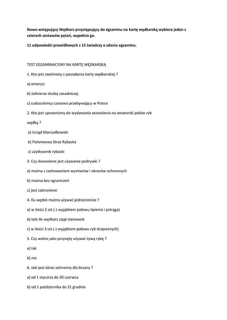 Nowo wstępujący Wędkarz przystępujący do egzaminu na kartę wędkarską wybiera jeden z czterech zestawów pytań, wypełnia go. 11 odpowiedzi prawidłowych z 15 świadczy o zdaniu egzaminu. TEST EGZAMINACYJNY NA KARTĘ WĘDKARSKĄ 1. Kto jest zwolniony z posiadania karty wędkarskiej ? a) emeryci b) żołnierze służby zasadniczej c) cudzoziemcy czasowo przebywający w Polsce 2. Kto jest uprawniony do wydawania zezwolenia na amatorski połów ryb wędką ? a) Urząd Marszałkowski b) Państwowa Straż Rybacka c) użytkownik rybacki 3. Czy dozwolone jest używanie podrywki ? a) można z zachowaniem wymiarów i okresów ochronnych b) można bez ograniczeń c) jest zabronione 4. Ilu wędek można używać jednocześnie ? a) w ilości 2 szt.( z wyjątkiem połowu lipienia i pstrąga) b) tyle ile wędkarz zajął stanowisk c) w ilości 3 szt.( z wyjątkiem połowu ryb drapieżnych) 5. Czy wolno jako przynęty używać żywą rybę ? a) tak b) nie 6. Jaki jest okres ochronny dla brzany ? a) od 1 stycznia do 30 czerwca b) od 1 października do 31 grudnia c) nie posiada 7. Czy dozwolone jest stosowanie ikry ryb jako przynęty ? a) nie b) tak 8. W jakiej odległości można wędkować od urządzeń hydrotechnicznych piętrzących wodę ? a) min. 100 m b) min. 50 m c) min. 150 m 9. Jaki jest okres ochronny dla węgorza ? a) nie posiada b) od 15 kwietnia do 15 maja c) od 15 czerwca do 15 lipca 10 Jaki jest limit dobowy połowu węgorza ? a) nie posiada limitu b) 2 sztuki c) 3 sztuki 11. Czy dozwolony jest połów ryb przez ich głuszenie ? a) nie b) tak 12. Jaki jest wymiar ochronny jazia ? a) do 25 cm b) do 15 cm c) nie posiada 13. Jaki jest wymiar ochronny lipienia ? a) do 35 cm b) nie posiada wymiaru ochronnego c) do 30 cm 14. Jaki jest wymiar ochronny świnki ? a) do 25 cm b) do 15 cm c) do 20 cm 15. Czy zezwala się do wprowadzania do obrotu ryb z amatorskiego połowu ryb? a) nie b) tak Ilość uzyskanych punktów ….......................... Stwierdzenie znajomości przepisów z 15 pytań – uzyskanie 11 pozytywnych odpowiedzi. TEST EGZAMINACYJNY NA KARTĘ WĘDKARSKĄ 1.W jakiej odległości można uprawiać amatorski połów ryb od urządzeń hydrotechnicznych piętrzących wodę ? a) min. 100 m b) min. 50 m c) min. 150 m 2. Jakie dokumenty uprawniają do amatorskiego połowu ryb ? a) karta wędkarska b) zezwolenie na połów ryb c) karta łowiectwa podwodnego 3. Czy dozwolone jest używanie podrywki ? a) można z zachowaniem wymiarów i okresów ochronnych b) można bez ograniczeń c) jest zabronione 4. Ilu wędek można używać wędkując metodą spławikową ? a) 2 szt.( z wyjątkiem połowu pstrąga i lipienia) b) bez ograniczeń c) 1 szt. 5. Czy wolno stosować sztuczne światło do lokalizacji i wabienia ryb ? a) tak, lecz tylko w porze dziennej b) nie wolno c) tak, lecz tylko w porze nocnej 6. Jaki jest okres ochronny dla głowacicy ? a) od 1 stycznia do 31 maja b) od 1 marca do 31 maja c) nie posiada 7. Jaki jest okres ochronny dla okonia ? a) nie posiada b) od 1 stycznia do 30 kwietnia c) od 1 marca do 31 maja 8. Jaki jest okres ochronny dla węgorza ? a) od 15 czerwca do 15 lipca b) od 15 lipca do 15 września c) od 15 kwietnia do 15 maja 9. Zakazowi połowów wędkarskich podlega ? a) ciosa b) sieja c) certa 10. Jaki jest okres ochronny dla świnki ? a) nie posiada b) od 1 stycznia do 15 maja c) od 15 marca do 15 maja 11. Jaki jest wymiar ochronny dla troci jeziorowej ? a) nie posiada wymiaru ochronnego b) 40 cm c) 50 cm 12. Jaki jest wymiar ochronny dla bolenia ? a) do 35 cm b) do 50 cm c) do 40 cm 13. Jaki jest wymiar ochronny dla suma ? a) do 50 cm b) nie posiada wymiaru ochronnego c) do 70 cm 14. Jaki jest wymiar ochronny dla jelca ? a) do 20 cm b) do 15 cm c) nie posiada wymiaru ochronnego 15.Zabrania się połowu ryb od rozstawionych w wodzie narzędzi połowowych uprawnionego do rybactwa w odległości mniejszej niż ? a) 100 m b) 75 m c) 50 m Ilość uzyskanych punktów ….......................... Stwierdzenie znajomości przepisów z 15 pytań – uzyskanie 11 pozytywnych odpowiedzi. TEST EGZAMINACYJNY NA KARTĘ WĘDKARSKĄ 1. Ile wynosi minimalna długość wędziska ? a) 20 cm b) 30 cm c) 50 cm 2. Czy dozwolone jest podnoszenie i opuszczanie przynęty w sposób ciągły, z wyjątkiem łowienia ryb pod lodem, podczas amatorskiego połowu ryb ? a) tak b) nie 3. Czy dozwolone jest używanie podrywki ? a) można z zachowaniem wymiarów i okresów ochronnych b) można bez ograniczeń c) jest zabronione 4. Jaki jest limit dzienny połowu dla węgorza ? a) 3 szt. b) 1 szt. c) 2 szt. 5. Czy rak błotny może być przedmiotem amatorskiego połowu ? a) tak, z zachowaniem wymiarów i okresów ochronnych b) nie może c) tak baz ograniczeń 6. W jakiej odległości można wędkować od urządzeń hydrotechnicznych piętrzących wodę ? a) min. 100 m b) min. 50 m c) min. 150 m 7. Kto jest zwolniony z posiadania karty wędkarskiej ? a) emeryci b) osoby do 14 roku życia c) osoby posiadające wyższe wykształcenie z zakresu rybactwa 8. Jaki jest okres ochronny dla leszcza ? a) od 1 marca do 30 kwietnia b) od 1 kwietnia do 31 maja c) nie posiada 9. Czy dozwolony jest amatorski połów ryb przy zastosowaniu sztucznego światła do ich lokalizacji i wabienia ? a) nie b) tak 10. Jaki jest wymiar ochronny dla suma ? a) do 65 cm b) do 70 cm c) do 80 cm 11. Jaki jest wymiar ochronny dla wzdręgi ? a) nie posiada wymiaru ochronnego b) do 12 cm c) do 15 cm 12. Jaki jest wymiar ochronny jazia ? a) do 25 cm b) do 15 cm c) do 20 cm 13. Jaki jest wymiar ochronny lipienia ? a) do 25 cm b) nie posiada wymiaru ochronnego c) do 30 cm 14. Jaki jest wymiar ochronny klenia ? a) do 45 cm b) do 25 cm c) do 20 cm 15.Czy dozwolony jest amatorski połów ryb przez ich głuszenie ? a) tak b) nie Ilość uzyskanych punktów ….......................... Stwierdzenie znajomości przepisów z 15 pytań – uzyskanie 11 pozytywnych odpowiedzi. TEST EGZAMINACYJNY NA KARTĘ WĘDKARSKĄ 1. Ile wynosi mini