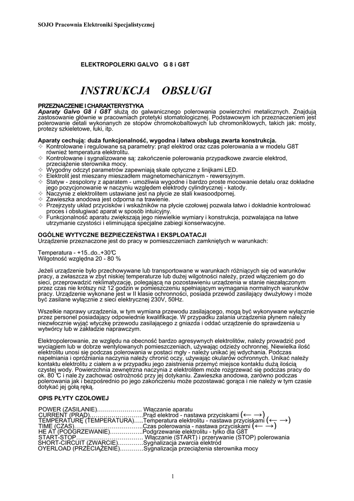SOJO Pracownia Elektroniki Specjalistycznej ELEKTROPOLERKI GALVO G 8 i G8T INSTRUKCJA OBSŁUGI PRZEZNACZENIE I CHARAKTERYSTYKA Aparaty Galvo G8 i G8T słuŜą do galwanicznego polerowania powierzchni metalicznych. Znajdują zastosowanie głównie w pracowniach protetyki stomatologicznej. Podstawowym ich przeznaczeniem jest polerowanie detali wykonanych ze stopów chromokobaltowych lub chromoniklowych, takich jak: mosty, protezy szkieletowe, łuki, itp. Aparaty cechują: duŜa funkcjonalność, wygodna i łatwa obsługą zwarta konstrukcja. Kontrolowane i regulowane są parametry: prąd elektrod oraz czas polerowania a w modelu G8T równieŜ temperatura elektrolitu. Kontrolowane i sygnalizowane są: zakończenie polerowania przypadkowe zwarcie elektrod, przeciąŜenie sterownika mocy. Wygodny odczyt parametrów zapewniają skale optyczne z linijkami LED. Elektrolit jest mieszany mieszadłem magnetomechanicznym - rewersyjnym. Statyw - zespolony z aparatem - umoŜliwia wygodne i bardzo proste mocowanie detalu oraz dokładne jego pozycjonowanie w naczyniu względem elektrody cylindrycznej - katody. Naczynie z elektrolitem ustawiane jest na płycie ze stali kwasoodpornej. Zawieszka anodowa jest odporna na trawienie. Przejrzysty układ przycisków i wskaźników na płycie czołowej pozwala łatwo i dokładnie kontrolować proces i obsługiwać aparat w sposób intuicyjny. Funkcjonalność aparatu zwiększają jego niewielkie wymiary i konstrukcja, pozwalająca na łatwe utrzymanie czystości i eliminująca specjalne zabiegi konserwacyjne. OGÓLNE WYTYCZNE BEZPIECZEŃSTWA I EKSPLOATACJI Urządzenie przeznaczone jest do pracy w pomieszczeniach zamkniętych w warunkach: Temperatura - +15..do..+30°C Wilgotność względna 20 - 80 % JeŜeli urządzenie było przechowywane lub transportowane w warunkach róŜniących się od warunków pracy, a zwłaszcza w zbyt niskiej temperaturze lub duŜej wilgotności naleŜy, przed włączeniem go do sieci, przeprowadzić reklimatyzację, polegającą na pozostawieniu urządzenia w stanie niezałączonym przez czas nie krótszy niŜ 12 godzin w pomieszczeniu spełniającym wymagania normalnych warunków pracy. Urządzenie wykonane jest w II klasie ochronności, posiada przewód zasilający dwuŜyłowy i moŜe być zasilane wyłącznie z sieci elektrycznej 230V, 50Hz. Wszelkie naprawy urządzenia, w tym wymiana przewodu zasilającego, mogą być wykonywane wyłącznie przez personel posiadający odpowiednie kwalifikacje. W przypadku zalania urządzenia płynem naleŜy niezwłocznie wyjąć wtyczkę przewodu zasilającego z gniazda i oddać urządzenie do sprawdzenia u wytwórcy lub w zakładzie naprawczym. Elektropolerowanie, ze względu na obecność bardzo agresywnych elektrolitów, naleŜy prowadzić pod wyciągiem lub w dobrze wentylowanych pomieszczeniach, uŜywając odzieŜy ochronnej. Niewielka ilość elektrolitu unosi się podczas polerowania w postaci mgły - naleŜy unikać jej wdychania. Podczas napełniania i opróŜniania naczynia naleŜy chronić oczy, uŜywając okularów ochronnych. Unikać naleŜy kontaktu elektrolitu z ciałem a w przypadku jego zaistnienia przemyć miejsce kontaktu duŜą ilością czystej wody. Powierzchnia zewnętrzna naczynia z elektrolitem moŜe rozgrzewać się podczas pracy do ok. 80 °C i nale Ŝy zachować ostroŜność przy jej dotykaniu. Zawieszka anodowa, zarówno podczas polerowania jak i bezpośrednio po jego zakończeniu moŜe pozostawać gorąca i nie naleŜy w tym czasie dotykać jej gołą ręką. OPIS PŁYTY CZOŁOWEJ POWER (ZASILANIE)………………….. Włączanie aparatu CURRENT (PRĄD)………………………Prąd elektrod - nastawa przyciskami (← →) TEMPERATURĘ (TEMPERATURA)…..Temperatura elektrolitu - nastawa przyciskami (← →) TIME (CZAS)……………………………..Czas polerowania - nastawa przyciskami (← →) HE AT (PODGRZEWANIE)……………..Podgrzewanie elektrolitu - tylko dla G8T START-STOP……………………………. Włączanie (START) i przerywanie (STOP) polerowania SHORT-CIRCUIT (ZWARCIE)………….Sygnalizacja zwarcia elektrod OYERLOAD (PRZECIĄśENIE)…………Sygnalizacja przeciąŜenia sterownika mocy 1 SOJO Pracownia Elektroniki Specjalistycznej DZIAŁANIE APARATU - OGÓLNIE Aparat - dzięki swoim funkcjom - zapewnia prowadzenie procesu elektropolerowania w sposób dokładny i wygodny. Elektrolit wlewany jest do nietłukącego naczynia zawierającego elektrodę cylindryczną katodę, którą moŜna łatwo usunąć z naczynia podczas mycia. Miedziana katoda pracuje poprawnie z większością elektrolitów, np. z elektrolitem firmy Dentaurum czy Renfert. Przewód elektrody cylindrycznej przyłączany jest do gniazda aparatu, umieszczonego pod tuleją statywu na płycie tylnej. W wykonaniu G8T aparat pozwala podgrzać elektrolit i stabilizować jego temperaturę. Naczynie aparatu G8T wyposaŜone jest w płaszcz grzejny, którego wyprowadzenie elektryczne łączy się z gniazdem umieszczonym w pobliŜu wyprowadzenia przewodu zasilającego (sieciowego). Przeznaczony do polerowania detal zawieszany jest na drutowej zawieszce, mocowanej w ruchomym zacisku na poziomym ramieniu statywu. Konstrukcja statywu umoŜliwia dokładne pozycjonowanie detalu względem elektrody cylindrycznej. Na poziomym ramieniu statywu moŜe teŜ być umieszczona elektroda pomocnicza AE (wyposaŜenie dodatkowe) wspomagająca polerowanie głębokich wnęk odlewu. W wyposaŜeniu aparatu znajdują się dwie zawieszki drutowe: miedziana - ulegająca trawieniu, o małej oporności elektrycznej i specjalna - nieulegająca trawieniu, ale o większej oporności elektrycznej. Zaleca się stosowanie zawieszki specjalnej. UŜytkownik moŜe dokonać wyboru w oparciu o własne doświadczenia czy przyzwyczajenia. Elektrolit jest mieszany - umieszczanym w naczyniu - prętem mieszadła magnetycznego, wprawianym w ruch obrotowy polem magnetycznym, wytwarzanym wewnątrz aparatu, (co kilkanaście s
