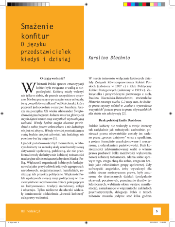 Smażenie konfitur O języku przedstawicielek kiedyś i dzisiaj O czyją wolność? W historii Polski sprawa emancypacji kobiet była związana z walką o niepodległość. Kobiety miały walczyć nie tylko o siebie, ale przede wszystkim o ojczyznę. Nie bez przyczyny po raz pierwszy usłyszały, że są „współobywatelkami” od Kościuszki, który poprosił jednocześnie o szarpie i bandaże. Jeszcze na początku XX wieku Aleksander Świętochowski pisał wprost: kobieta musi za główny cel swych dążeń uznać ową wszystkich wyzwalającą wolność. Wtedy będzie mogła słusznie powiedzieć o sobie: jestem człowiekiem i nic ludzkiego nie jest mi obcym. Wtedy również powiedzianym o niej będzie: oto jest człowiek i nic ludzkiego nie powinno być jej odjętym [1]. Upadek państwowości był momentem, w którym kobiety na szeroką skalę uruchomiły swoją aktywność społeczną, publiczną, ale nie przeformułowały definitywnie kobiecej tożsamości tradycyjne silnie związanej z byciem Matką-Polką. Większość organizacji kobiecych funkcjonowała jako przybudówki różnych ugrupowań: narodowych, socjalistycznych, katolickich, realizując ich projekty polityczne. Większość Polek upatrywała swojej misji politycznej w macierzyństwie i wychowaniu dzieci, polegającym na kultywowaniu tradycji narodowej, religii i obyczaju. Tylko nieliczne działaczki widziały konieczność oddzielenia „kwestii kobiecej” od sprawy wolności. Od redakcji F 9 (u).indd 5 Karolina Błachnio W nurcie interesów wyłącznie kobiecych działały Związek Równouprawnienia Kobiet Polskich (założony w 1907 r.) i Klub Polityczny Kobiet Postępowych (założony w 1919 r.). Założycielka i przywódczyni pierwszego z nich, Paulina Kuczalska-Reinschmitt, stwierdziła: Historia naszego ruchu (...) uczy nas, że kobiety przez czynny udział w „walce o wyzwolenie wszystkich” jeszcze przez to praw obywatelskich dla siebie nie zdobywają [2]. Brak polskiej Emily Davidson Polskie kobiety nie walczyły o swoje interesy tak radykalnie jak sufrażystki zachodnie, ponieważ prawa obywatelskie zostały im nadane przez „proces dziejowy” wraz z upadkiem, a potem formalnie usankcjonowane i rozszerzone, z odzyskaniem państwowości. Brak konieczności zdeterminowanej walki o własne prawa pozbawił Polki możliwości wykuwania nowej kobiecej tożsamości, zdania sobie sprawy z tego, czego chcą dla siebie, czego im brakuje jako członkiniom grupy społecznej. Gdy sufrażystki angielskie, żeby wywalczyć dla siebie równe mężczyznom prawa, były zmuszone do drastycznych działań (podpalanie skrzynek pocztowych, przecinanie drutów telefonicznych, wybijanie okien wystaw, manifestacje), zamykano je w więzieniach i zakładach psychiatrycznych, delegacja Polek z trzech zaborów musiała jedynie stać kilka godzin 5 2012-05-21 11:00:55 na mrozie, żeby wręczyć Piłsudskiemu petycję w sprawie praw wyborczych kobiet. Piłsudski wydał dekret, w którym ustosunkował się pozytywnie do tych postulatów i ustanowił prawa wyborcze bez względu na płeć w 1918 r. (potwierdziła to Konsytytucja Marcowa z 1821 r.). Przyczyn obecnego braku masowego ruchu feministycznego, rozumianego jako próby faktycznego, nie tylko formalno-prawnego, zrównania praw kobiet i mężczyzn, należy szukać właśnie tam – w braku walki i braku męczenniczek ruchu (odpowiedniczki Emily Davison, która zmarła po rzuceniu się pod kopyta pędzącego konia księcia Jerzego V). Te wypełnione deficyty mogłyby być źródłami poczucia grupowej siły i tożsamości, ponieważ właśnie walka umożliwia zmierzenie własnej siły i możliwości oddziaływania. Polki zbyt łatwo otrzymały prawa obywatelskie, wyborcze i prawdopodobnie dlatego nie potrafią ich docenić. Co więcej, następstwem otrzymania tych praw nie stało się wytworzenie świadomości grupowej „podobieństwa losu zdeterminowanego płcią”, co miało miejsce na Zachodzie [3]. Samoograniczenie – mimikra Zdobywaniu nowych praw i działalności reprezentantek kobiet w XIX wieku i przed II wojną światową towarzyszyło powstawanie charakterystycznego dla sprawy języka. Zarówno kobiety zabiegające o prawa i nowe role społeczne (wejście na rynek pracy, na uczelnie), jak i mężczyźni – publicyści, niespokojni o równowagę między płciami oraz ład społeczny i polityczny, używali metaforyki kuchenno-domowej. Kobieta aktywna publicznie była określana jako dobra, mądra gospodyni, która uporządkuje państwo, tak samo jak gospodarstwo domowe [4]. A wszystko po to, żeby uspokoić społeczeństwo. Używanie metaforyki związanej z domem, dawało sprawie też posłuch, bo nawiązywało do wyidealizowanego obrazu Matki-Polki. Powodem, dla którego nowy język musiał powstać, były m.in. wcześniejsze negatywne do- 6 F 9 (u).indd 6 świadczenia pisarstwa kobiecego. Pisarki II połowy XIX wieku, będące, zgodnie z obowiązującymi nurtami realizmu i naturalizmu, zaangażowane społecznie i ukazujące w swojej literaturze mechanizmy rządzące społeczeństwem, były przedmiotem zmasowanego ataku ze strony męskiej części krytyki. Publicyści podważali ich prawo do pisania, mówienia, reprezentowania: Położenie ówczesnych kobiet literatek nie było godnym zazdrości. Ostre i uprzedzone krytyki, złośliwe przycinki, napędzanie do kuchni (…), nareszcie plotki, intrygi i potwarze były codziennymi pociskami, którymi obrzucano te pionierki działalności kobiecej na polu literatury [5]. Pisanie kobiece było porównywane do smażenia konfitur, prób zastosowania przepisów kucharskich w dziedzinie sztuki, fatałaszków – przy czym wszystkie te porównania miały wydźwięk pejoratywny. Szczególnie zaciekle atakowane było odsłanianie ważnych problemów kobiecych, np. przez Gabrielę Zapolską (problem niechcianych dzieci, podziemie aborcyjne, prostytucja, choroby weneryczne, przemoc w małżeństwach), co burzyło patriarchalny porz