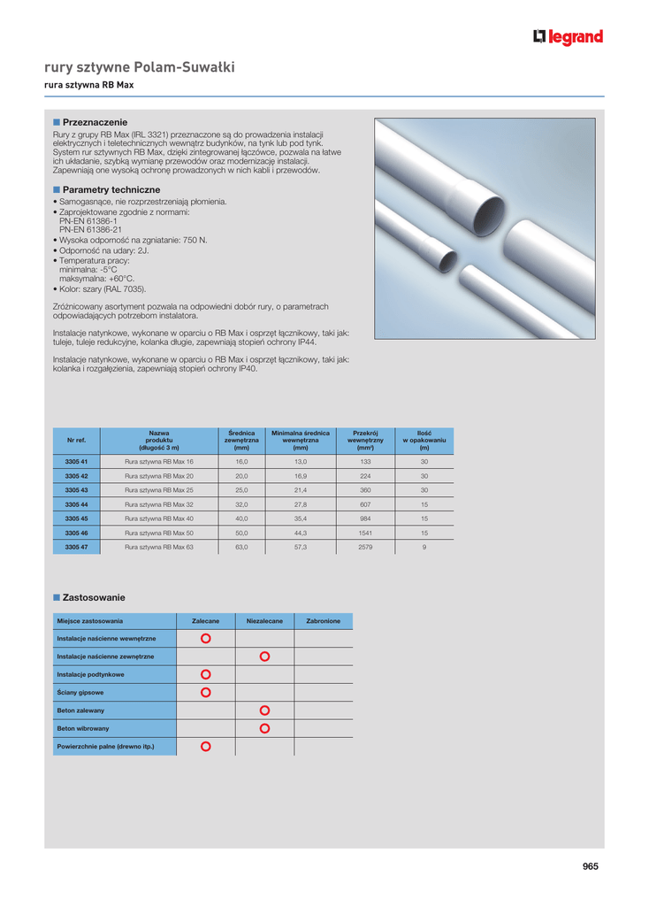 rury sztywne Polam-Suwałki rura sztywna RB Max n Przeznaczenie Rury z grupy RB Max (IRL 3321) przeznaczone są do prowadzenia instalacji elektrycznych i teletechnicznych wewnątrz budynków, na tynk lub pod tynk. System rur sztywnych RB Max, dzięki zintegrowanej łączówce, pozwala na łatwe ich układanie, szybką wymianę przewodów oraz modernizację instalacji. Zapewniają one wysoką ochronę prowadzonych w nich kabli i przewodów. n Parametry techniczne • Samogasnące, nie rozprzestrzeniają płomienia. • Zaprojektowane zgodnie z normami: PN-EN 61386-1 PN-EN 61386-21 • Wysoka odporność na zgniatanie: 750 N. • Odporność na udary: 2J. • Temperatura pracy: minimalna: -5°C maksymalna: +60°C. • Kolor: szary (RAL 7035). Zróżnicowany asortyment pozwala na odpowiedni dobór rury, o parametrach odpowiadających potrzebom instalatora. Instalacje natynkowe, wykonane w oparciu o RB Max i osprzęt łącznikowy, taki jak: tuleje, tuleje redukcyjne, kolanka długie, zapewniają stopień ochrony IP44. Instalacje natynkowe, wykonane w oparciu o RB Max i osprzęt łącznikowy, taki jak: kolanka i rozgałęzienia, zapewniają stopień ochrony IP40. Nr ref. Nazwa produktu (długość 3 m) Średnica zewnętrzna (mm) Minimalna średnica wewnętrzna (mm) Przekrój Ilość wewnętrzny w opakowaniu 2 (mm )(m) 3305 41 Rura sztywna RB Max 16 16,0 13,0 133 30 3305 42 Rura sztywna RB Max 20 20,0 16,9 224 30 3305 43 Rura sztywna RB Max 25 25,0 21,4 360 30 3305 44 Rura sztywna RB Max 32 32,0 27,8 607 15 3305 45 Rura sztywna RB Max 40 40,0 35,4 984 15 3305 46 Rura sztywna RB Max 50 50,0 44,3 1541 15 3305 47 Rura sztywna RB Max 63 63,0 57,3 2579 9 n Zastosowanie Miejsce zastosowania Zalecane Niezalecane Zabronione Instalacje naścienne wewnętrzne Instalacje naścienne zewnętrzne Instalacje podtynkowe Ściany gipsowe Beton zalewany Beton wibrowany Powierzchnie palne (drewno itp.) 965