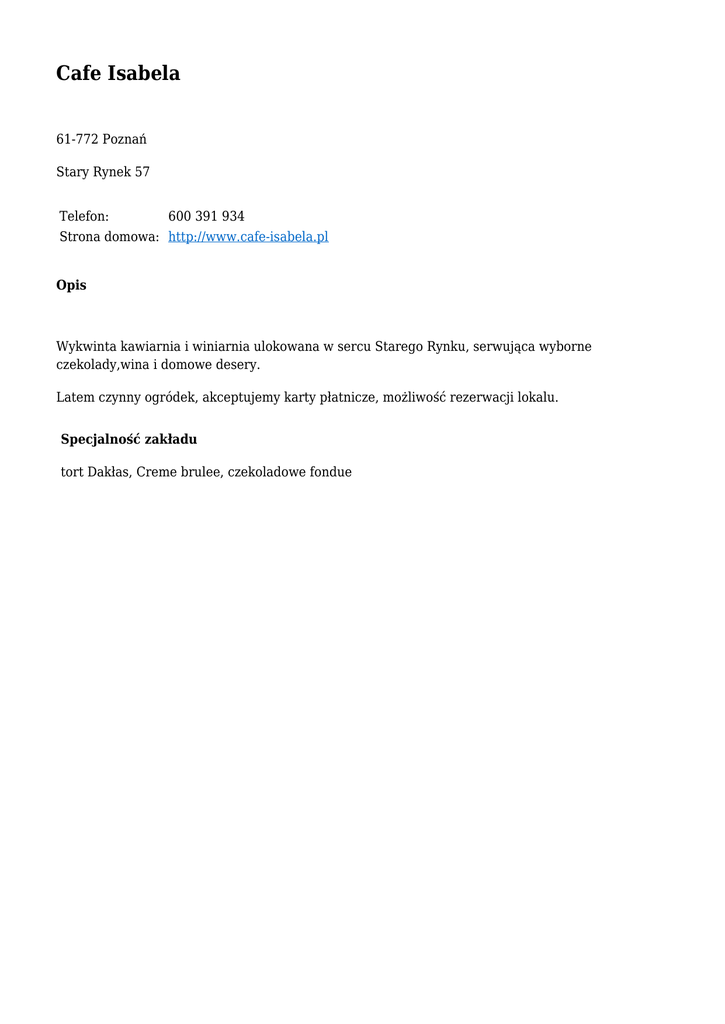 Cafe Isabela 61-772 Poznań Stary Rynek 57 Telefon: 600 391 934 Strona domowa: http://www.cafe-isabela.pl Opis Wykwinta kawiarnia i winiarnia ulokowana w sercu Starego Rynku, serwująca wyborne czekolady,wina i domowe desery. Latem czynny ogródek, akceptujemy karty płatnicze, możliwość rezerwacji lokalu. Specjalność zakładu tort Dakłas, Creme brulee, czekoladowe fondue