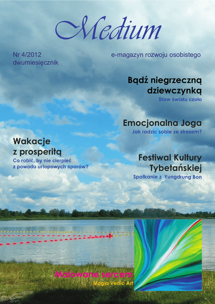 Medium Nr 4/2012 dwumiesięcznik e-magazyn rozwoju osobistego Bądź niegrzeczną dziewczynką Staw światu czoło Wakacje z prosperitą Emocjonalna Joga Jak radzic sobie ze stresem? Festiwal Kultury Tybetańskiej Co robić, by nie cierpieć z powodu urlopowych sporów? Spotkanie z Yungdrung Bon Malowane sercem Magia Vedic Art Na dzień dobry... W wakacyjnym nastroju, w środku lata, piszemy dla Was o emocjach. Temat powszedni, a jednocześnie ogromnie ważny. Często bywa bolesnym problemem, który dotyka każdego niemal człowieka. Szczerze powiedziawszy, nie spotkałam dotąd osoby, która nie podlegałaby emocjom. Natomiast znam wiele takich ludzi, którzy świetnie sobie z nimi radzą. Nie tłumią, nie wypierają, lecz umieją mądrze je uwolnić. W języku trenerów rozwoju mówimy o zarządzaniu emocjami. Żal, gniew, smutek, zazdrość nie tylko psują nam humor i odbierają chęć beztroskiej zabawy na plaży czy w cieniu drzew nad jeziorem. Nie uzdrawiane prowadzą do wielu chorób mniejszych lub większych. Psychosomatyka wyraźnie pokazuje zależność pomiędzy negatywnymi emocjami, a różnymi dolegliwościami, nękającymi człowieka. Na pewnym etapie rozwoju stajemy się bardziej zdystansowani do życia. Akceptujemy różne niedogodności i spokojnie godzimy się na to, że inni ludzie nie spełniają naszych oczekiwań. To stan wewnętrznego pokoju, który pozwala czuć sie naprawde szczęsliwym człowiekiem. Im więcej w nas tego stanu, tym nasze życie staje sie piękniejsze. Wolność od negatywnych emocji rodzi się z akceptacji i tolerancji, a te z kolei z pozytywnego myślenia i postrzegania świata przez różowe okulary. Jedną z ciekawszych filozofii, która pozwala nam wyciszyć emocje i nabrać dystansu poprzez uwolnienie od przywiązań jest buddyzm. W tym numerze piszemy o jego prapoczatkach, o pierwotnej formie nazywanej Bon. Poczytajcie proszę, ile dobrej energii niesie w sobie dla każdego. str. 1 Ponadto, jak zawsze, proponujemy Wam przeróżne metody, które pomagają w poznawaniu i uzdrawianiu siebie. Na uwagę zasługuje zarówno wielobarwne Vedic Art, jak i zupełnie nowa w naszym kraju metoda Uzdrawiania Rekonektywnego. Do poczytania szczególnie polecam opowieść Ady o jej spotkaniu z regresingiem. Oto zupelnie niezwykłe spojrzenie na to, co było być może w innych wcieleniach. Każdy z nas może stanąć na miejscu autorki i doświadczyć podobnych doznań. Magia to, czy niezbadana dotąd rzeczywistość? - na to pytanie musimy sami sobie odpowiedzieć. Jak zwykle polecam wszystkim zabawne przygody kota Petroniusza, opowieści o drzewach, szczyptę anielskich tematów, poznawanie sekretów szczęsliwego związku, a najmłodszym bajeczkę o wrażliwym żółwiku. Wierzę, że nie tylko w deszczowy wieczór, ale i w słoneczny, upalny dzień, nasi przemili Czytelnicy bedą nam towarzyszyć, czytając Medium w cieniu plażowego parasola. Medium W numerze Psychologicznie Psychologicznie Bajecznie Psychosomatyka ............................... 3 Bajka o wrażliwym żółwiu .................35 Emocje i uczucia ................................8 Wakacje z prosperitą ........................ 38 Emocjonalna Joga ............................. 5 Bądź niegrzeczną dziewczynką .........10 Sekret szczęśliwego związku Pielęgnowanie miłości ....................... 13 Trauma i stres .................................... 15 Szkolny Matrix ................................... 18 Naturalnie Dar Natury ......................................... 21 Magia Drzew Dąb .................................................... 23 Prosperująco Enegetyka dawania .......................... Praktycznie Moje spotkanie z Vedic Art ............... 41 Malowane sercem ............................ 42 Mudry cz 2. .......................................45 Radzimy sobie ze stresem cz. 1 .......48 Światło Reiki w moim życiu .............. 50 Refleksje o Reiki Nauczyciele ...................................... 52 Magicznie Astrologia Karma w horoskopie ........................ 54 Terapia Rekonektywna ..................... 56 Uniwersalnie Metamedycyna ................................. 59 Duchowo Anielsko ..............................................25 Przygoda z regresingiem ...,,,,,,,,........ 26 Ludzie, którzy nas inspirują Chongtrul Rinpoche ..............,,........... 31 Naszym przeznaczeniem są gwiazdy ............................................ 62 Perskim Okiem ................................. 66 Recenzje .......................................... 69 Festiwal Kultury Tybetańskiej............. 33 str. 2 Medium Psychologicznie Bogusława M. Andrzejewska - trener rozwoju osobistego, publicystka, konsultant NAO, nauczyciel reiki, astropsycholog, numerolog. http://prosperita.edu.pl Psychosomatyka Negatywnych emocji doświadcza każdy z nas. Tak jesteśmy skonstruowani. Można jednak i chyba warto spróbować poradzić sobie z tym tematem. Wbrew wszystkiemu emocje nie muszą nami rządzić i nie musimy wcale im podlegać. Możemy sprawnie nimi zarządzać i uwalniać je bez szkody dla siebie. Najważniejsze to uświadomić sobie, że są czymś naturalnym i mamy do nich pełne prawo. Nie są niczym złym. Nie można czuć się winnym, że w wyniku jakiegoś wydarzenia odczuwamy gniew czy żal. Nie ma znaczenia, jak długo już pracujemy nad własnym rozwojem. Mądrość z tego rozwoju wynikająca, to właśnie umiejętność radzenia sobie z tym, co czujemy i nie poddawanie się temu, czego nie chcemy doświadczać. Możemy świadomie odczuwać te emocje bez wyrzutów sumienia i równie świadomie zastosować jakąś metodę, aby je rozładować lub uwolnić. Pełen agresji gniew sam w sobie jest tylko nadmiarem energii. Daje nam siłę, aby wytrzepać dywan, przestawić meble, zbudować dom. Można go wykorzystać do wykonania tego, co trudne i wymaga wysiłku. Można też dzięki niemu przyjrzeć się sobie i zadać sobie pytanie, jaki aspekt wewnątrz nas wymaga uzdro