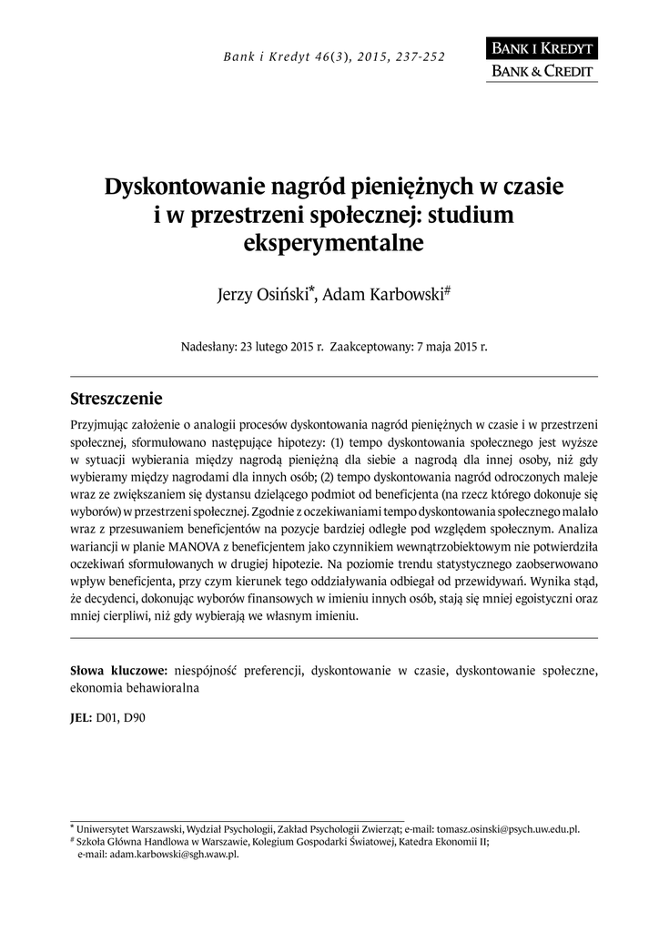 B ank i Kredy t 46(3), 2015, 237-252 Dyskontowanie nagród pieniężnych w czasie i w przestrzeni społecznej: studium eksperymentalne Jerzy Osiński*, Adam Karbowski# Nadesłany: 23 lutego 2015 r. Zaakceptowany: 7 maja 2015 r. Streszczenie Przyjmując założenie o analogii procesów dyskontowania nagród pieniężnych w czasie i w przestrzeni społecznej, sformułowano następujące hipotezy: (1) tempo dyskontowania społecznego jest wyższe w sytuacji wybierania między nagrodą pieniężną dla siebie a nagrodą dla innej osoby, niż gdy wybieramy między nagrodami dla innych osób; (2) tempo dyskontowania nagród odroczonych maleje wraz ze zwiększaniem się dystansu dzielącego podmiot od beneficjenta (na rzecz którego dokonuje się wyborów) w przestrzeni społecznej. Zgodnie z oczekiwaniami tempo dyskontowania społecznego malało wraz z przesuwaniem beneficjentów na pozycje bardziej odległe pod względem społecznym. Analiza wariancji w planie MANOVA z beneficjentem jako czynnikiem wewnątrzobiektowym nie potwierdziła oczekiwań sformułowanych w drugiej hipotezie. Na poziomie trendu statystycznego zaobserwowano wpływ beneficjenta, przy czym kierunek tego oddziaływania odbiegał od przewidywań. Wynika stąd, że decydenci, dokonując wyborów finansowych w imieniu innych osób, stają się mniej egoistyczni oraz mniej cierpliwi, niż gdy wybierają we własnym imieniu. Słowa kluczowe: niespójność preferencji, dyskontowanie w czasie, dyskontowanie społeczne, ekonomia behawioralna JEL: D01, D90 * Uniwersytet Warszawski, Wydział Psychologii, Zakład Psychologii Zwierząt; e-mail: [email protected]. Główna Handlowa w Warszawie, Kolegium Gospodarki Światowej, Katedra Ekonomii II; e-mail: [email protected]. # Szkoła 238 J. O s i ń s k i, A. Karb o w sk i 1. Wstęp Ekonomiści behawioralni przeprowadzili wiele badań empirycznych, w których obserwowano niespójność preferencji w czasie (Benhabib, Bisin, Schotter 2010; Gruber, Koszegi 2001; Laibson 1997; O’Donoghue, Rabin 1999; Prelec 2004). Zjawisko tzw. odwrócenia preferencji (ang. preference reversal), będące przykładem czasowej niespójności preferencji, wskazuje na trudności decydenta z utrzymaniem samokontroli (Zielonka, Sawicki, Weron 2009). Wartościowanie przez decydenta, który nadmierną wagę – w porównaniu z dyskontowaniem wykładniczym − przywiązuje do najbliższej przyszłości, modeluje się za pomocą hiperbolicznej funkcji dyskonta (Graczyk 2009). W przypadku dyskontowania w czasie decydenci dokonują wyborów pomiędzy wypłatami dla siebie w różnych momentach czasu. Czas nie jest jednak jedynym wymiarem, w którym można zaobserwować zjawisko niespójności preferencji. Rachlin i Jones (2008a) pokazali, że hiperboliczna funkcja dyskonta trafnie opisuje wybory decydentów w przestrzeni społecznej. Dokonują oni wyborów pomiędzy wypłatami dla osób zajmujących różne pozycje na osi dystansu społecznego. Na osi tej uporządkowane są osoby zgodnie z kryterium malejącej bliskości w stosunku do decydenta. Pierwszą pozycję zajmuje osoba najbliższa decydentowi, a ostatnią osoba znana mu tylko z widzenia. Podobnie jak w przypadku dyskontowania w czasie, również w zakresie dyskontowania społecznego model hiperboliczny charakteryzuje się wysokim dopasowaniem do danych empirycznych (Jones, Rachlin 2006; Ostaszewski, Osiński 2011). Model hiperboliczny w zakresie dyskontowania społecznego można przedstawić następująco: V = A/(1 + sN) (1) gdzie: V − subiektywna, zdyskontowana wartość nagrody (wypłaty1) dla osoby innej niż decydent, A − rzeczywista wartość tej nagrody, N − odległość między decydentem a daną osobą na osi dystansu społecznego, s − szybkość zmniejszania się subiektywnej wartości nagrody wraz ze wzrostem dystansu społecznego (jego wysoka wartość oznacza szybkie tempo dyskontowania). W ujęciu Rachlina i Jonesa (2009) zarówno dyskontowanie w czasie, jak i dyskontowanie społeczne wiążą się z tzw. rozległością ja (ang. the extended self). Dyskontowanie nagród odroczonych zależy od „rozległości ja” w czasie, a dyskontowanie społeczne od „rozległości ja” w przestrzeni społecznej. „Rozległość ja” w czasie odnosi się do dostrzegania związku między sobą teraz i sobą w przyszłości, a „rozległość ja” w przestrzeni społecznej wiąże się z dostrzeganiem przez decydenta realnie istniejących zależności między interesem własnym a interesem innych osób. Podobny punkt widzenia prezentują Dewitte i De Cremer (2001). Dyskontowanie nagród odroczonych i dyskontowanie społeczne mogą więc być postrzegane jako analogiczne procesy, co wydaje się potwierdzać zaobserwowana przez Jonesa i Rachlina (2009) dodatnia korelacja między tempem dyskontowania w tych dwóch obszarach. Proces dyskontowania odroczonych nagród w czasie determinuje ich atrakcyjność dla decydenta. Z kolei proces dyskontowania społecznego determinuje atrakcyjność nagrody dla innych osób, a główną zmienną w tym procesie jest dystans społeczny. Tempo dyskontowania nagród odroczonych mierzy się, ustalając, czy jednostka preferuje mniejszą nagrodę pieniężną, ale szybciej dostępną, czy większą, 1 Zielonka, Sawicki i Weron (2009) zamiast terminu „nagroda pieniężna” używają terminu „wypłata”. Dyskontowanie nagród pieniężnych... 239 dostępną po upływie dłuższego czasu (Bańbuła 2006; Loewenstein, Prelec 1992). Opóźnienie otrzymania każdej z tych nagród o taki sam okres sprzyja samokontroli, tj. wybraniu większej nagrody dostępnej później (Ainslie, Herrnstein 1981; Hyten, Madden, Field 1994; Rachlin, Green 1972; Holden 2012). W przypadku alternatywy „50 zł dzisiaj lub 100 zł jutro” albo „50 zł za rok lub 100 zł za rok i jeden dzień” prawdopodobieństwo wybrania 100 zł jest wyższe w drugiej propozycji. W badaniach dyskontowania społecznego prowadzonych przez Rachlina i
