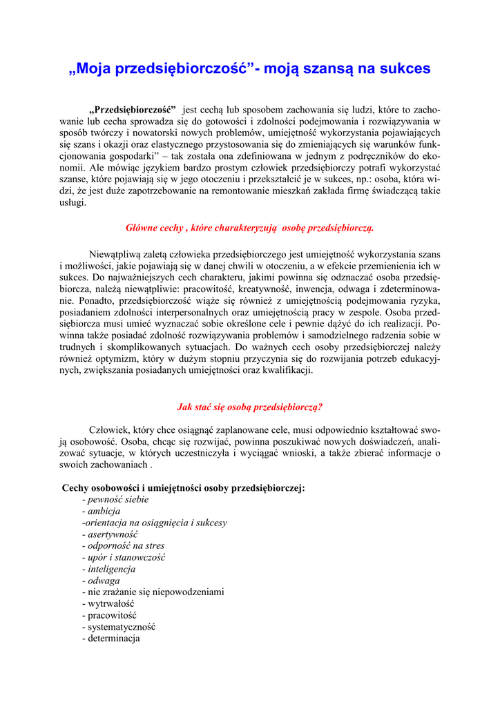 „Moja przedsiębiorczość”- moją szansą na sukces „Przedsiębiorczość” jest cechą lub sposobem zachowania się ludzi, które to zachowanie lub cecha sprowadza się do gotowości i zdolności podejmowania i rozwiązywania w sposób twórczy i nowatorski nowych problemów, umiejętność wykorzystania pojawiających się szans i okazji oraz elastycznego przystosowania się do zmieniających się warunków funkcjonowania gospodarki” – tak została ona zdefiniowana w jednym z podręczników do ekonomii. Ale mówiąc językiem bardzo prostym człowiek przedsiębiorczy potrafi wykorzystać szanse, które pojawiają się w jego otoczeniu i przekształcić je w sukces, np.: osoba, która widzi, że jest duże zapotrzebowanie na remontowanie mieszkań zakłada firmę świadczącą takie usługi. Główne cechy , które charakteryzują osobę przedsiębiorczą. Niewątpliwą zaletą człowieka przedsiębiorczego jest umiejętność wykorzystania szans i możliwości, jakie pojawiają się w danej chwili w otoczeniu, a w efekcie przemienienia ich w sukces. Do najważniejszych cech charakteru, jakimi powinna się odznaczać osoba przedsiębiorcza, należą niewątpliwie: pracowitość, kreatywność, inwencja, odwaga i zdeterminowanie. Ponadto, przedsiębiorczość wiąże się również z umiejętnością podejmowania ryzyka, posiadaniem zdolności interpersonalnych oraz umiejętnością pracy w zespole. Osoba przedsiębiorcza musi umieć wyznaczać sobie określone cele i pewnie dążyć do ich realizacji. Powinna także posiadać zdolność rozwiązywania problemów i samodzielnego radzenia sobie w trudnych i skomplikowanych sytuacjach. Do ważnych cech osoby przedsiębiorczej należy również optymizm, który w dużym stopniu przyczynia się do rozwijania potrzeb edukacyjnych, zwiększania posiadanych umiejętności oraz kwalifikacji. Jak stać się osobą przedsiębiorczą? Człowiek, który chce osiągnąć zaplanowane cele, musi odpowiednio kształtować swoją osobowość. Osoba, chcąc się rozwijać, powinna poszukiwać nowych doświadczeń, analizować sytuacje, w których uczestniczyła i wyciągać wnioski, a także zbierać informacje o swoich zachowaniach . Cechy osobowości i umiejętności osoby przedsiębiorczej: - pewność siebie - ambicja -orientacja na osiągnięcia i sukcesy - asertywność - odporność na stres - upór i stanowczość - inteligencja - odwaga - nie zrażanie się niepowodzeniami - wytrwałość - pracowitość - systematyczność - determinacja - kreatywność - komunikatywność - szybkie podejmowanie decyzji - takt i talenty dyplomatyczne - podejmowanie trafnych decyzji - wykorzystywanie szans -umiejętność przyjmowania porażek i wyciągania konstruktywnych wniosków Jakie warunki muszą być spełnione , aby cechy przedsiębiorczości mogły się rozwijać ? Rozwojowi przedsiębiorczości sprzyjają następujące czynniki : • system ekonomiczny danego kraju (system rynkowy pobudza przedsiębiorczość, system scentralizowany ją hamuje) • indywidualne cechy człowieka, jego intuicja i wyczucie rynku • wykształcenie • kultura otoczenia danego człowieka Z przedsiębiorczością łączą się również pojęcia : • Ekspansywność – termin ten oznacza wytaczanie sobie ambitnych zadań i celów których realizacja pozwala na osiągnięcie większych niż dotychczas efektów. Ekspansywność to dążenie do dorównania najsilniejszym i najlepszym • Innowacyjność – wprowadzanie wszelkich twórczych ulepszeń – od drobnych usprawnień do rewolucyjnych zmian w organizacji i technice Innowacyjność i ekspansywność, a więc postawy kładące nacisk na stały rozwój, uważa się za charakterystyczne cechy przedsiębiorczości. Rodzaje przedsiębiorczości. W zależności od warunków mających decydujący wpływ na rozwój przedsiębiorczości wyróżnia się kilka jej typów: • przedsiębiorczość żywiołowa - wynika z cech charakterologicznych człowieka • przedsiębiorczość ewolucyjna - jest ona efektem rozwoju form przedsiębiorczych. • przedsiębiorczość systemowa - dotyczy ona gospodarek krajów rozwiniętych, jest związana ze świadomym kształtowaniem przez państwo społeczeństwa przedsiębiorczego. Powszechny jest pogląd że przedsiębiorczość sprowadza się do zakładania i prowadzenia małych przedsiębiorstw. Nie ulega wątpliwości, że taka działalność jest najważniejszym przejawem przedsiębiorczości, nie można jednak zapominać, iż przedsiębiorczość ma również szerszy wymiar. Z postawami kładącymi nacisk na ekspansywność i innowacyjność możemy się zetknąć w przedsiębiorstwach, jak i w życiu codziennym. Niezależność, liczenie na własne siły, ambicja do osiągnięcia jak najwyższych efektów, szukanie jak najlepszych rozwiązań w pracy zawodowej, efektywne gospodarowanie posiadanymi środkami – również stanowią objaw przedsiębiorczości mimo iż nie towarzyszy im prowadzenie własnej działalności gospodarczej. Często mianem człowieka przedsiębiorczego okresami kogoś, kto: • wykazuje inicjatywę i nie boi się nowych wyzwań • • • • umie liczyć na własne siły podejmuje trafne decyzje nie zraża się niepowodzeniami, jest wytrwały i konsekwentny w działaniu wykorzystuje szanse jakie dostrzega w swoim otoczeniu i zamienia je w sukces. Uczniowie Zespołu Szkół im. Adama Wodziczki zamierzają zostać przedsiębiorczymi uczniami. Uczestniczą w projekcie „Uczniowie Szkół zawodowych - rynek pracy na Was czeka”. Realizacja projektu trwa dwa lata. Poprzez uczestnictwo w zajęciach poznają rynek pracy, jego zasady funkcjonowania, dokonują analizy własnych możliwości i planów edukacyjno-zawodowych, uczą się efektywnie zarządzać swoim czasem. współdziałać w zespole. Poznają etapy założenia i prowadzenia własnego przedsiębiorstwa. Pozwoli to każdemu z nich na szczerą odpowiedź na pytanie: czy nadaje się do działa