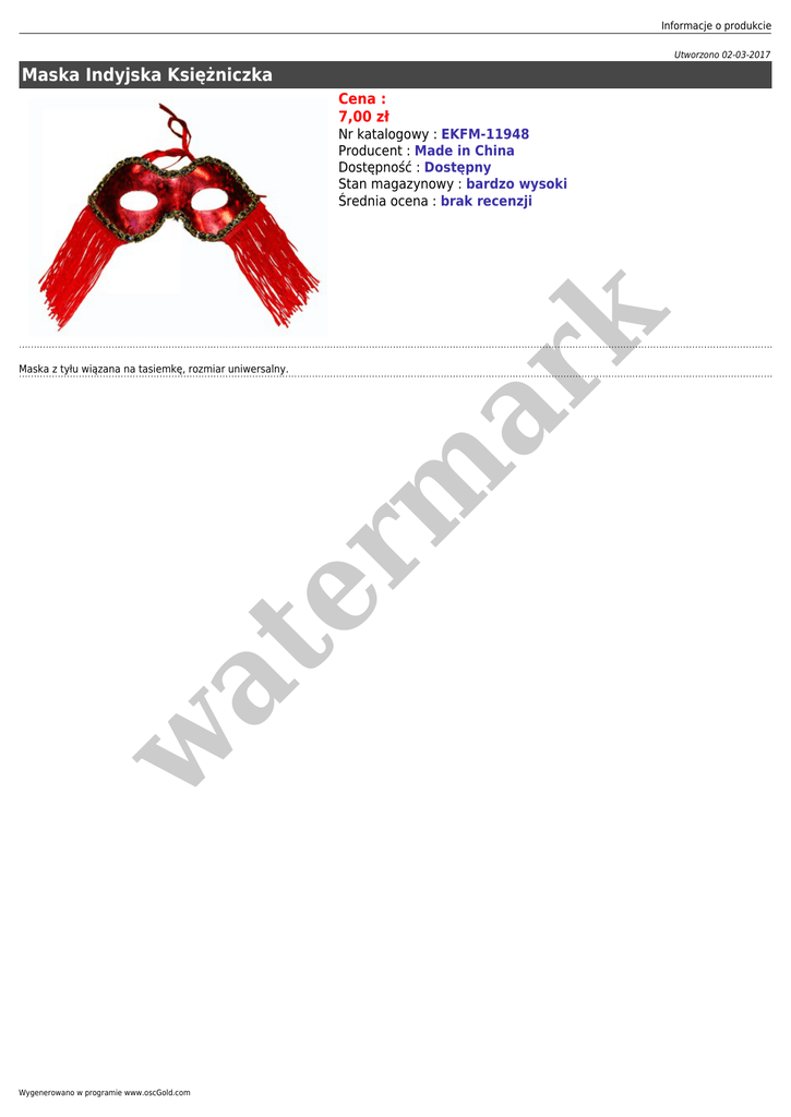 Informacje o produkcie Utworzono 02-03-2017 Maska Indyjska Księżniczka Cena : 7,00 zł er m ar k Nr katalogowy : EKFM-11948 Producent : Made in China Dostępność : Dostępny Stan magazynowy : bardzo wysoki Średnia ocena : brak recenzji w at Maska z tyłu wiązana na tasiemkę, rozmiar uniwersalny. Wygenerowano w programie www.oscGold.com