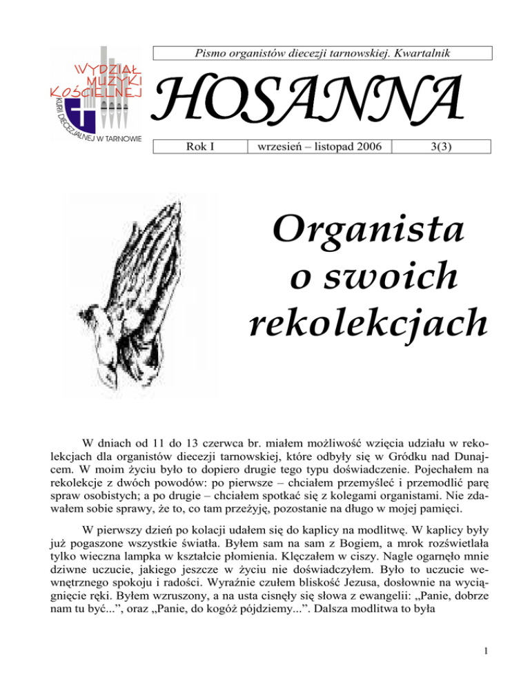 Pismo organistów diecezji tarnowskiej. Kwartalnik HOSANNA Rok I wrzesień – listopad 2006 3(3) Organista o swoich rekolekcjach W dniach od 11 do 13 czerwca br. miałem moŜliwość wzięcia udziału w rekolekcjach dla organistów diecezji tarnowskiej, które odbyły się w Gródku nad Dunajcem. W moim Ŝyciu było to dopiero drugie tego typu doświadczenie. Pojechałem na rekolekcje z dwóch powodów: po pierwsze – chciałem przemyśleć i przemodlić parę spraw osobistych; a po drugie – chciałem spotkać się z kolegami organistami. Nie zdawałem sobie sprawy, Ŝe to, co tam przeŜyję, pozostanie na długo w mojej pamięci. W pierwszy dzień po kolacji udałem się do kaplicy na modlitwę. W kaplicy były juŜ pogaszone wszystkie światła. Byłem sam na sam z Bogiem, a mrok rozświetlała tylko wieczna lampka w kształcie płomienia. Klęczałem w ciszy. Nagle ogarnęło mnie dziwne uczucie, jakiego jeszcze w Ŝyciu nie doświadczyłem. Było to uczucie wewnętrznego spokoju i radości. Wyraźnie czułem bliskość Jezusa, dosłownie na wyciągnięcie ręki. Byłem wzruszony, a na usta cisnęły się słowa z ewangelii: „Panie, dobrze nam tu być...”, oraz „Panie, do kogóŜ pójdziemy...”. Dalsza modlitwa to była 1 * W dniach od 11-13 VI br. w Gródku nad Dunajcem odbyły się rekolekcje dla organistów. Uczestniczyło w nich 96 organistów z naszej diecezji (25%). Choć jest to grupa duŜa, to jednak niepokoi fakt, dlaczego pozostali organiści w tego typu ćwiczeniach nie uczestniczą. Zaledwie kilku z nich poinformowało Wydział o niemoŜności uczestniczenia w nich. NaleŜy pamiętać, Ŝe udział w tego typu ćwiczeniach jest dla kaŜdego organisty obowiązkiem. *** * II Festiwal Chórów Diecezji Tarnowskiej odbędzie się 23 IX 2006 r. MoŜna jeszcze się zgłaszać do 9 IX br. w Wydziale Muzyki Kościelnej (szczegółowe informacje i kontakt: patrz stopka redakcyjna). *** * Trwają jeszcze zapisy do Diecezjalnego Studium Organistowskiego na rok szkolny 2006/7. Dokumenty wymagane od kandydata ubiegającego się o przyjęcia do studium są następujące: podanie, Ŝyciorys, ostatnie świadectwo ze szkoły ogólnokształcącej, świadectwo wykształcenia muz. (jeśli takie posiada), ostatnie świadectwo religii, opinia proboszcza o kandydacie, dwie fotografie. Dokumenty naleŜy składać w Diecezjalnym Studium Organistowskim lub w Wydziale Muzyki Kościelnej Kurii Diecezjalnej w Tarnowie jeszcze do 20 września br. – w miarę wolnych miejsc. (xgp) 2 naprawdę rozmowa z Bogiem. Rozmawiałem tak, jak się rozmawia z kimś bliskim, z kimś, kto zawsze wysłucha, nigdy nie zawiedzie. Miałem wraŜenie, jakby czas nagle stanął dla mnie w miejscu. Tego, czego doświadczyłem, tak dokładnie nie da się opisać. Tego trzeba samemu doświadczyć. W takiej ciszy przyszło mi odpowiedzieć na pytania postawione samemu sobie. Uświadomiłem sobie, jak wiele rzeczy zawdzięczam Bogu i ludziom, których Bóg postawił na drodze mego Ŝycia. Mam na myśli rodziców, rodzinę, nauczycieli, profesorów i kapłanów. Jedynie modlitwą mogę im wynagrodzić NajwaŜniejsze jednak całe dobro. Uwajest to, aby na rekoŜam, Ŝe czas relekcjach spotkać Bokolekcji nie jest ga. Ja miałem to czasem zmarnoszczęście. wanym. Wielu moich kolegów „po fachu” nie znalazło czasu, by przyjechać na te ćwiczenia duchowe. A jest to przecieŜ bardzo cenny dar dany nam przez Pana Boga. MoŜna bowiem było bardzo skorzystać w sprawach duchowych i nie tylko. Rekolekcje te były tak pomyślane, aby człowiek mógł pogłębić swoje Ŝycie duchowe, oraz uzupełnić lub przypomnieć sobie wiedzę z zakresu profesji, którą pełni w swojej parafii. NajwaŜniejsze jednak jest to, aby na rekolekcjach spotkać Boga. Ja miałem to szczęście. Organista Marek Posługa organisty jako powołanie (cz. III) Organiście musi zawsze towarzyszyć świadomość, Ŝe przez swoją grę podczas liturgii jest takŜe przekazicielem prawd wiary. Willibald Bezler zauwaŜa, Ŝe głównym aspektem towarzyszenia organowego do pieśni religijnych jest rozbrzmiewający na róŜne sposoby muzyczny motyw Chrystusa Odkupiciela. Motyw ten nawiązuje nie tylko do obrazu pustego grobu i objawienia Zmartwychwstałego Pana, lecz czyni zmartwychwstanie sensem teraźniejszości. W takim mistycznym sensie ma swój szczególny udział w obwieszczaniu Chrystusowego orędzia takŜe sam organista1. Jednym z problemów dzisiejszej muzyki liturgicznej jest wciąŜ niedostateczna liczba organistów zakorzenionych w doświadczeniu wiary i wspólnoty Kościoła. Liturgiczna gra organowa powinna być bowiem pojmowana – jak zauwaŜa Wolfgang Bretschneider – jako „dźwiękowa mowa”, jako profetyczne świadectwo, przepowiadanie Słowa, a równocześnie odpowiedź wspólnoty na to Słowo – tu i teraz, a nie jako prezentacja wyizolowanych z kontekstu liturgicznego dźwięków skupiających uwagę tylko i wyłącznie na swej warstwie brzmieniowej2. Charakter słuŜebny posługi organisty wskazuje na kolejny element jego posłannictwa. Skoro muzyka jest słuŜebnicą (zob. IP 23) i jest tym świętsza, im ściślej zwiąŜe się z czynnością liturgiczną, juŜ to serdeczniej wyraŜając modlitwę, juŜ teŜ przyczyniając się do jednomyślności, juŜ wreszcie nadając uroczysty charakter obrzędom świętym (KL 112), naleŜy postawić pytanie: co jest tym czynnikiem lub kryterium pozwalającym organiście odróŜnić muzykę sakralną od świeckiej, muzykę odznaczającą się świętością i doskonałością formy (zob. MS 4) od tej, która z liturgią nie ma wiele wspólnego poza często samym tylko tytułem? Jeśli chodzi o tekst, nie ma tutaj większych wątpliwości. Sobór wyraźnie stwierdził, iŜ przeznaczone do śpiewów kościelnych teksty powinny się zgadzać z nauką katolicką. NaleŜy je czerpać przede wszystkim z Pisma świętego i źródeł liturgicznych (KL 121). Większych trudności nastręcza strona 