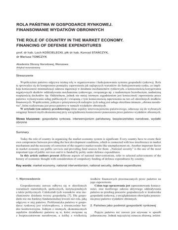 ROLA PAŃSTWA W GOSPODARCE RYNKOWEJ. FINANSOWANIE WYDATKÓW OBRONNYCH THE ROLE OF COUNTRY IN THE MARKET ECONOMY. FINANCING OF DEFENSE EXPENDITURES prof. dr hab. Lech KOŚCIELECKI, płk dr hab. Konrad STAŃCZYK, dr Mariusz TOMCZYK Akademia Obrony Narodowej, Warszawa Artykuł recenzowany Streszczenie Współcześnie państwo odgrywa istotną rolę w organizowaniu i funkcjonowaniu systemu gospodarki rynkowej. Rola ta sprowadza się do kompromisu pomiędzy zapewnieniu jak najlepszych warunków do funkcjonowania rynku, co implikuje konieczność minimalizacji zakresu ingerencji w działanie mechanizmów rynkowych, a koniecznością korygowania negatywnych skutków oddziaływania mechanizmu rynkowego, związanego np. z nadmiernym bezrobociem, nadmierną rozpiętością dochodów itp. Oddzielnym, jednak nie mniej istotnym zagadnieniem jest konieczność zapewnienia przez państwo wykonywania usług publicznych i związaną z tym koniecznością zapewnienia na ten cel określonych środków finansowych. Współcześnie, jednym z priorytetowych rodzajów tych usług jest usługa określana mianem „obrona narodowa”, która realizowana jest przez państwo w ramach wydatków obronnych. W artykule tym autorzy przedstawiają różne aspekty interwencjonizmu państwowego, odnosząc się do wybranych osiągnięć historii myśli ekonomicznej przy uwzględnieniu konieczności ponoszenia przez państwo wydatków obronnych. Słowa kluczowe: gospodarka rynkowa, interwencjonizm państwowy, bezpieczeństwo narodowe, wydatki obronne Summary Today the role of country in organising the market economy system is significant. Every country have to create their own compromise between providing the best development conditions, which is connected with less interference in market mechanism and the necessity of correction of the negative market results like unemployment etc. Another important factor in market economy are public services and providing fund sources for them. „National security” is the one of the most important type of public services and it is funded by polity under defence expenditures. In this article authors present different aspects of national interventionism, refer to selected achievements of the history of economic thought with consideration of compulsory funding of defence expenditures by country. Key words: market economy, national interventionism, national security, defense expenditures 1. Wprowadzenie Gospodarowanie zawsze odbywa się w określonych warunkach materialnych, społecznych, instytucjonalnych a także politycznych. Całokształt tych warunków oraz mechanizmów działania tworzy gospodarkę [7]. Dla gospodarki nie ma bardziej fundamentalnej kwestii niż rola, jaką odgrywa w niej państwo. Problematyka państwa w gospodarce rynkowej jest wielowątkowa, a równocześnie bardzo kontrowersyjna. Jednym z istotnych, ekonomicznych aspektów działalności państwa są te, które związane są z bezpieczeństwem narodowym, a ściślej z wielkością środków finansowych przeznaczanych przez państwo na jego zapewnienie. Celem tego opracowania jest zaprezentowanie konieczności, oraz możliwego zakresu aktywnego oddziaływania państwa na przebieg procesów gospodarczych w środowisku gospodarki rynkowej, z uwzględnieniem obowiązku ponoszenia przez państwo wydatków obronnych. 2. Państwo jako podmiot gospodarki rynkowej Pojęcie państwa nie zawsze jest używane w sposób jednoznaczny. Jednak najczęściej oznacza złożoną, zróżni- PROBLEMY OBRONNOŚCI PAŃSTWA cowaną wewnętrznie, wieloszczeblową strukturę administracyjną społeczeństwa zamieszkującego określone terytorium, dysponującą władzą ustawodawczą, wykonawczą i sądowniczą [7]. Inna definicja, akcentuje to, iż państwo jest formą organizacji społeczeństwa globalnego, które jest związane terytorialnie i hierarchicznie oraz pełni wyznaczone przez stopień rozwoju społecznego funkcje. Powszechnie przyjęło się określać państwo, mając na myśli centralne oraz lokalne instytucje i urzędy publiczne, których działalność związana jest z funkcjonowaniem danego systemu społeczno-gospodarczego. Wydaje się słusznym stwierdzenie, że państwo musi odgrywać istotną rolę w zorganizowanym społeczeństwie, które z kolei potrzebuje rządu. Kluczowym pozostaje pytanie o zakres roli państwa w gospodarkę. Stosunek państwa do gospodarki jest kształtowany przez różne przyczyny, ma różny zasięg i formę. Sprawia, że jego charakterystyka może być dokonywana z różnych punktów widzenia. Bierność państwa w określonej sferze stosunków gospodarczych jest nie tyle dowodem braku interesu państwa do ingerowania w sprawy gospodarcze, co wyrazem świadomie przyjętej postawy. Problem polega na znalezieniu optymalnego poziomu interwencji państwa w gospodarce rynkowej, usytuowanego pomiędzy dwiema skrajnościami: gospodarką centralnie planowaną, w której wszystkie istotne decyzje gospodarcze należały do państwa, a zalecanym przez Adama Smitha leseferyzmem, który ograniczał rolę państwa do kilku podstawowych funkcji [15]. Analiza historii gospodarczej świata dowodzi, iż żaden inny system gospodarczy nie zapewnił nigdy tak spektakularnego rozwoju gospodarczego oraz wzrostu dobrobytu, jaki stał się udziałem społeczeństw opierających swe życie gospodarcze na solidnych podstawach systemu rynkowego. Główną zaletą systemu rynkowego opartego na prywatnej własności, wolności gospodarczej i konkurencji, jest jego efektywność. Jednak wbrew powszechnie panującej opinii współczesne rozwiązania gospodarcze oparte o model gospodarki rynkowej nie są pozbawione wad. Rozwarstwienie społeczne, przejawiające się występowaniem bardzo bogatych i skrajnie biednych, występowanie tzw. efektów zewnętrznych (np. zanieczyszczenie środowiska, hałas, tłok), wysoka konkurencja, która może sprzyjać rozwojowi społecznie niepożądanych dóbr, skłonność do proliferacji 