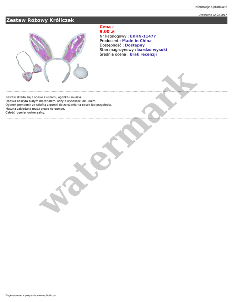 Informacje o produkcie Utworzono 02-03-2017 Zestaw Różowy Króliczek Cena : 9,00 zł er m ar k Nr katalogowy : EKHN-11477 Producent : Made in China Dostępność : Dostępny Stan magazynowy : bardzo wysoki Średnia ocena : brak recenzji w at Zestaw składa się z opaski z uszami, ogonka i muszki. Opaska obszyta białym materiałem, uszy o wysokości ok. 20cm. Ogonek pomponik ze szlufką z gumki do założenia na pasek lub przypięcia. Muszka zakładana przez głowę na gumce. Całość rozmiar uniwersalny. Wygenerowano w programie www.oscGold.com