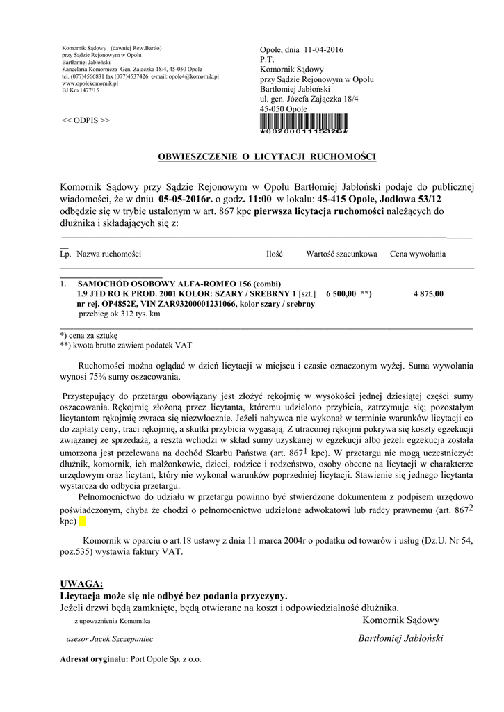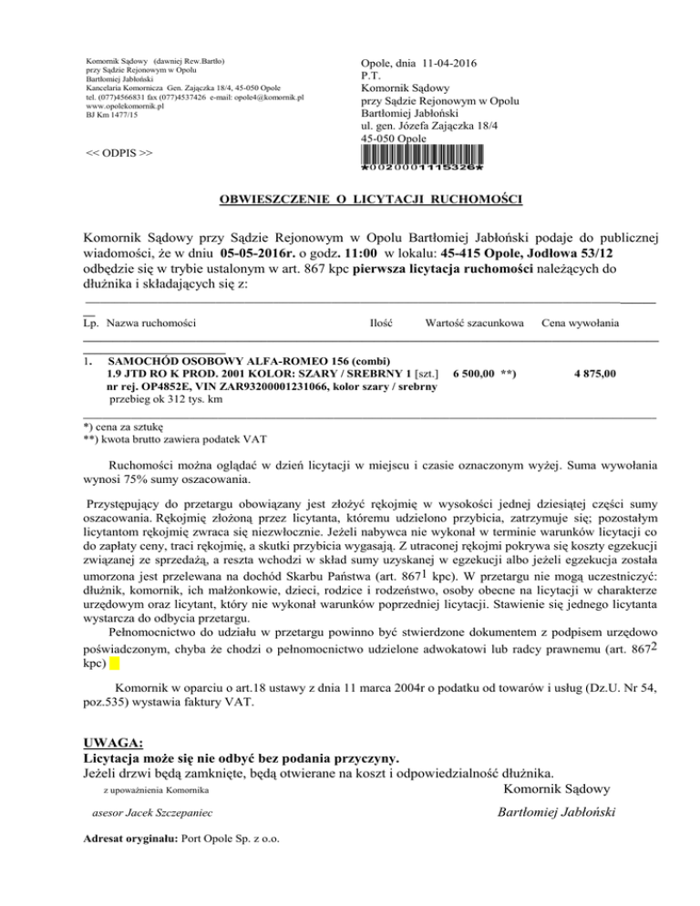 Komornik Sądowy (dawniej Rew.Bartło) przy Sądzie Rejonowym w Opolu Bartłomiej Jabłoński Kancelaria Komornicza Gen. Zajączka 18/4, 45-050 Opole tel. (077)4566831 fax (077)4537426 e-mail: [email protected] www.opolekomornik.pl BJ Km 1477/15 Opole, dnia 11-04-2016 P.T. Komornik Sądowy przy Sądzie Rejonowym w Opolu Bartłomiej Jabłoński ul. gen. Józefa Zajączka 18/4 45-050 Opole << ODPIS >> *0020001115326* OBWIESZCZENIE O LICYTACJI RUCHOMOŚCI Komornik Sądowy przy Sądzie Rejonowym w Opolu Bartłomiej Jabłoński podaje do publicznej wiadomości, że w dniu 05-05-2016r. o godz. 11:00 w lokalu: 45-415 Opole, Jodłowa 53/12 odbędzie się w trybie ustalonym w art. 867 kpc pierwsza licytacja ruchomości należących do dłużnika i składających się z: _____________________________________________________________________________________________________________________ __ Lp. Nazwa ruchomości Ilość Wartość szacunkowa Cena wywołania _________________________________________________________________________________________________ ________________________ 1. SAMOCHÓD OSOBOWY ALFA-ROMEO 156 (combi) 1.9 JTD RO K PROD. 2001 KOLOR: SZARY / SREBRNY 1 [szt.] 6 500,00 **) 4 875,00 nr rej. OP4852E, VIN ZAR93200001231066, kolor szary / srebrny przebieg ok 312 tys. km _______________________________________________________________________________________________________________________ *) cena za sztukę **) kwota brutto zawiera podatek VAT Ruchomości można oglądać w dzień licytacji w miejscu i czasie oznaczonym wyżej. Suma wywołania wynosi 75% sumy oszacowania. Przystępujący do przetargu obowiązany jest złożyć rękojmię w wysokości jednej dziesiątej części sumy oszacowania. Rękojmię złożoną przez licytanta, któremu udzielono przybicia, zatrzymuje się; pozostałym licytantom rękojmię zwraca się niezwłocznie. Jeżeli nabywca nie wykonał w terminie warunków licytacji co do zapłaty ceny, traci rękojmię, a skutki przybicia wygasają. Z utraconej rękojmi pokrywa się koszty egzekucji związanej ze sprzedażą, a reszta wchodzi w skład sumy uzyskanej w egzekucji albo jeżeli egzekucja została umorzona jest przelewana na dochód Skarbu Państwa (art. 8671 kpc). W przetargu nie mogą uczestniczyć: dłużnik, komornik, ich małżonkowie, dzieci, rodzice i rodzeństwo, osoby obecne na licytacji w charakterze urzędowym oraz licytant, który nie wykonał warunków poprzedniej licytacji. Stawienie się jednego licytanta wystarcza do odbycia przetargu. Pełnomocnictwo do udziału w przetargu powinno być stwierdzone dokumentem z podpisem urzędowo poświadczonym, chyba że chodzi o pełnomocnictwo udzielone adwokatowi lub radcy prawnemu (art. 8672 kpc) Komornik w oparciu o art.18 ustawy z dnia 11 marca 2004r o podatku od towarów i usług (Dz.U. Nr 54, poz.535) wystawia faktury VAT. UWAGA: Licytacja może się nie odbyć bez podania przyczyny. Jeżeli drzwi będą zamknięte, będą otwierane na koszt i odpowiedzialność dłużnika. z upoważnienia Komornika Komornik Sądowy asesor Jacek Szczepaniec Adresat oryginału: Port Opole Sp. z o.o. Bartłomiej Jabłoński Do wiadomości: 1. Radca Prawny Maciej Panfil Kancelaria Prawnicza Maciej Panfil i Partnerzy sp. k., 02-017 Warszawa [K00000113597709] 2. Sąd Rejonowy W Opolu tablica ogłoszeń, 45-368 Opole 3. Navimor-Inwest S.A., 80-266 Gdańsk 4. Urząd Miasta Opola tablica ogłoszeń, 45-015 Opole 5. Komornik Sądowy przy Sądzie Rejonowym w Opolu Bartłomiej Jabłoński, 45-050 Opole 6. a/a